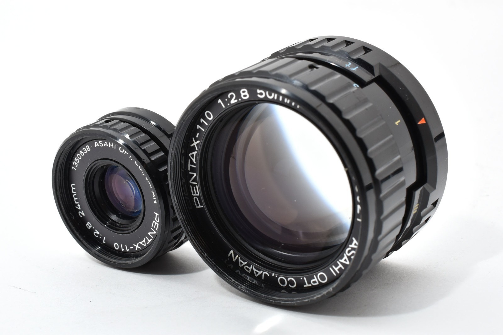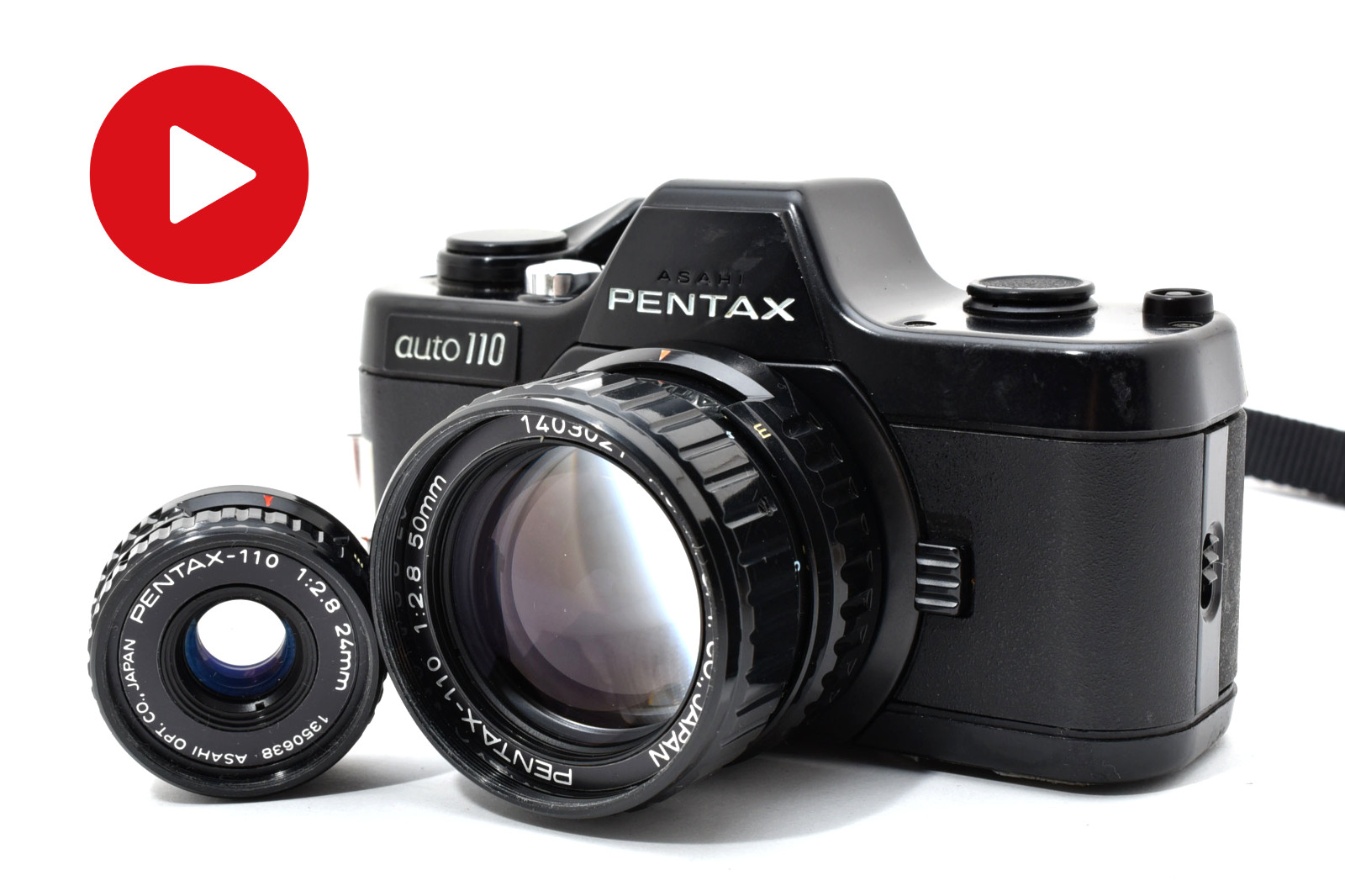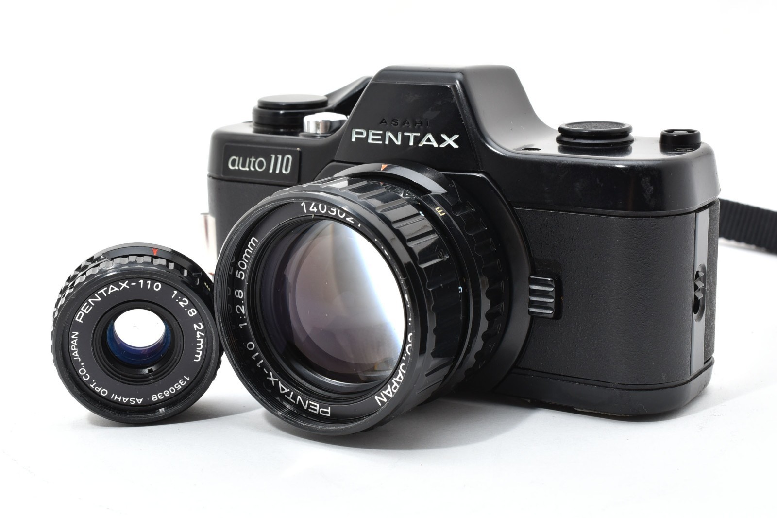 The Pentax Auto 110 is a marvel of miniaturization, holding the title of the world's smallest interchangeable-lens SLR system. This complete set includes the versatile 24mm standard lens and the 50mm telephoto lens, both featuring a fast f/2.8 aperture for beautiful depth of field. Designed for the 110 film format, it offers fully automatic programmed exposure in a body that fits in the palm of your hand. It is a unique masterpiece of Japanese engineering, combining professional SLR functionality with ultimate portability.