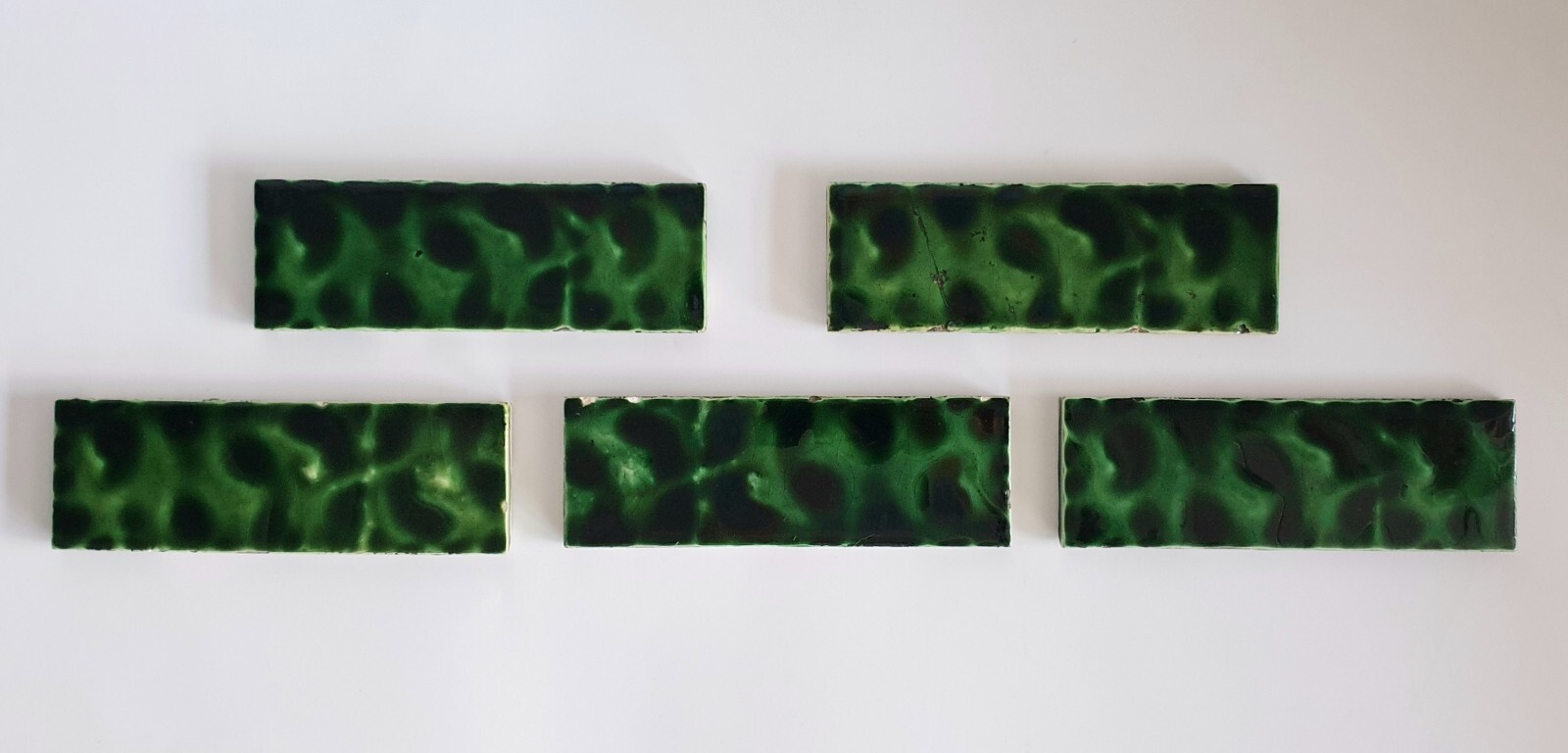 This is an extremely rare and finely crafted set of 5 spacer tiles with a strong decorative presence. Tiles of this quality were originally intended for fireplace surrounds or architectural schemes and are now highly sought after by collectors and for wall display.