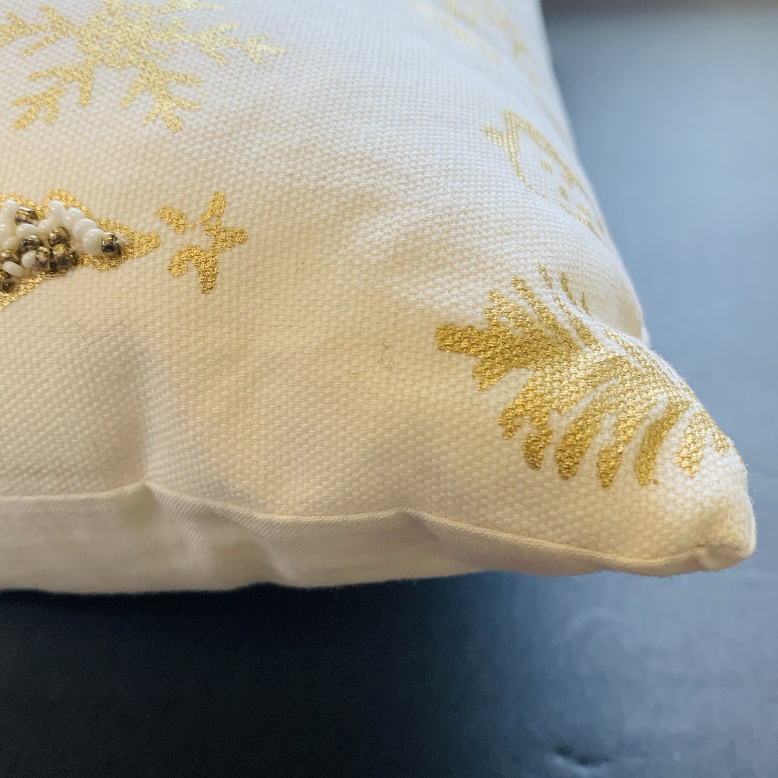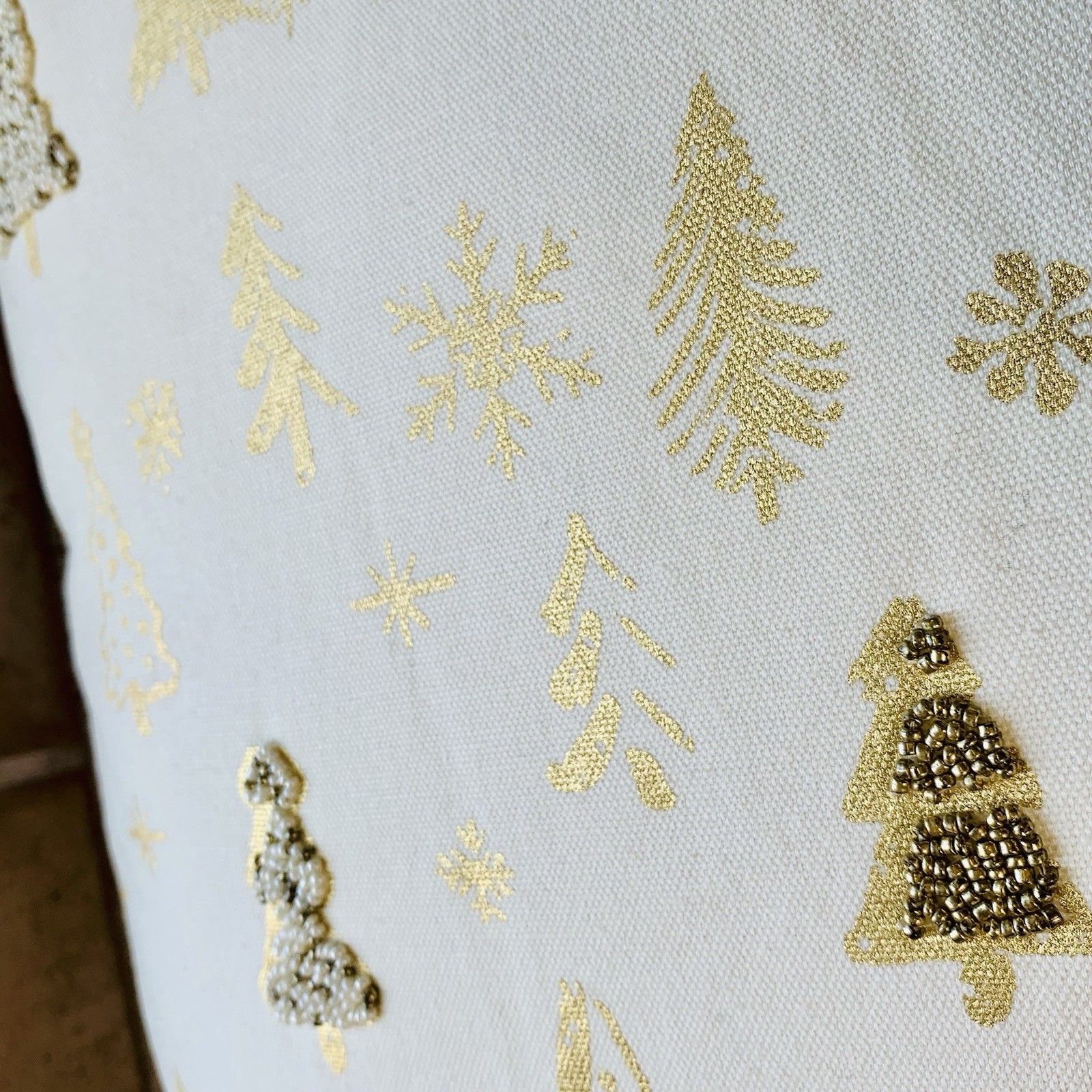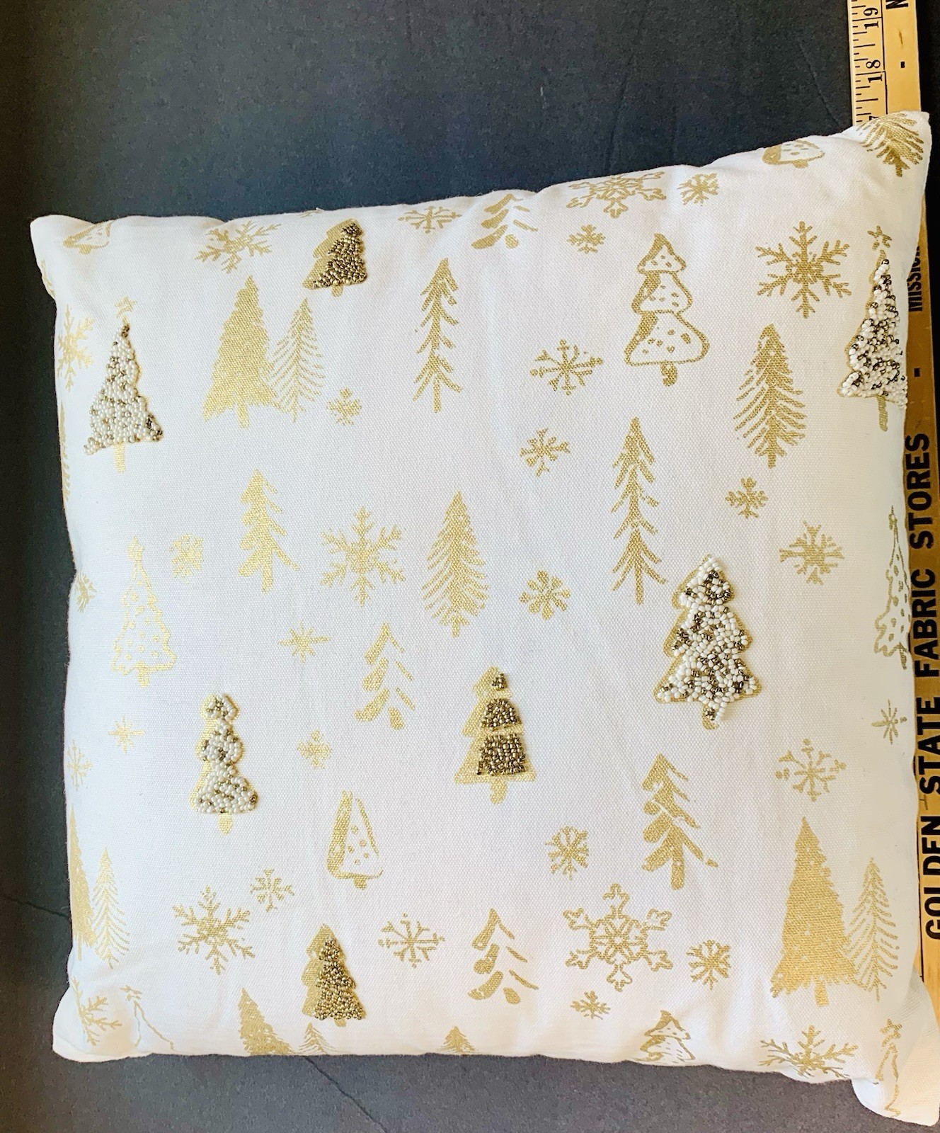 The Pier 1 Holiday Pillow is an egg white square throw pillow featuring embellished beads in white and gold, perfect for adding a touch of modern style to your holiday decor. The pillow showcases a Christmas tree pattern, making it a festive addition to your home during the festive season. Made of 100% cotton, this 15" x 15" pillow is designed with a zip closure for easy maintenance. Ideal for adults looking to spruce up their living space with a touch of Christmas cheer.
