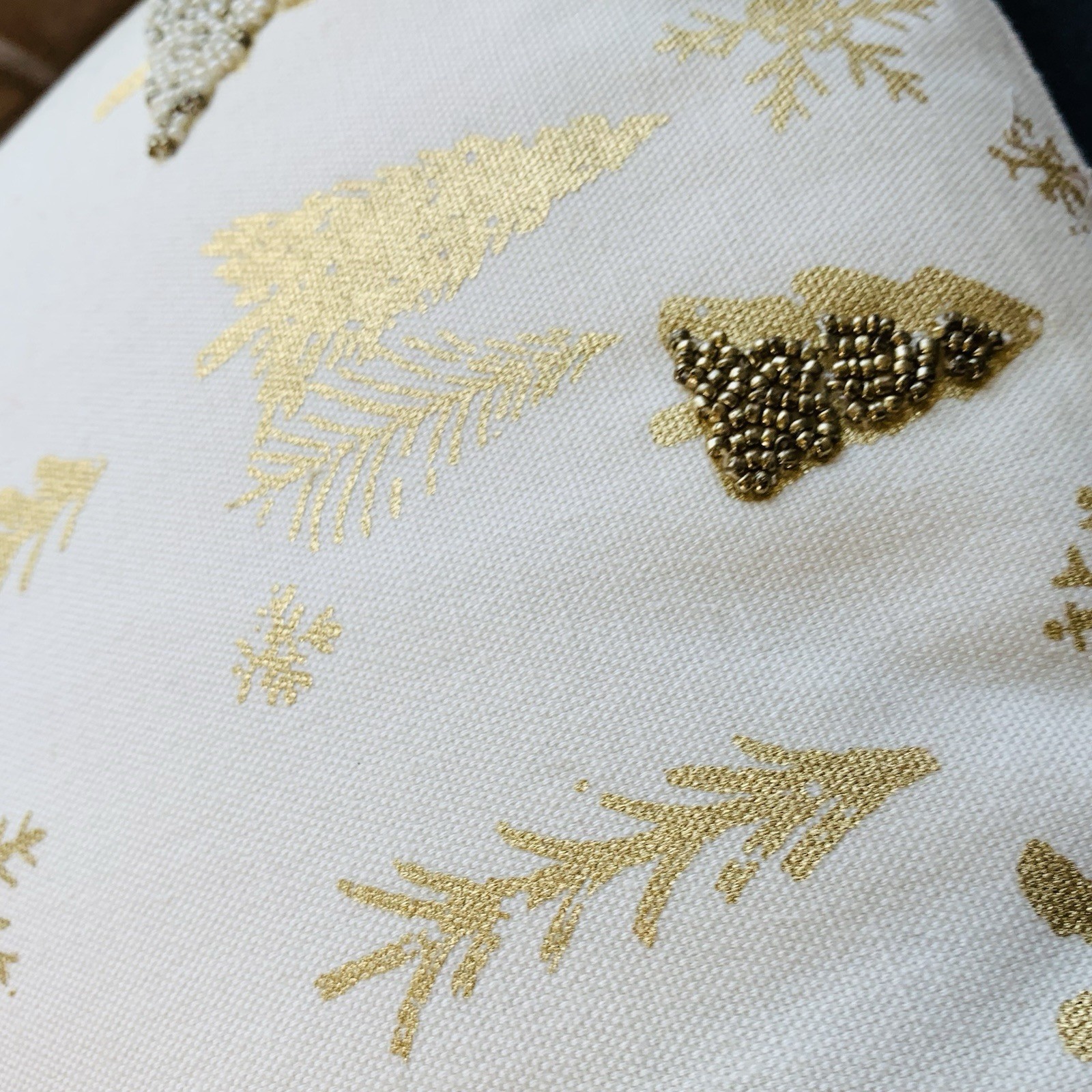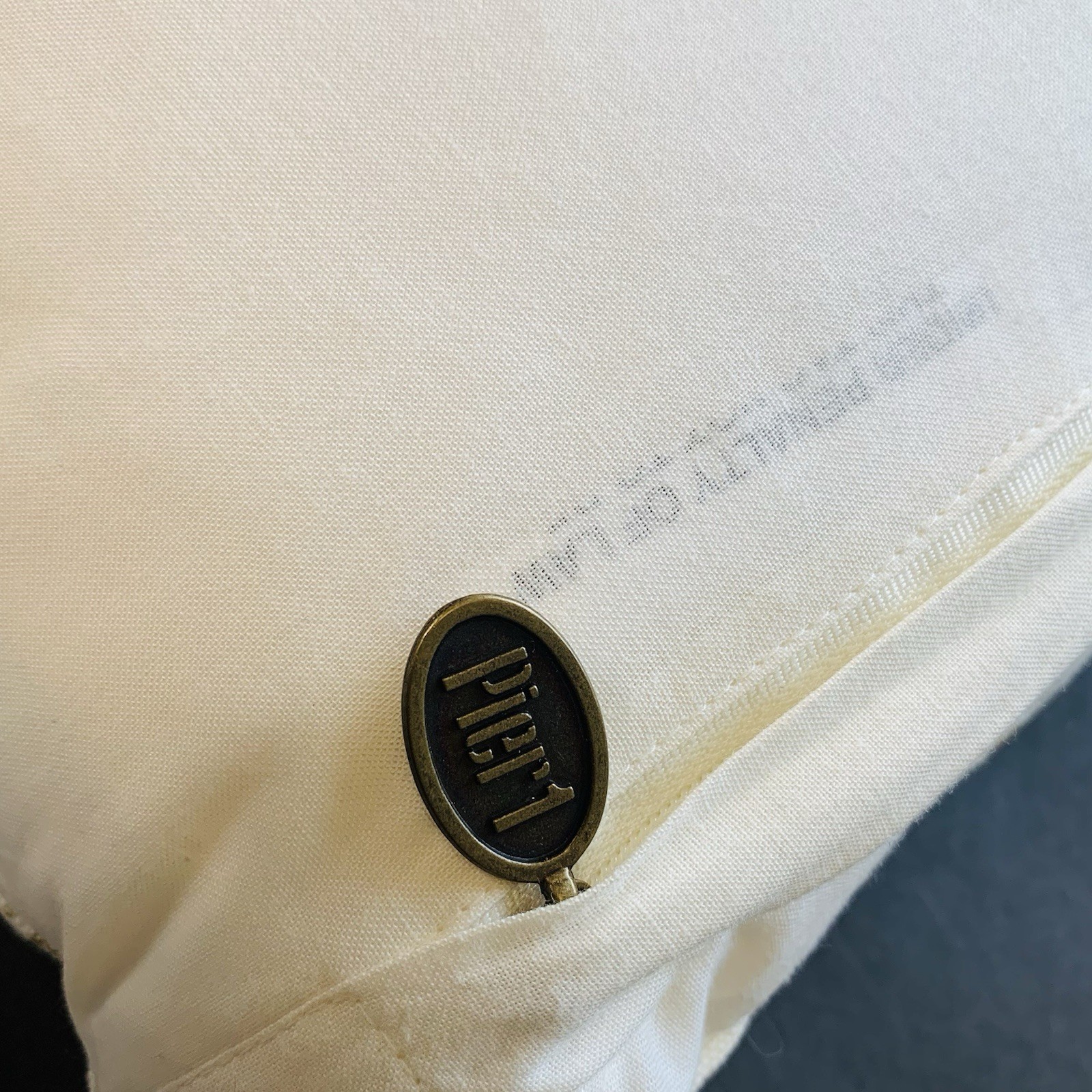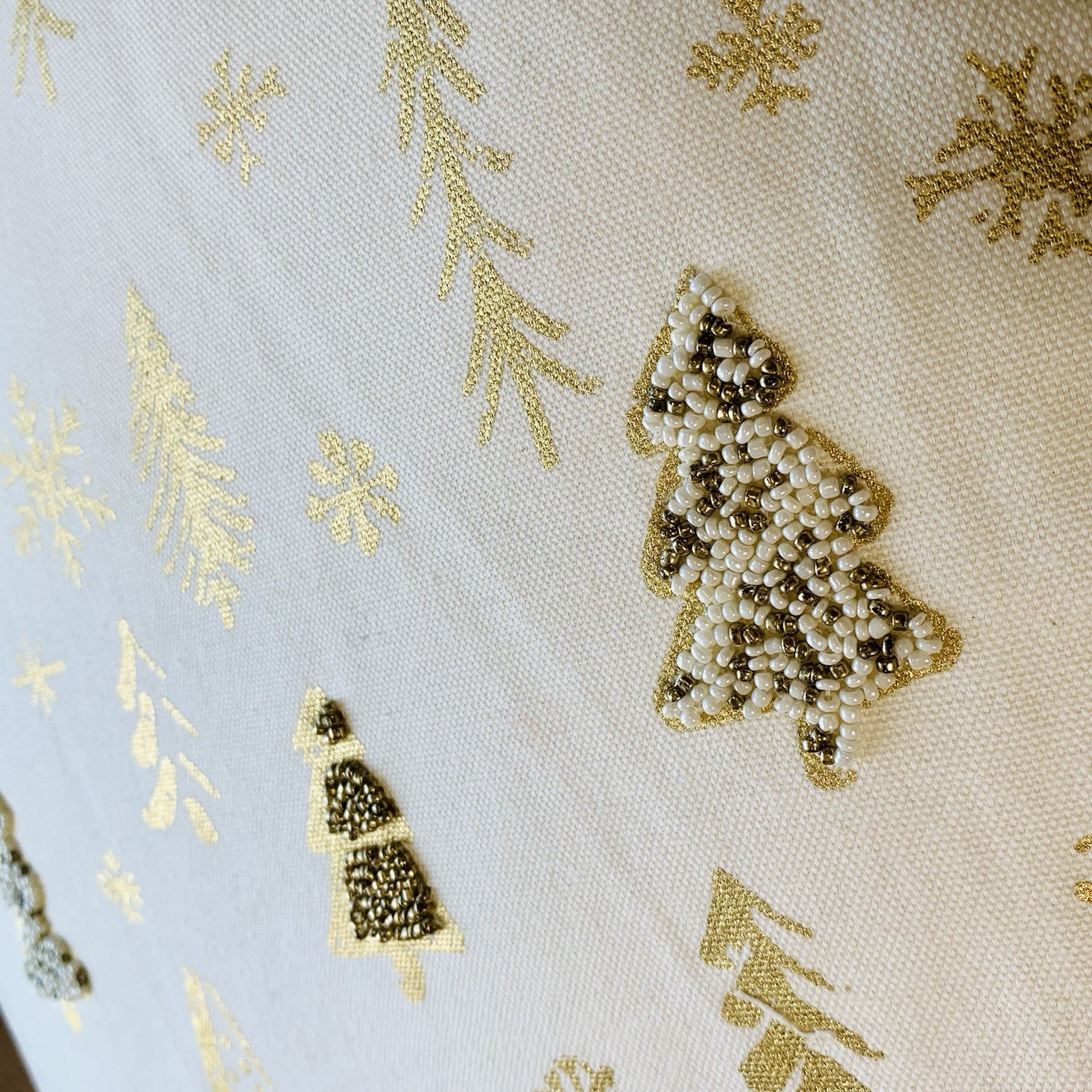 The Pier 1 Holiday Pillow is an egg white square throw pillow featuring embellished beads in white and gold, perfect for adding a touch of modern style to your holiday decor. The pillow showcases a Christmas tree pattern, making it a festive addition to your home during the festive season. Made of 100% cotton, this 15" x 15" pillow is designed with a zip closure for easy maintenance. Ideal for adults looking to spruce up their living space with a touch of Christmas cheer.