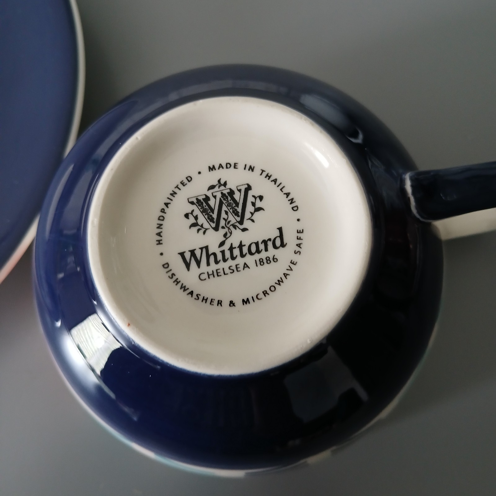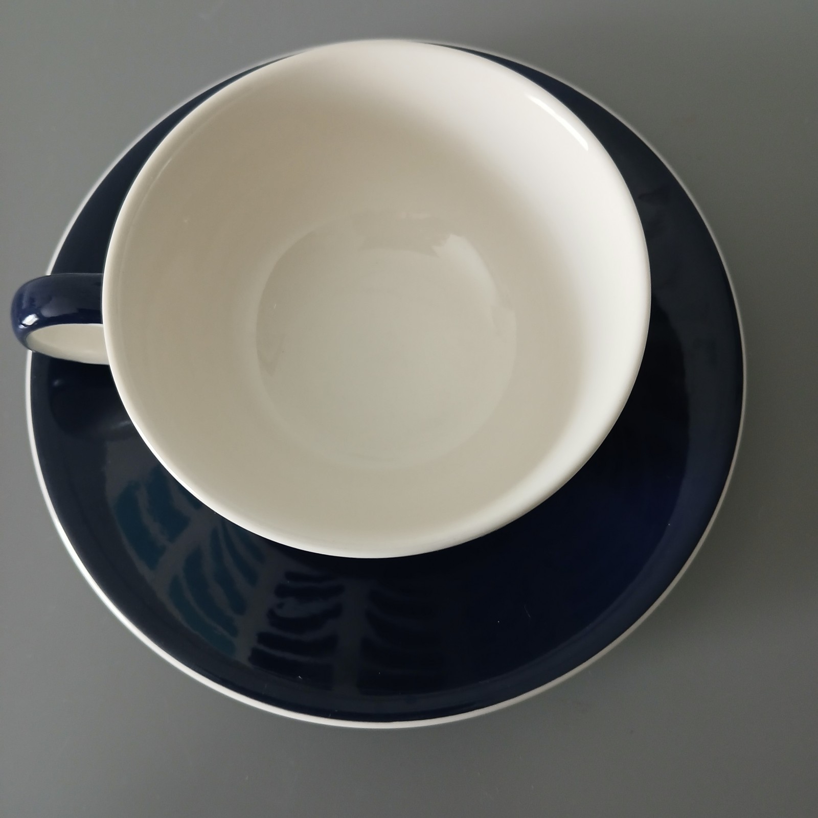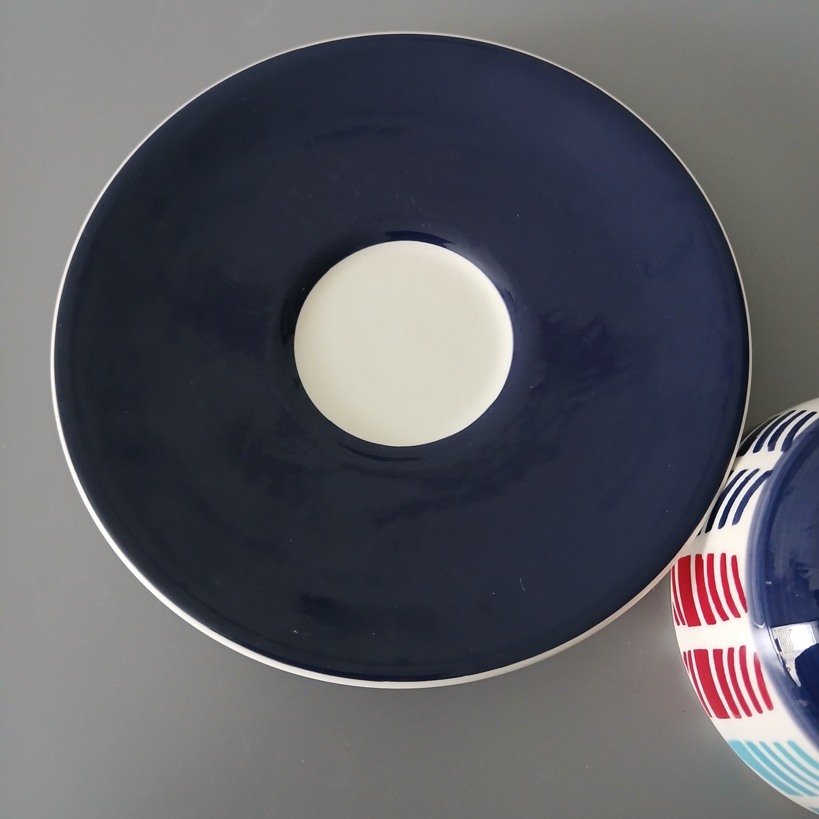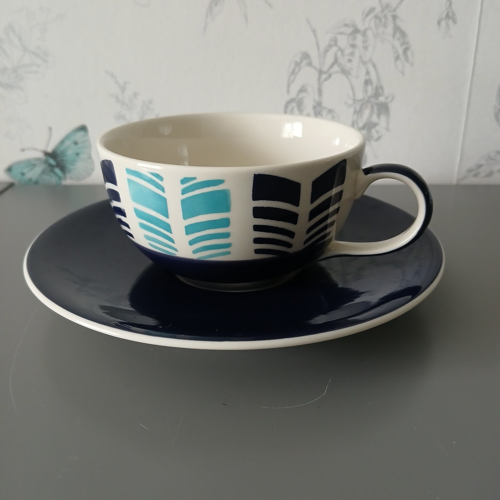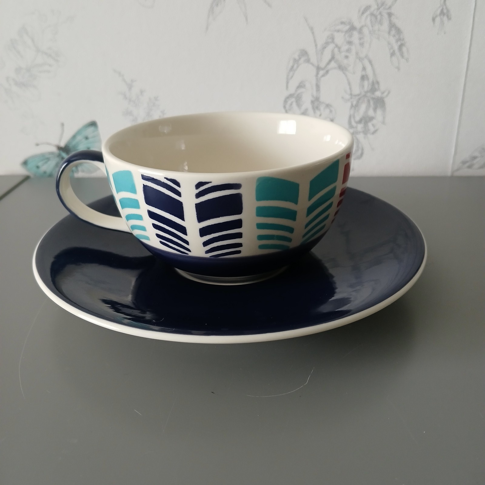 Very good condition - no chips or cracks Lovely chevron type pattern in blues and red. Navy saucer Cup measures 2.5" high and 4" diameter at rim Saucer measures 7" diameter B2
