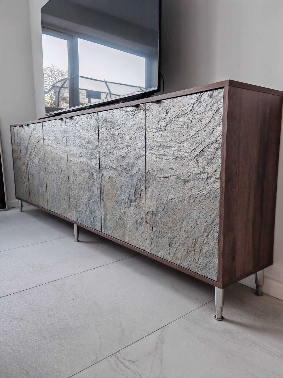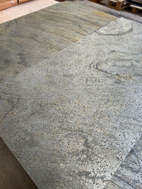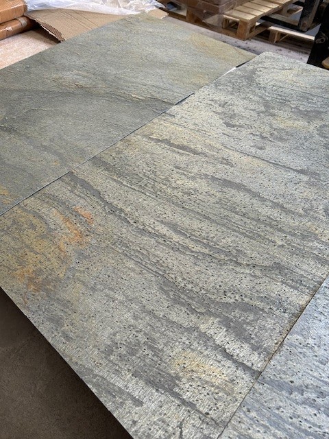 Verde Gris has a Green / Silver and Brown textured slate finish, it has a shine and sparkle in the material which makes it one of our most popular slate finishes. The colour and texture is natural and varied throughout, Verde Gris is captivating wherever it is placed. This material is suitable for internal and external walls, flooring, showers, furniture and door cladding.