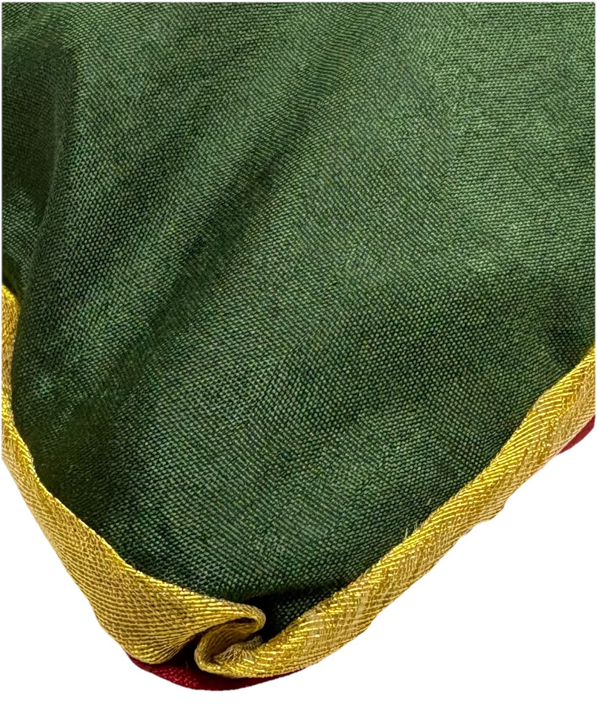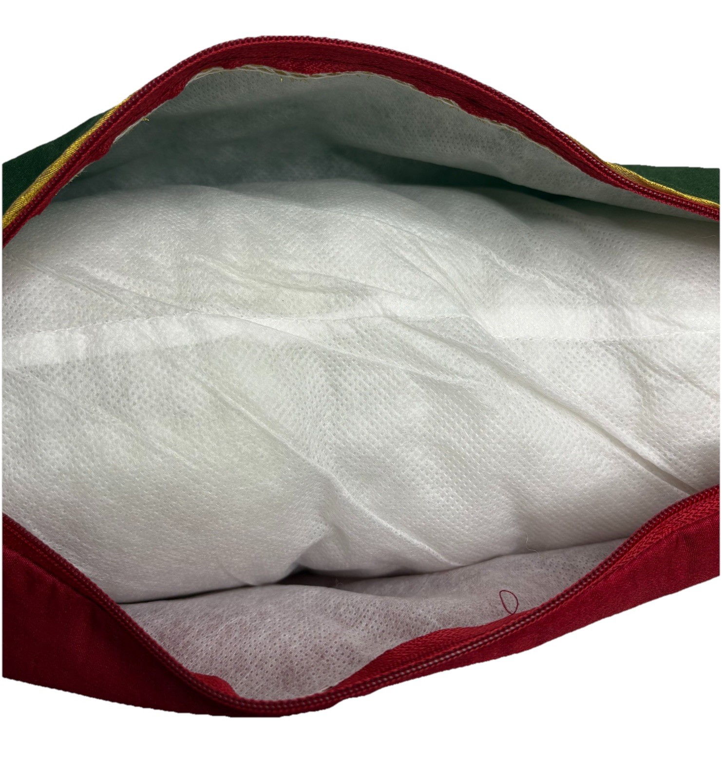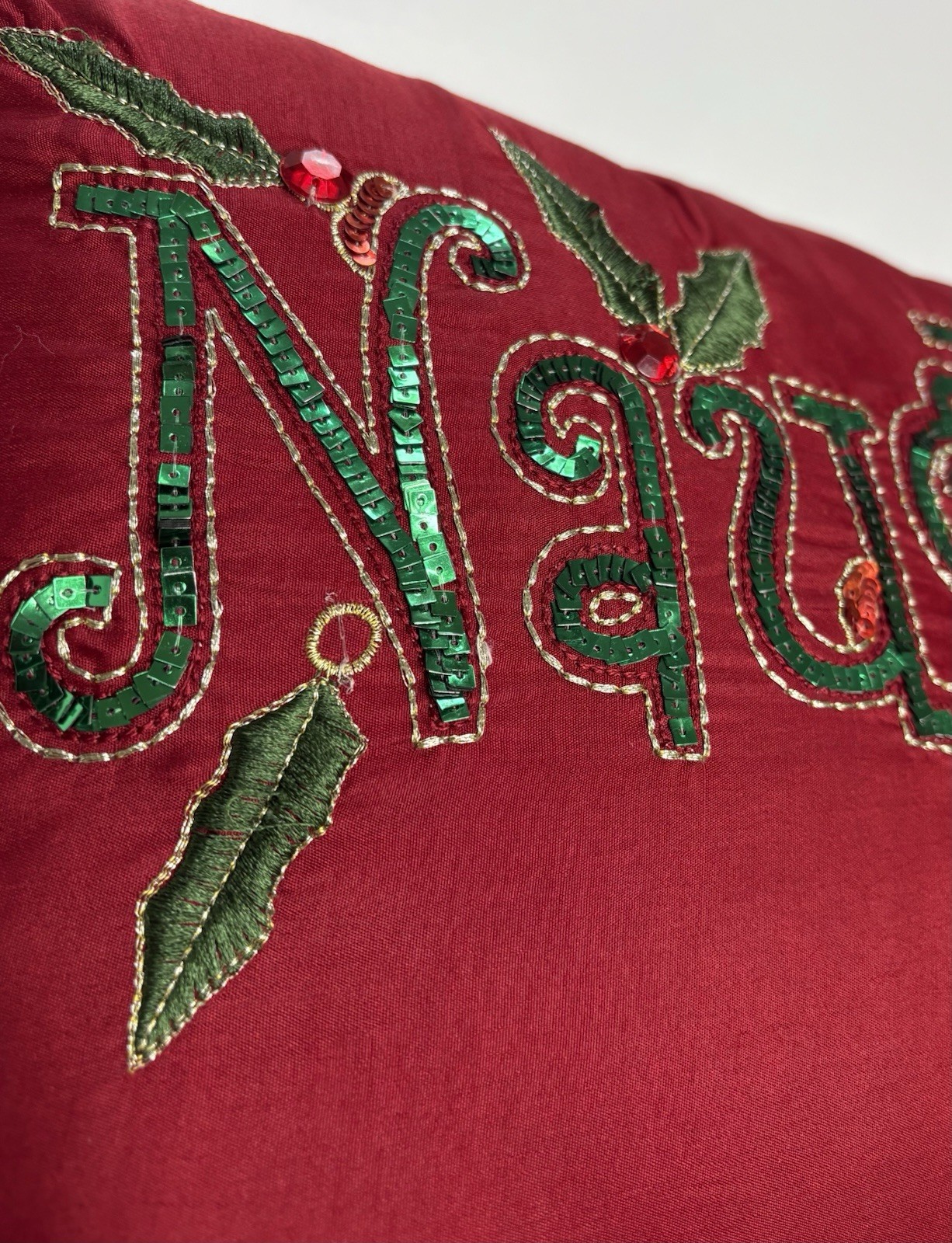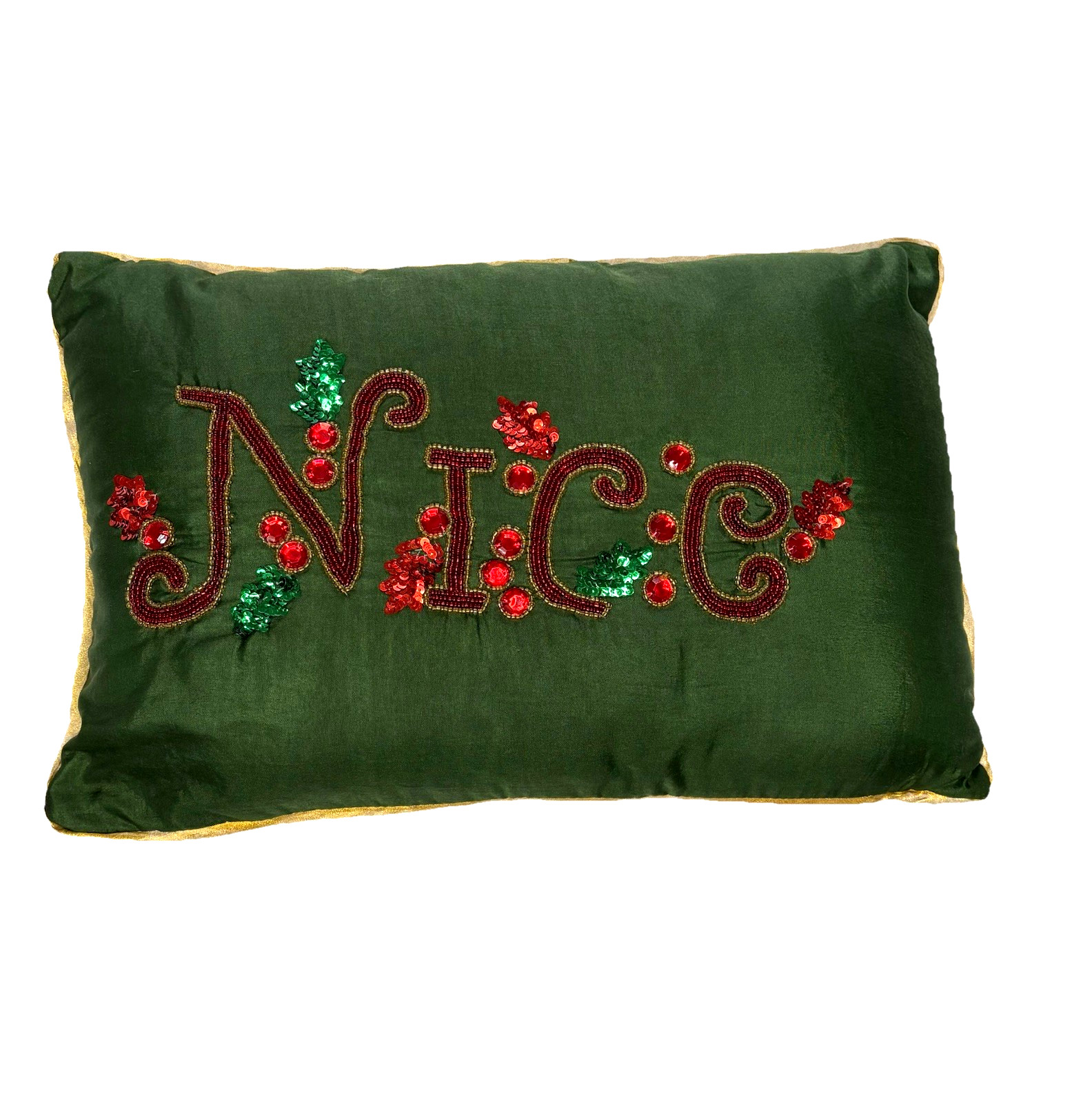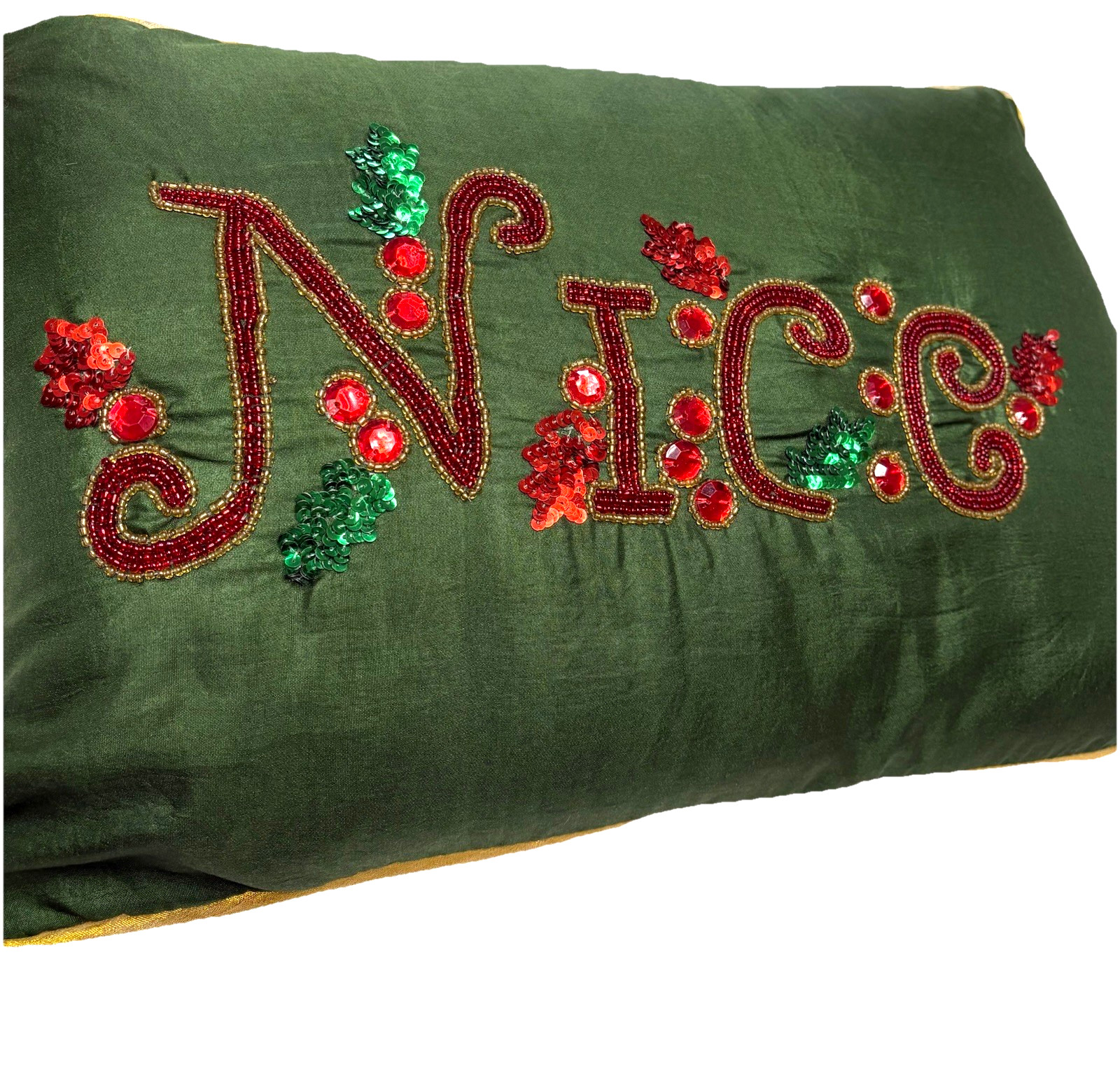 Two-sided pillow. Green Nice and Red Naughty. With gold trim around the middle, beautiful beads and sequins.