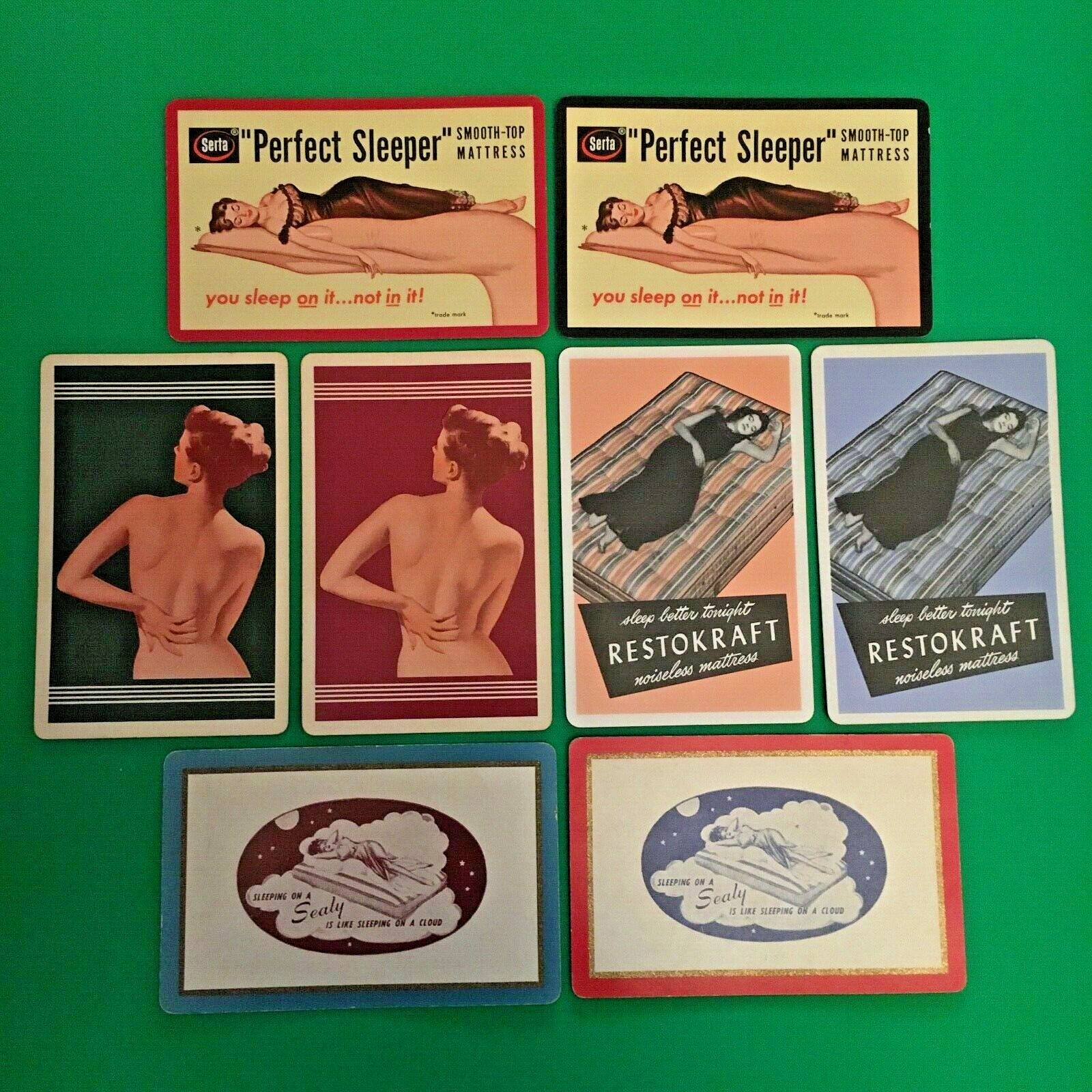 A set of (8) single MATTRESSES playing cards. Vintage 1950's, possibly earlier. The RESTOKRAFT cards are Congress cards, made in the USA. The nude woman (back pain) cards are for SEALY POSTUREPEDIC mattresses. The SEALY cards were made by Brown & Bigelow. Don't know who made the SERTA cards. All original and vintage. (These are SINGLE playing cards, NOT DECKS.) All of the cards are in EXCELLENT condition except for the SEALY (sleeping on cloud) cards which have some wear. Please check out the photo as it is considered part of the description. NICE!! Shipping is free in the USA. INTERNATIONAL SHIPPING is available to specified regions through the GLOBAL SHIPPING PROGRAM. Please check out my other listings for more fun stuff. Thanks for looking!