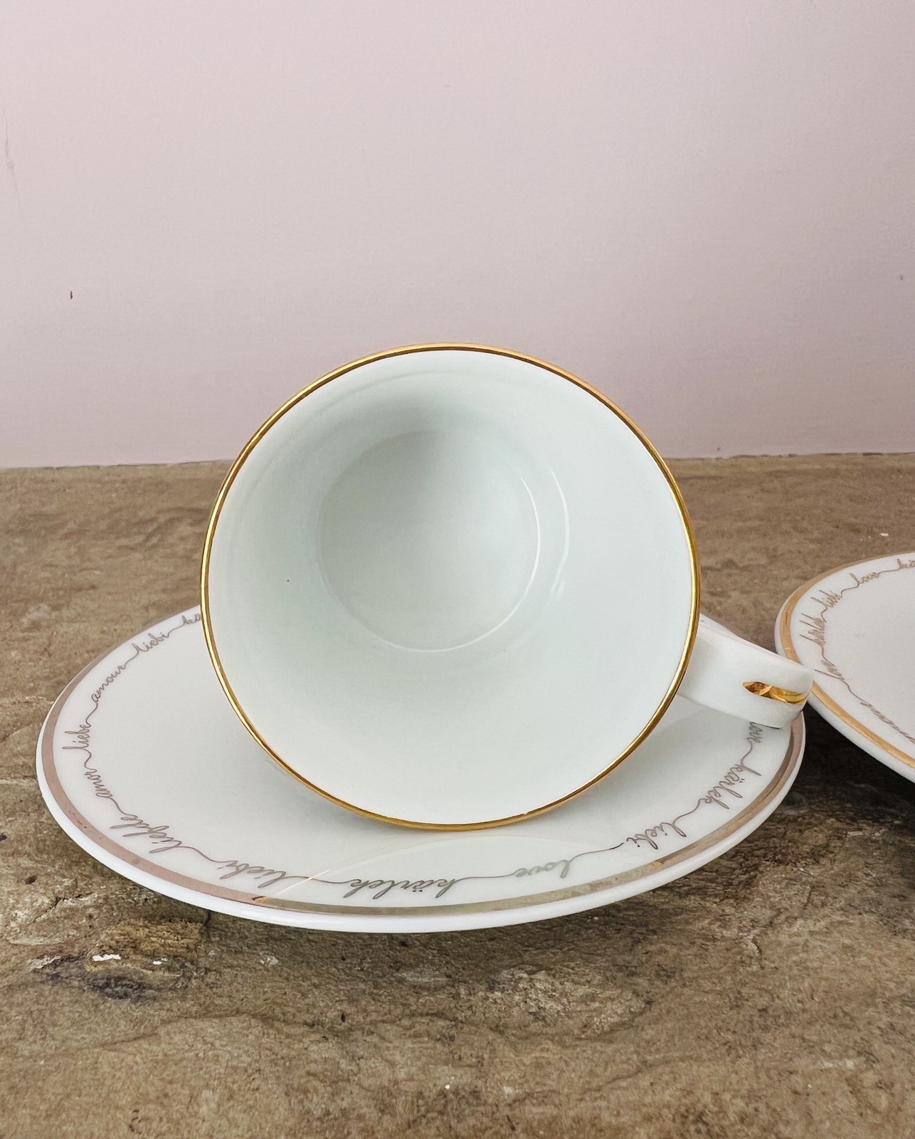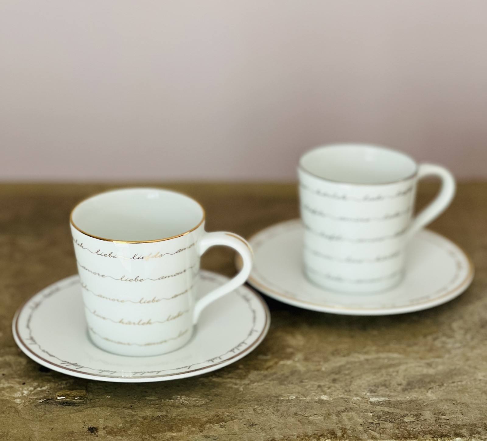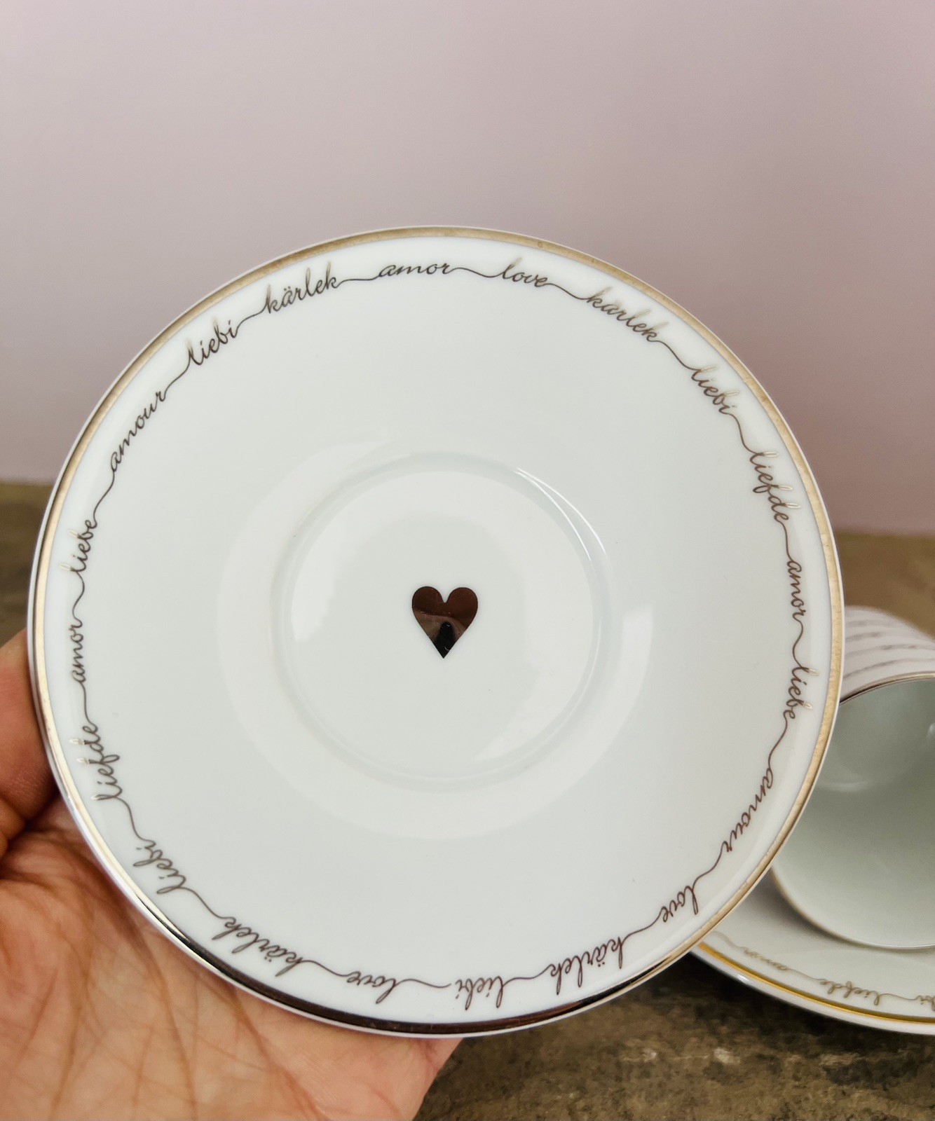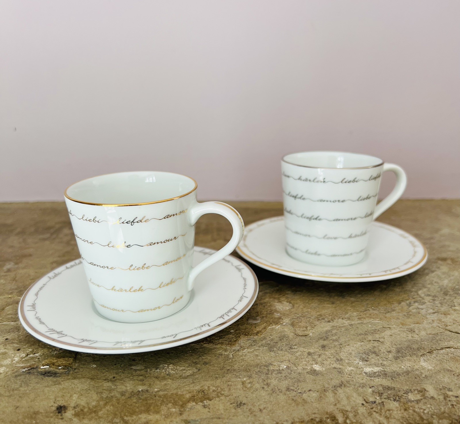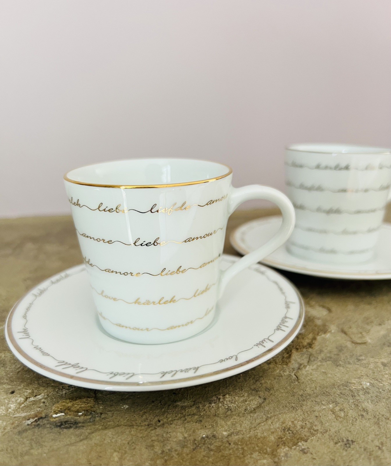 Beautiful porcelain espresso cup and saucer set with delicate gold rims and script design featuring the word “love” in multiple languages. Perfect for coffee lovers and collectors. Made in Portugal.