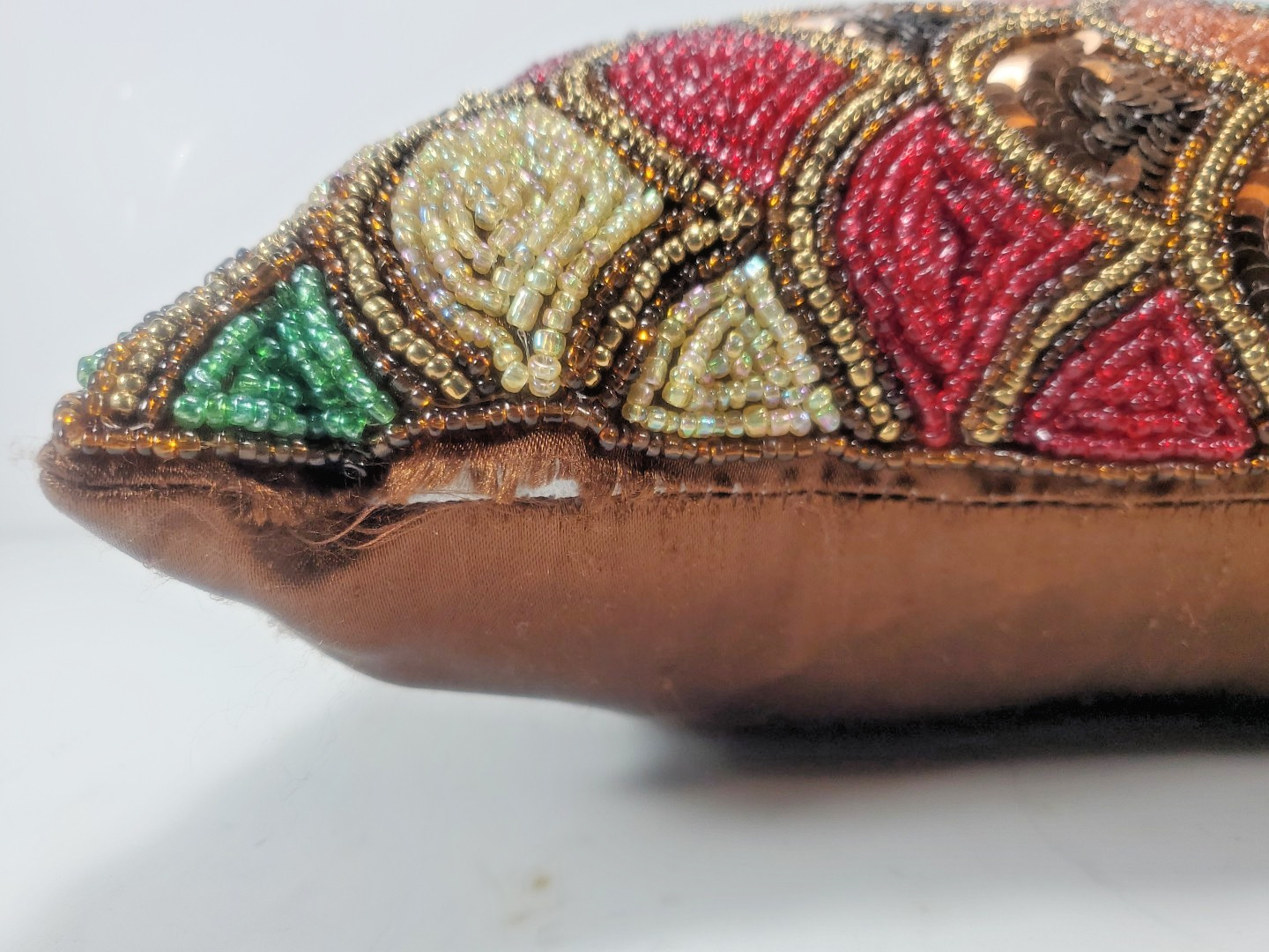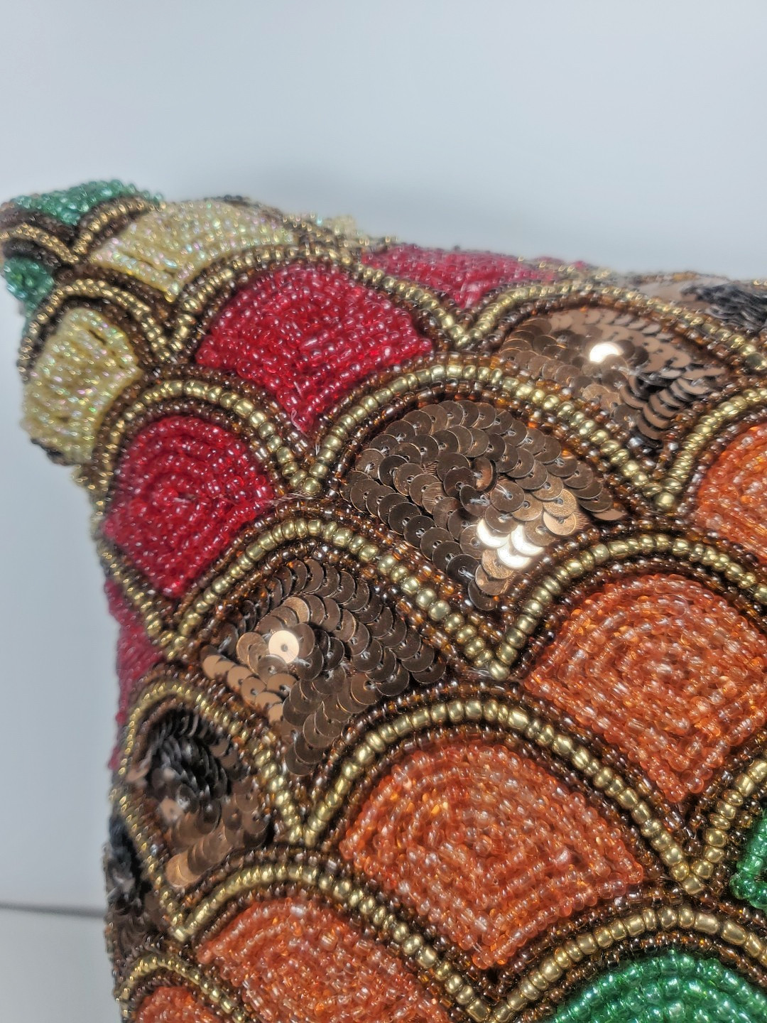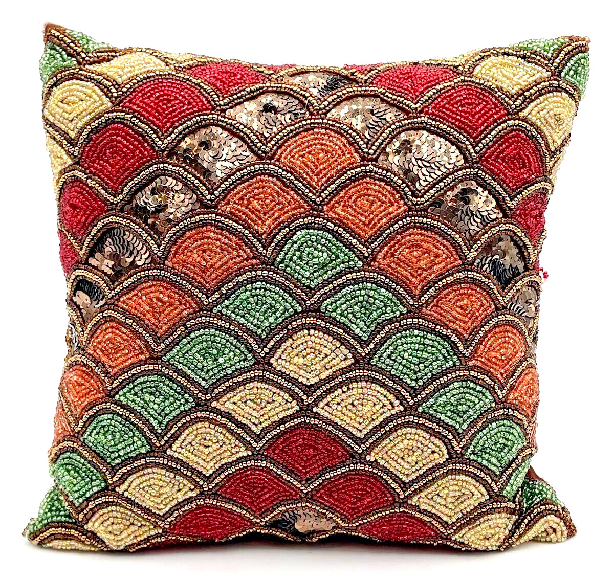 The Pier 1 One Sequin Beaded Decorative Throw Pillow is a small 12x12" square pillow featuring a scalloped pattern and multicolored beaded, sequin design. Made with 100% polyester material and filled with 100% polyester, this decorative throw pillow is perfect for adding a touch of glam to any room in your home. The sequins and beads add a unique and festive touch, making it suitable for various rooms such as the bedroom, living room, or office. With a zip closure for easy maintenance, this Pier 1 throw pillow is a stylish and versatile addition to your home decor.