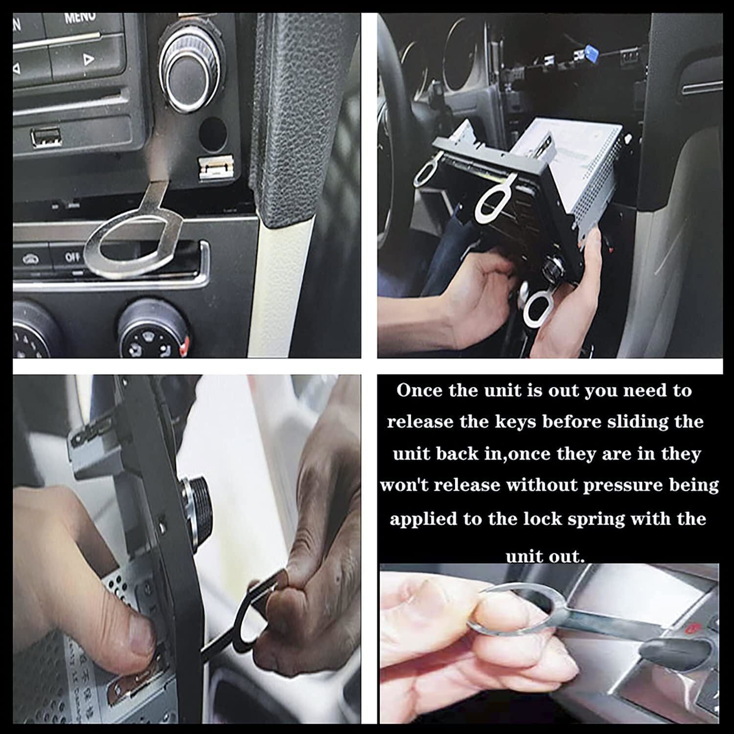 Easy To Use: firstly, insert keys into slots with straight edge facing away from the radio until it clicks, then repeat for the other slots, pull radio outwards using tool ring, once radio is removing, release keys by depressing spring tabs on either side of radio and pull out.