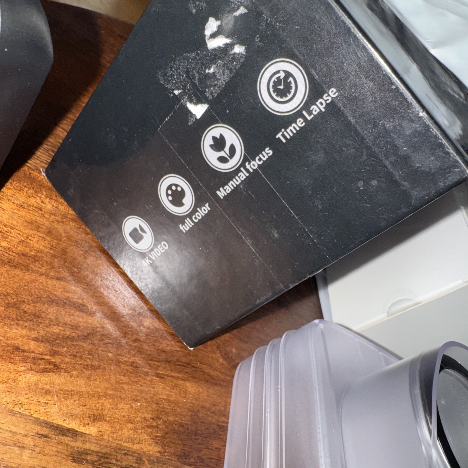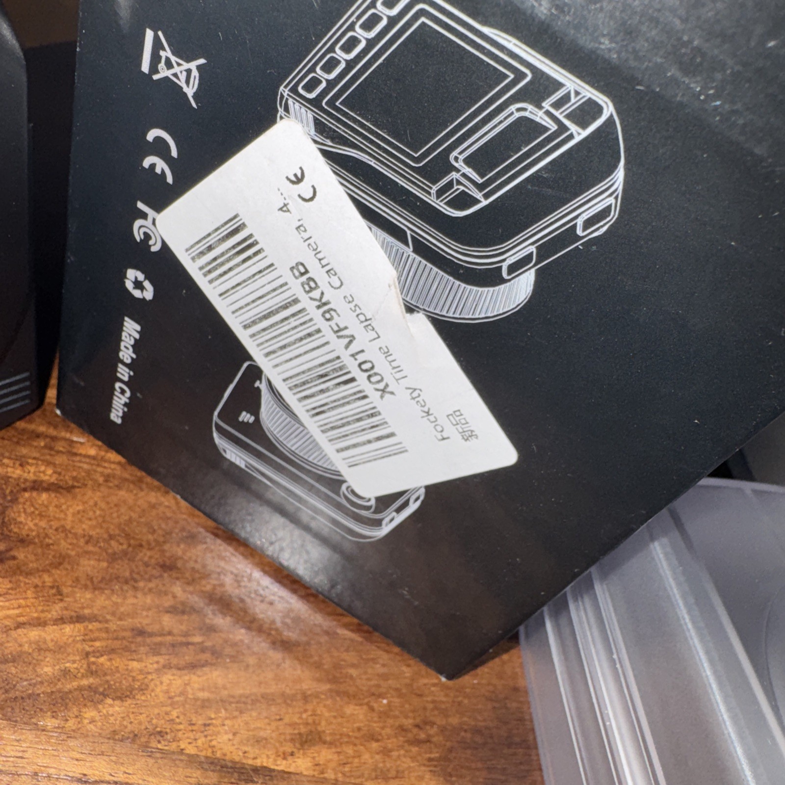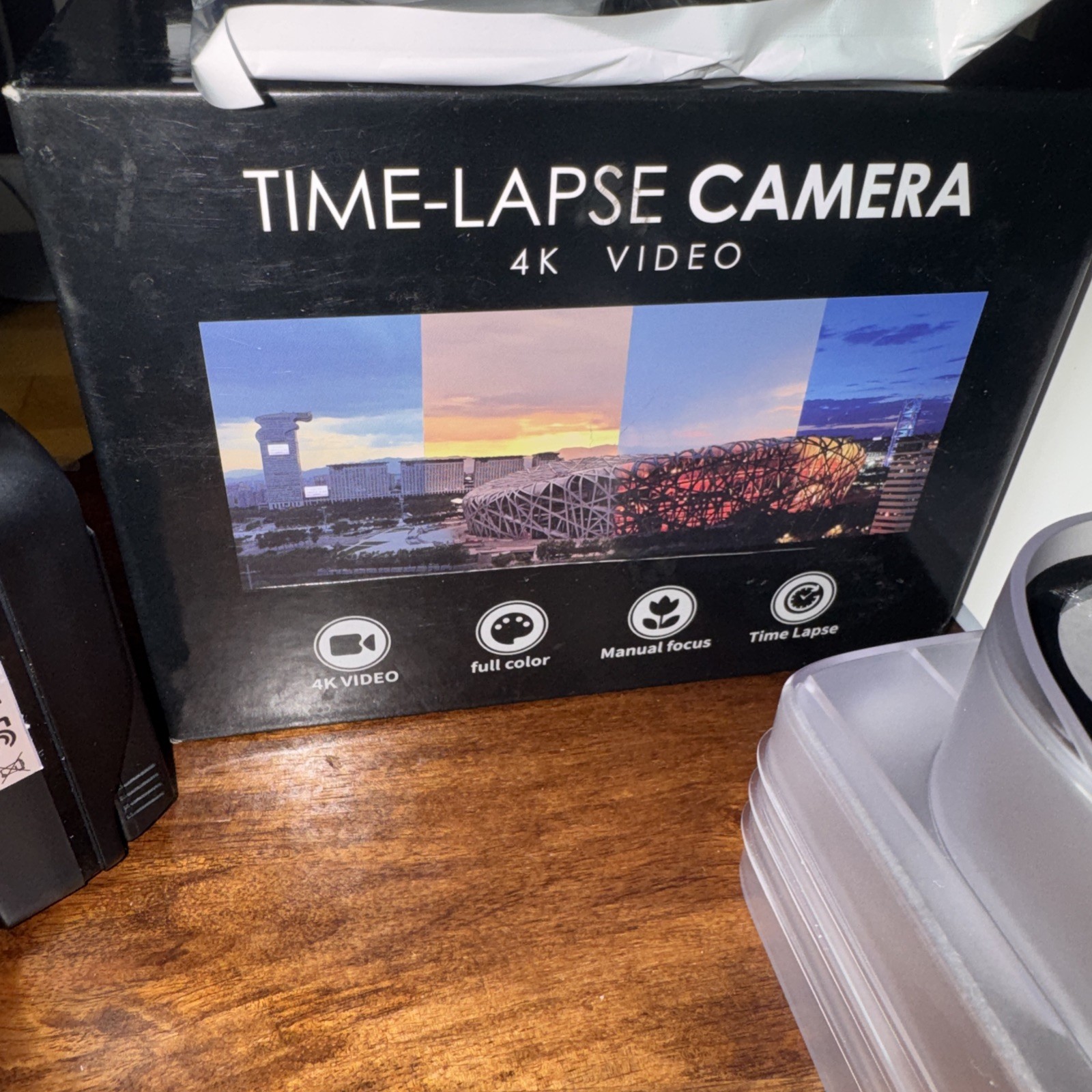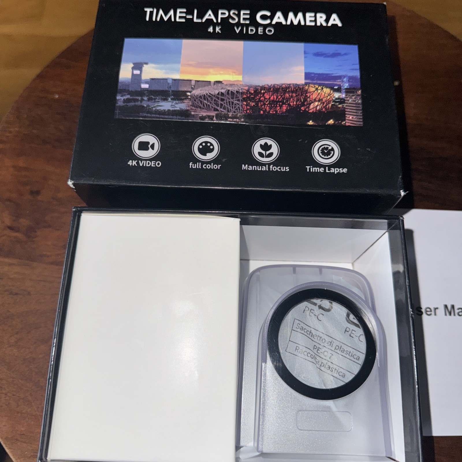 Focketsy 4K 32MP IP66 Waterproof Outdoor Time Lapse Camera. The unit appears unused, with protective films still on the lenses and accessories remaining sealed.