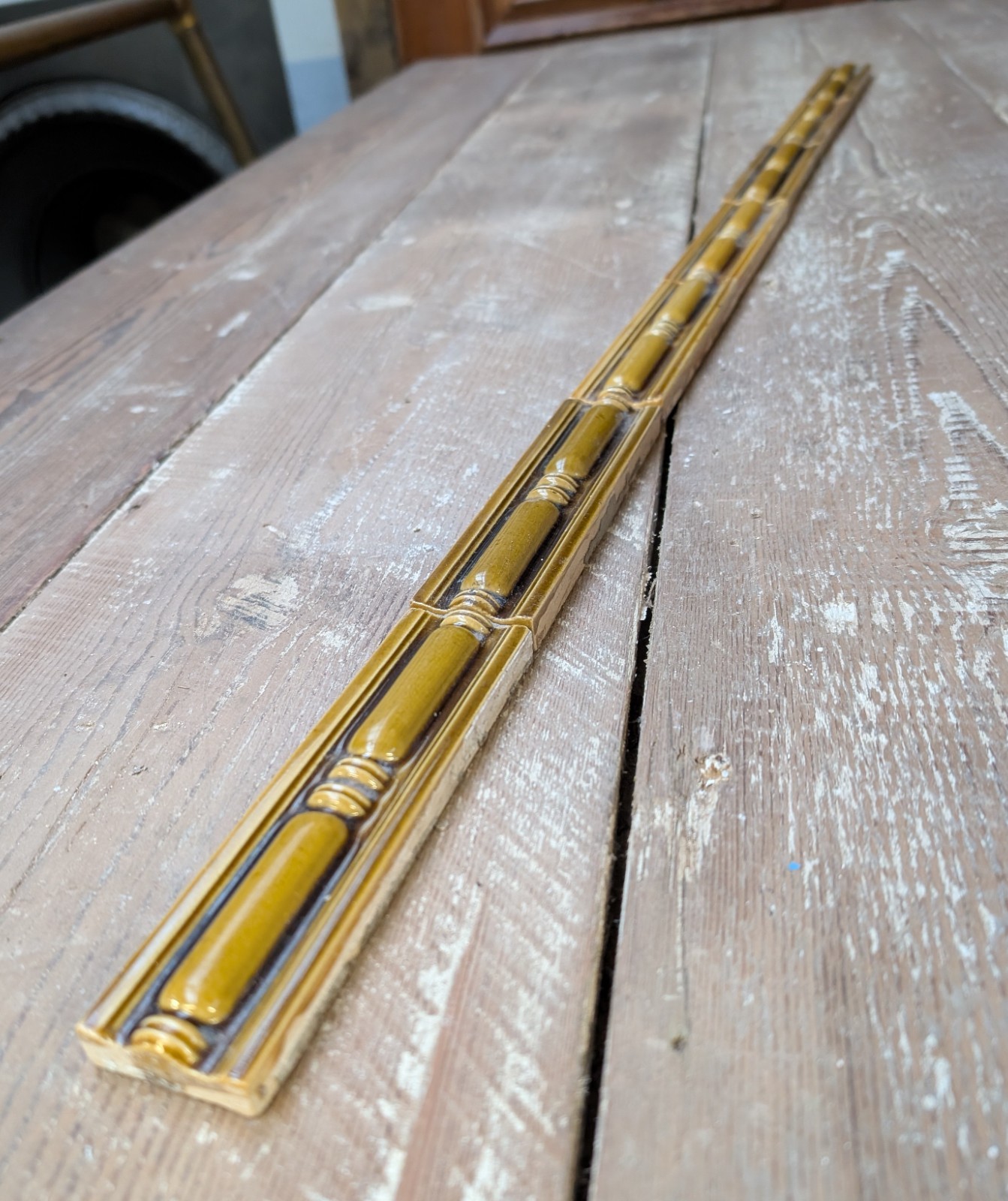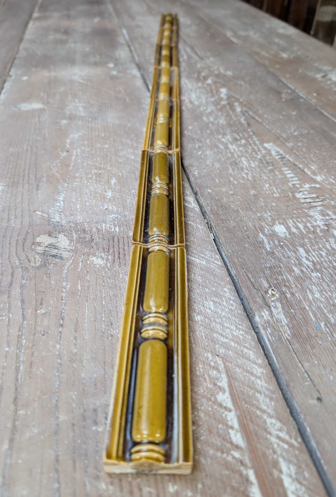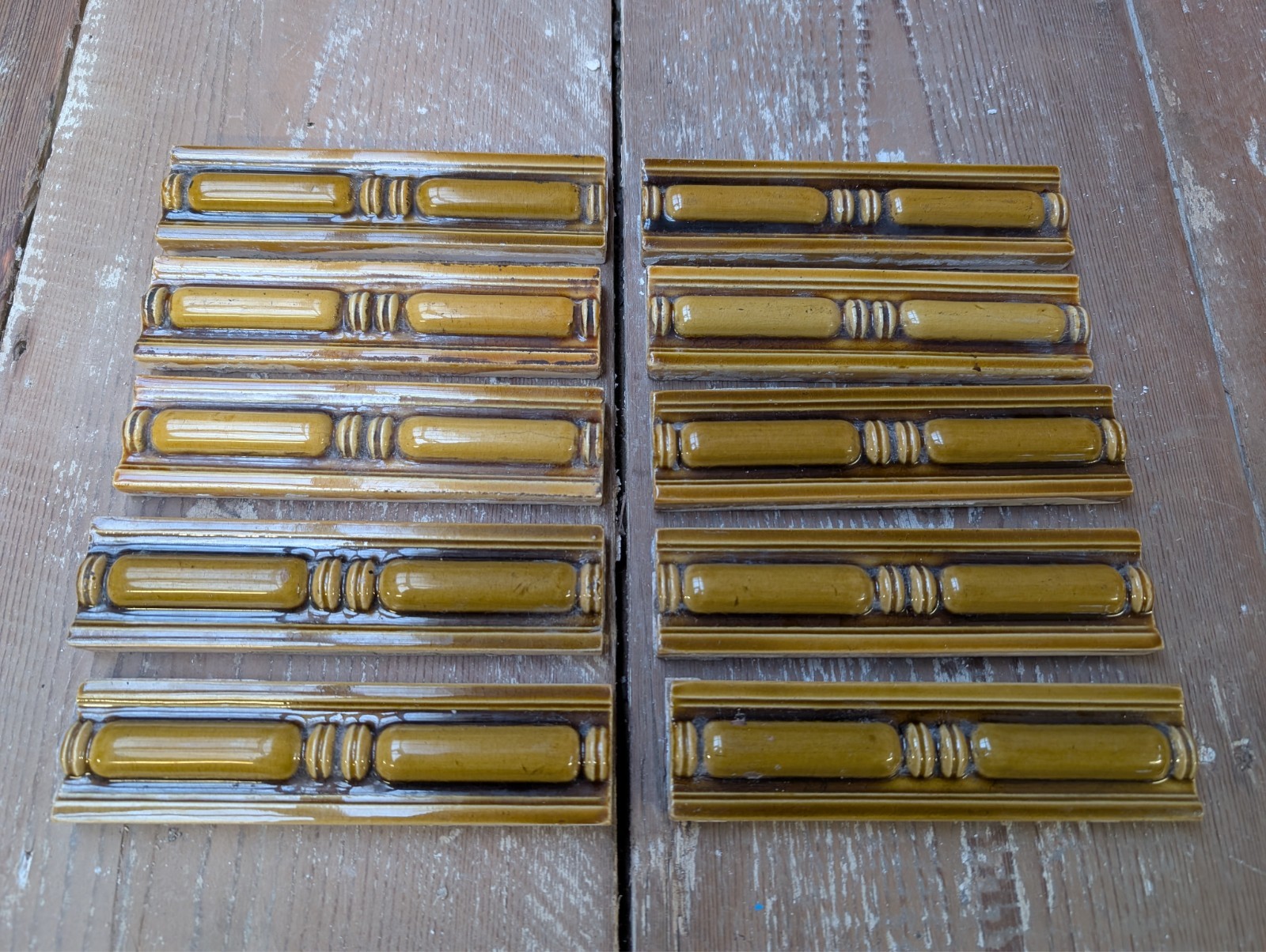 A set of elegant reclaimed Victorian dado / spacer / skirting tiles. The set comprises of 10 tiles and they are very finely made. Each tile has a raised centre with lovely period detailing that has been designed to allow the pattern to continue when placed next to another tile in the set. The tiles are in an olive green and have a nice glaze. The tiles are in good reclaimed condition with some signs of age and wear, as expected. The tiles have some small chips, scratches and marks and there are some knocks to the backs of the tiles. The tile glaze has crazing. Please see pictures for condition details. The tiles are very well made and are very desirable, ideal for a project or adding period character to a home.