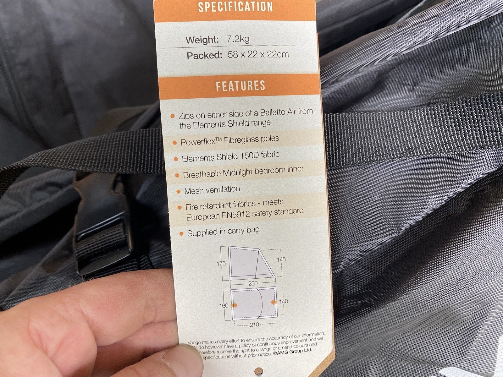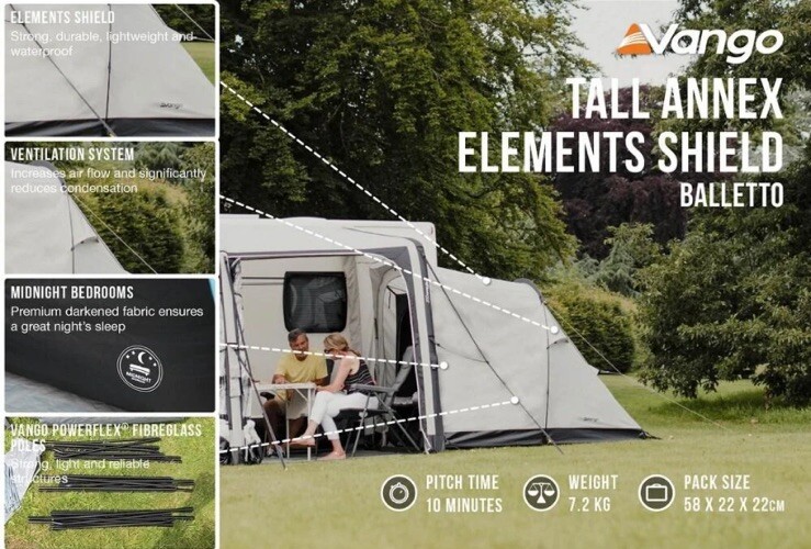 Expand your caravan awning with the Elements Shield Tall annex, attached simply by removing the side door on the awning and zipping the annex into place. Perfect as a bonus storage area or for additional guests who come to stay. Premium Midnight Bedrooms make for a better night's sleep that won't be interrupted by the rising sun. Powerflex poles and matching Elements Shield Fabric ensure an easy pitch to perfectly match your Elements Shield awning.
