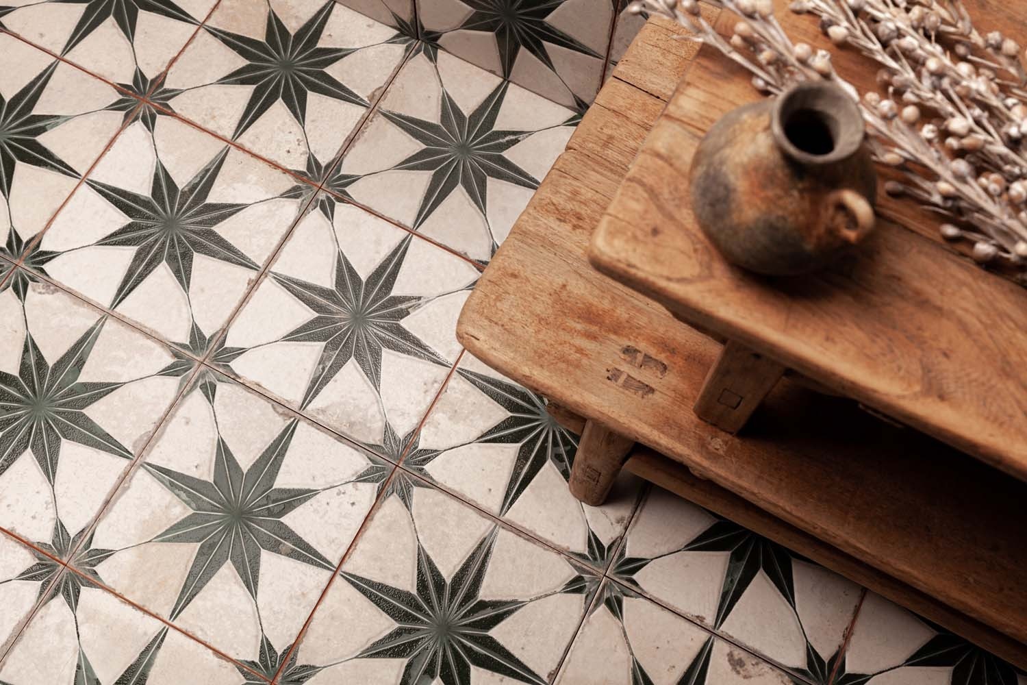 Tori Patterned Sage Green Star Tiles | Ceramic Lappato Tile | CUT SAMPLE
