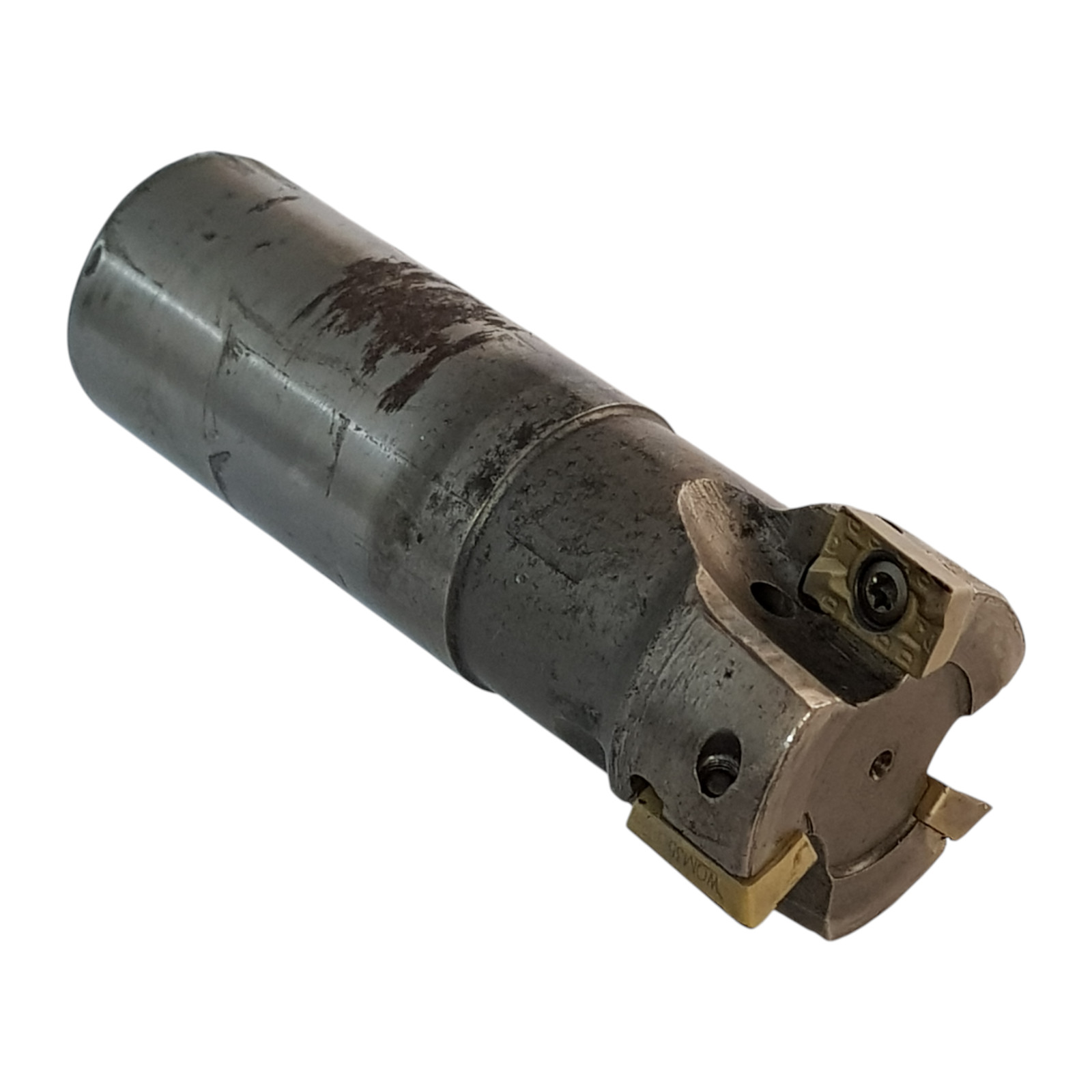 Walter indexable end mill with internal coolant supply, supplied complete with three inserts installed in WQM35 grade. The cutter shows signs of usage but remains in good working condition.