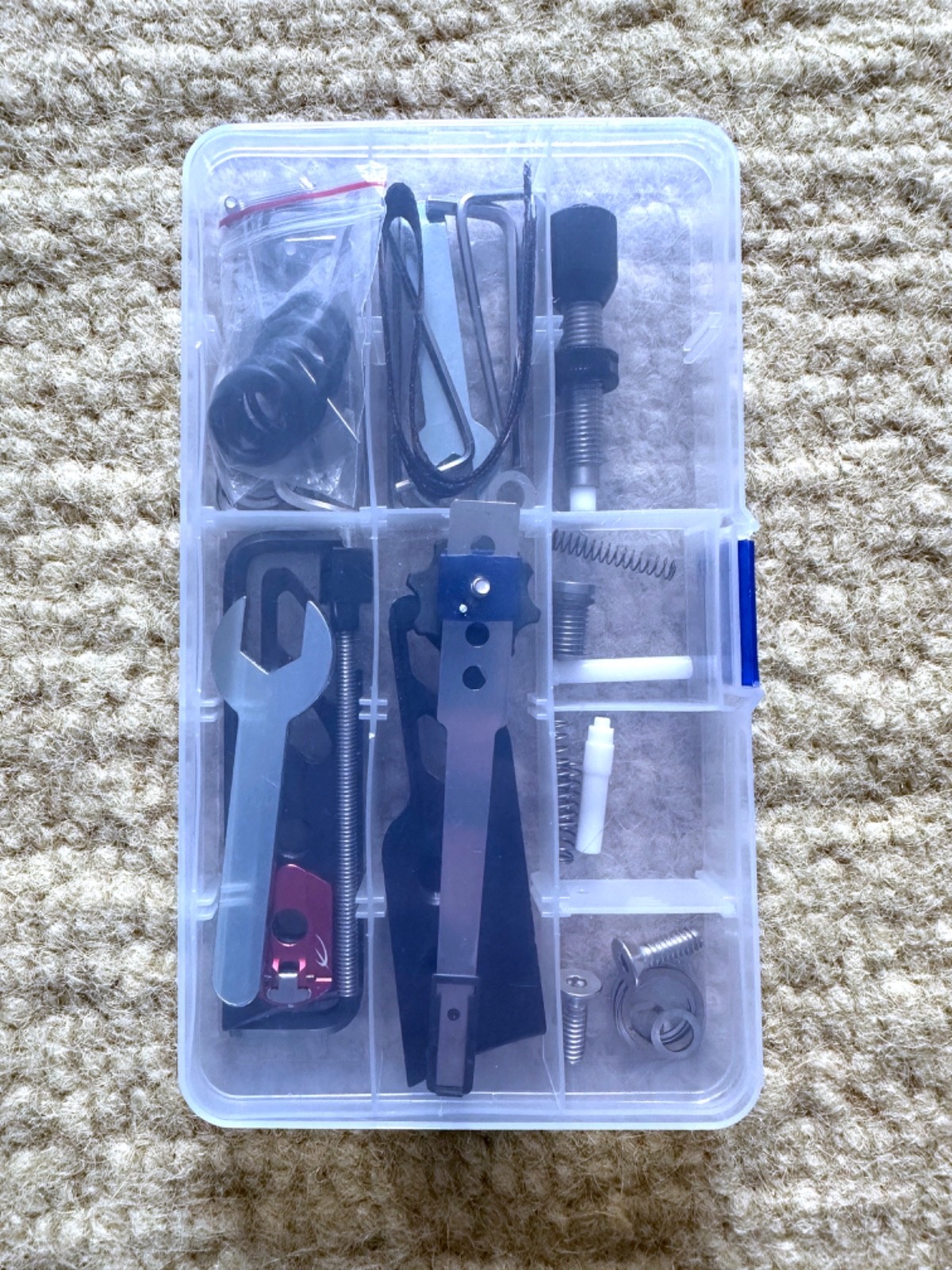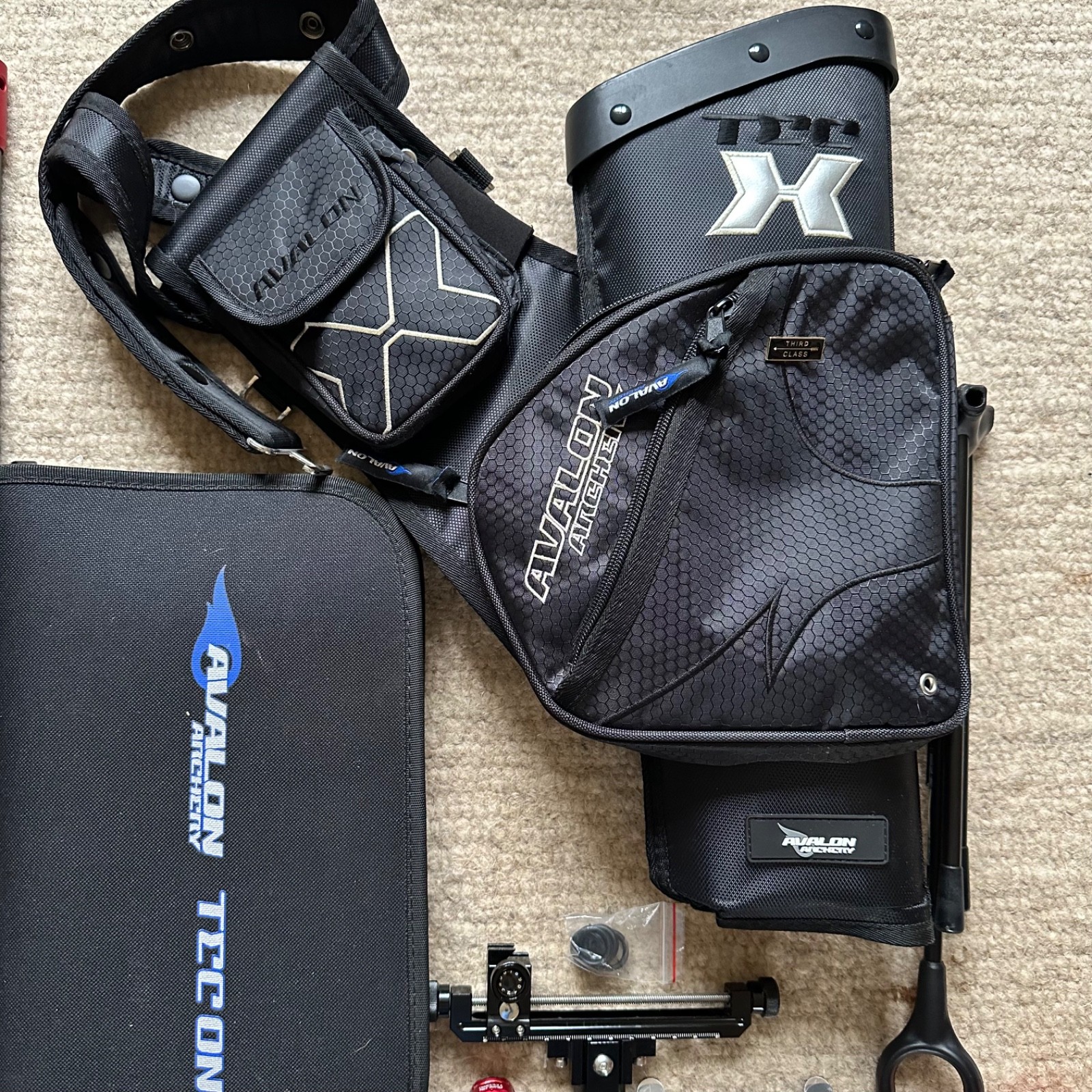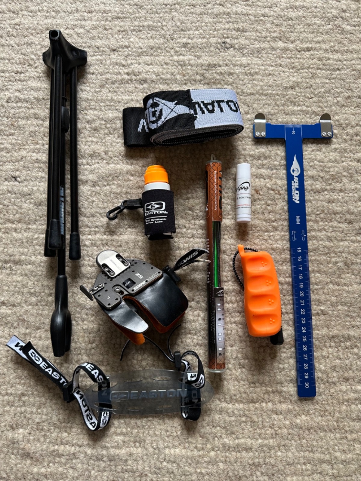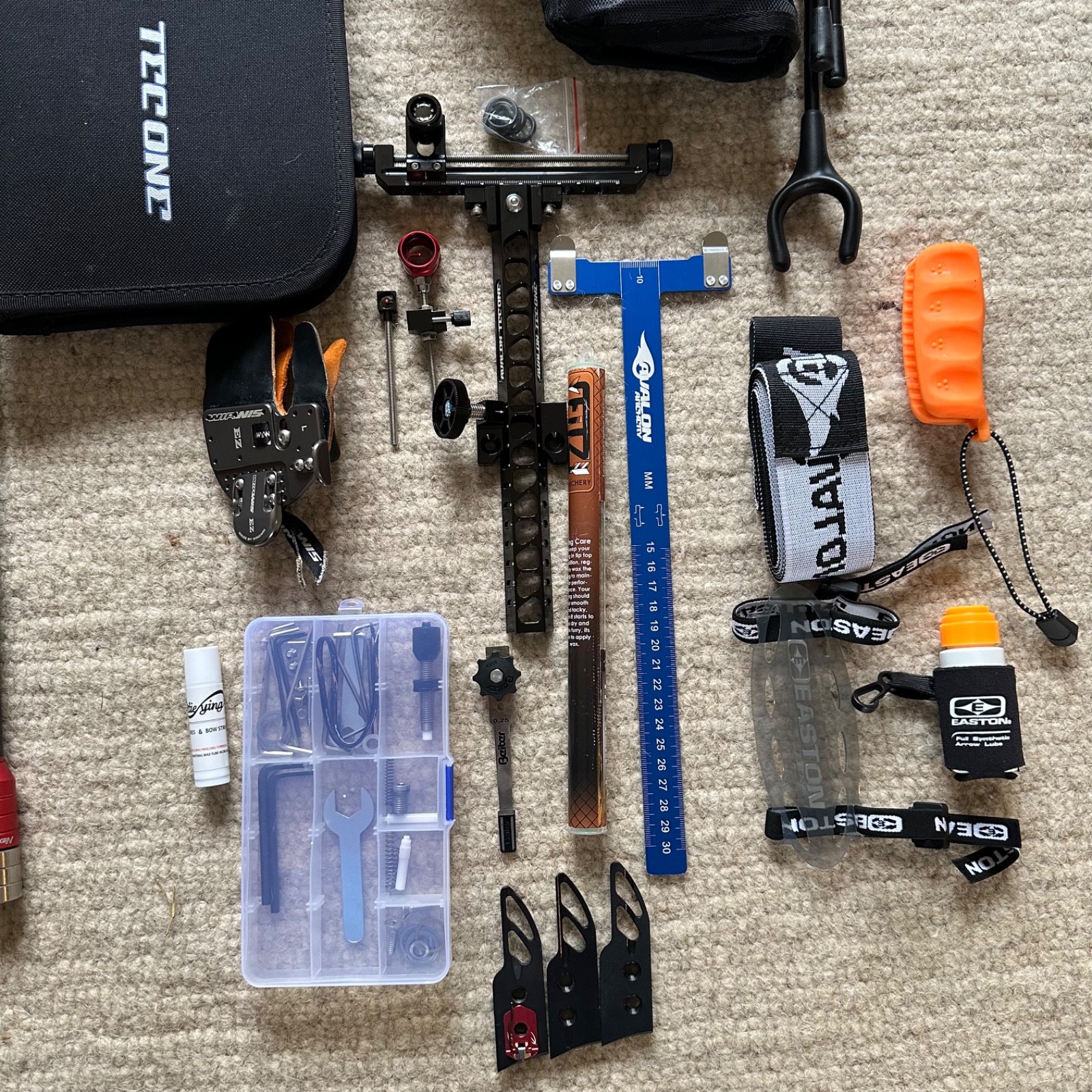 MISC - Avalon arrow puller, bow stringer, nock ruler, bow stand, Easton arm guard, tool case (washers, nuts, bolts, Allen keys etc)
