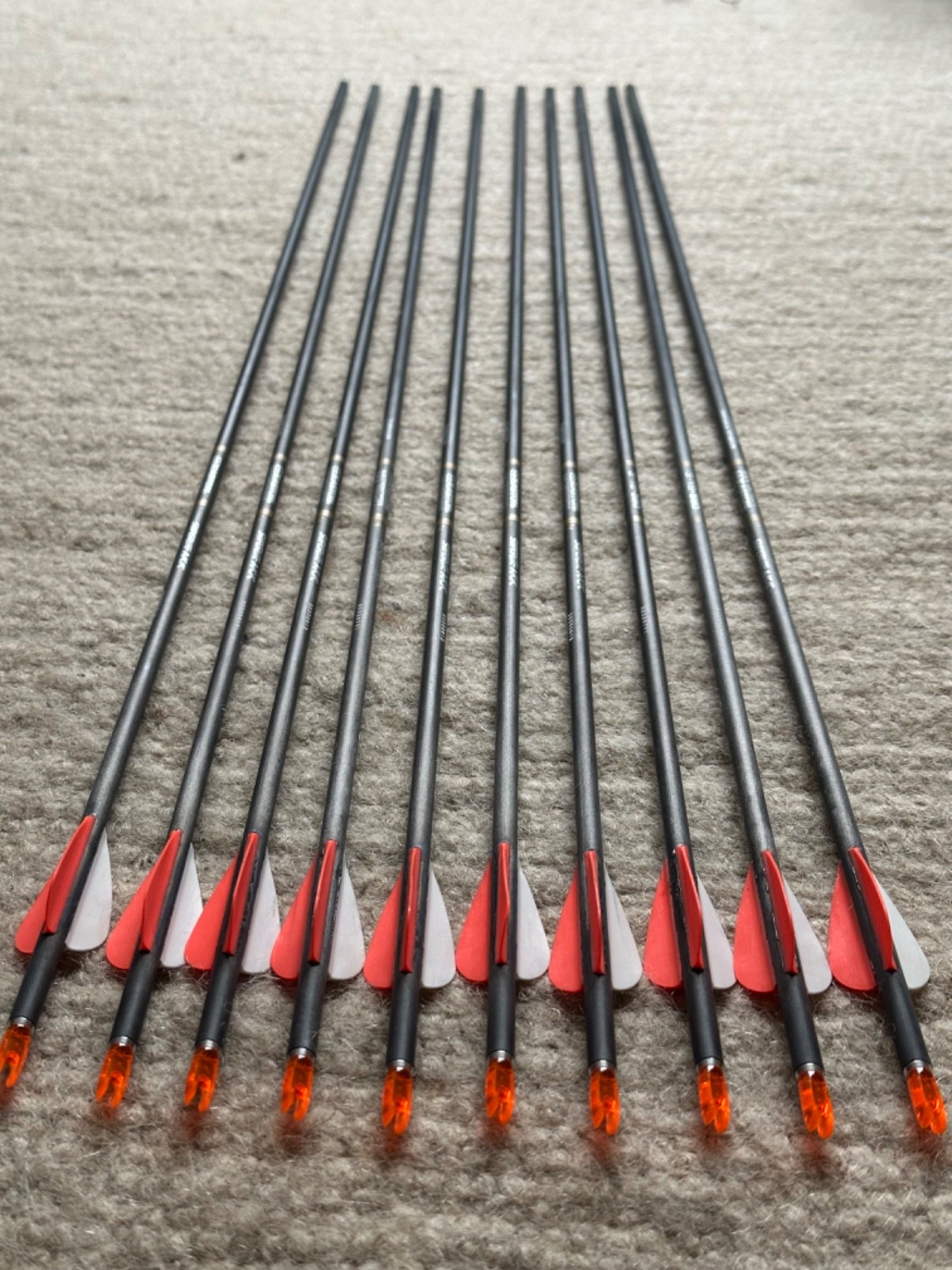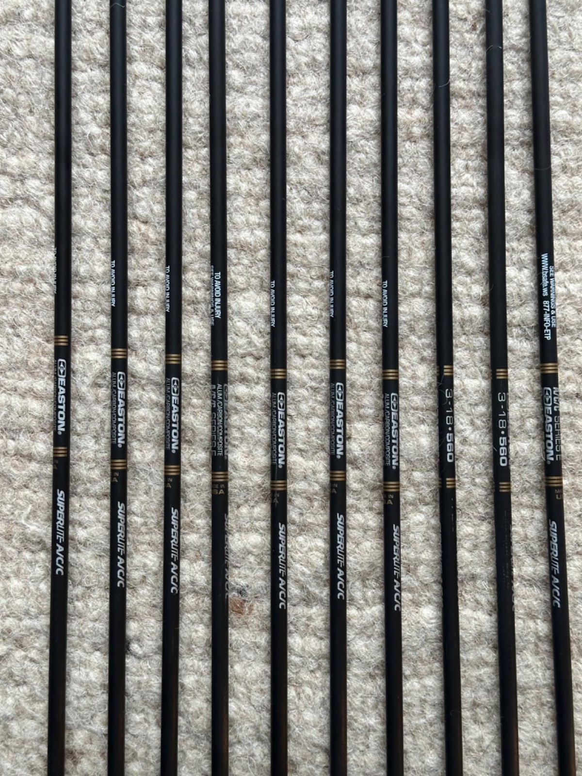 Arrows - Easton Superlite ACC Series E x10, aluminium/carbon composite, 3-18 560, overall length 31 1/2" or 80cm, shaft length 30 1/2 or 77.5 cm, hard Avalon protective arrow tube included. Nocks, fletchings and arrowheads are all in excellent condition. Arrows are all straight and true.