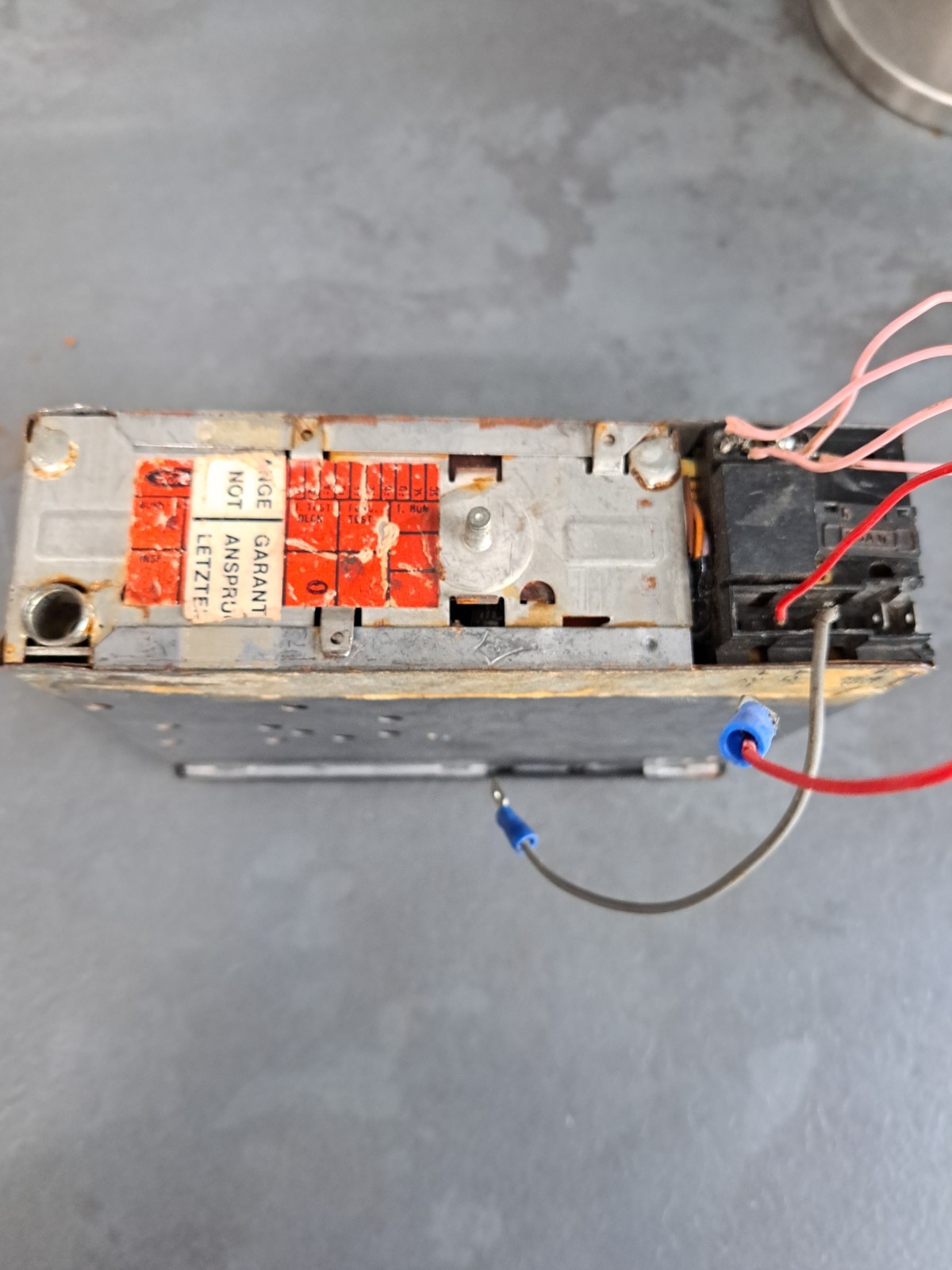 It has one knob missing and somebody has soldered wires onto the connectors at the back. The stereo seems to work but plays quiet, which may be down to the connections.