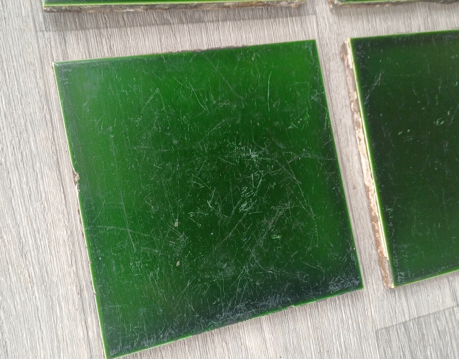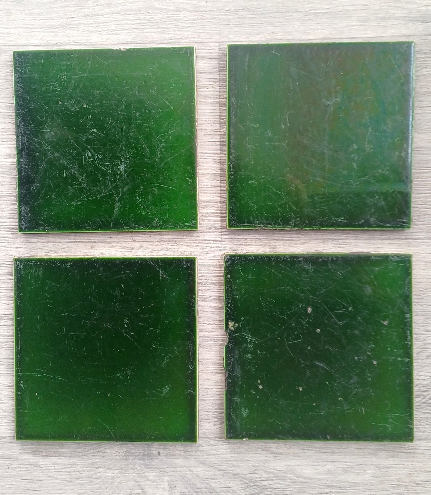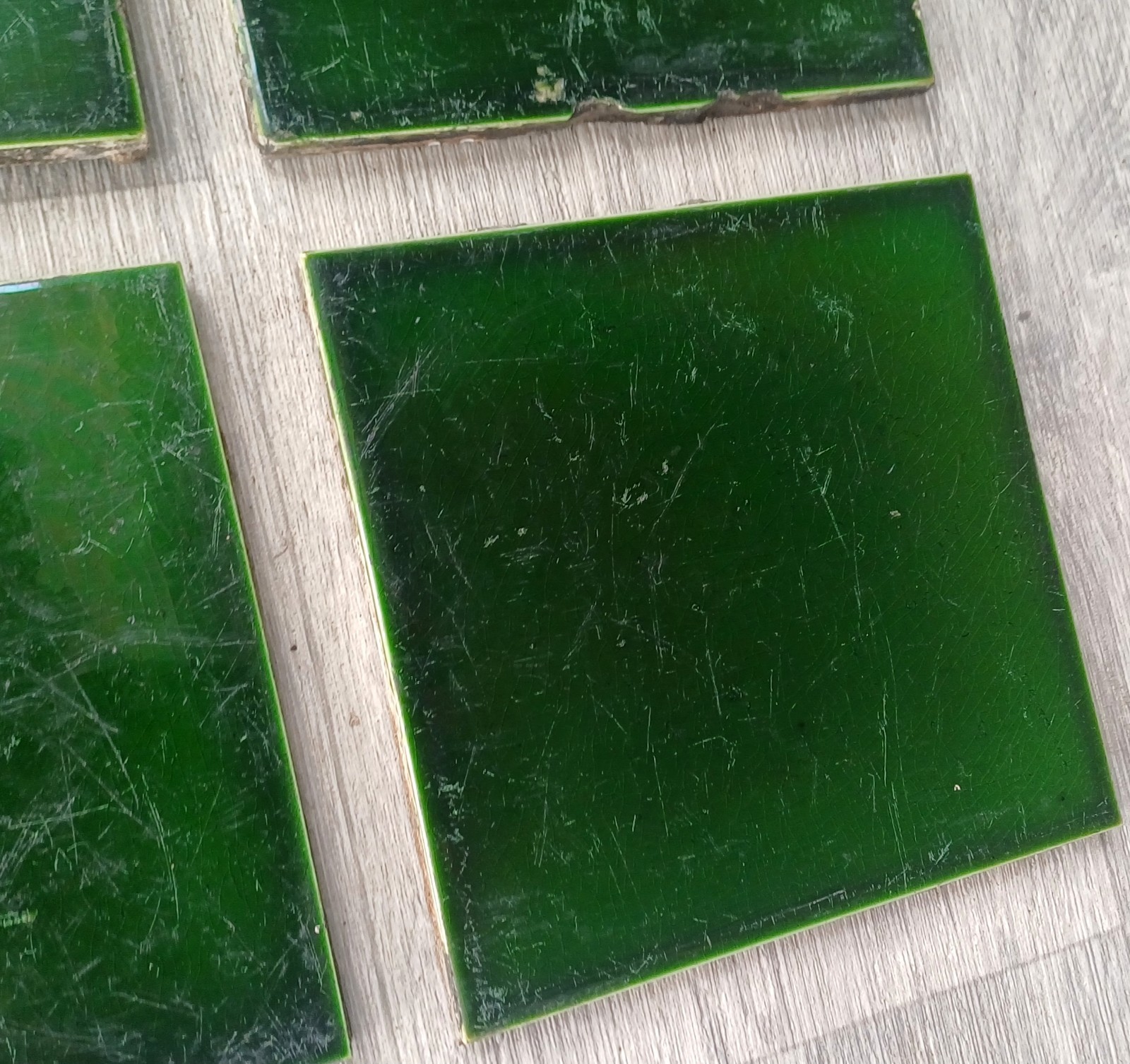 Victorian Reclaimed Green Square Tiles x4 6 X 6 Inch Antique. Reclaimed tiles with signs of wear, scratches and small chips etc. Dark Green colour. Reclaimed from a Victorian house hallway. Some grout and plaster stuck on which will require cleaning. See photos for condition detail etc