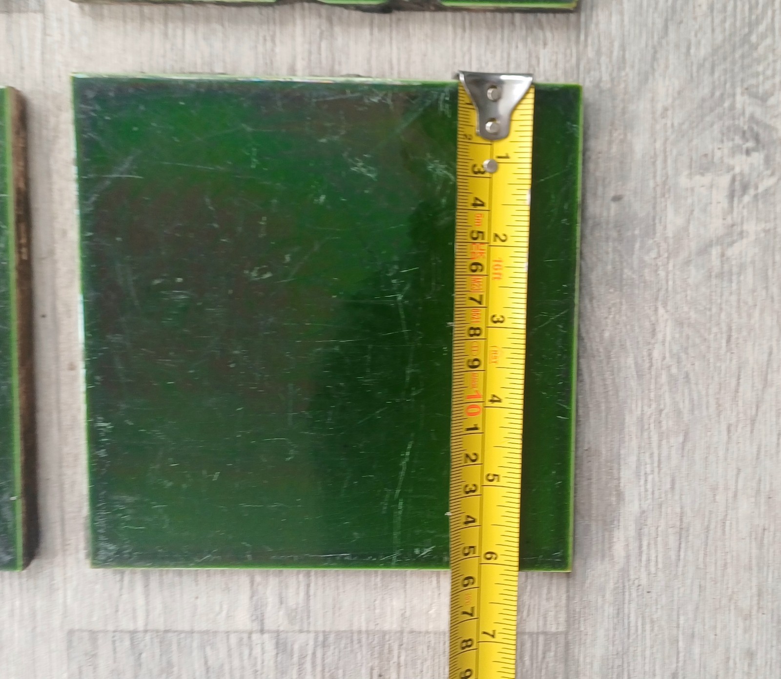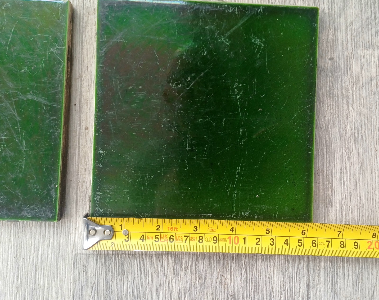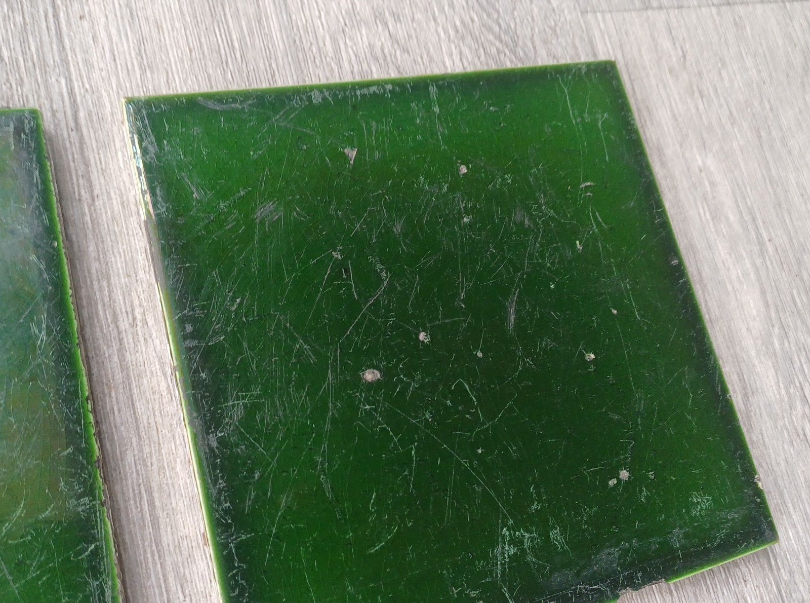 Victorian Reclaimed Green Square Tiles x4 6 X 6 Inch Antique. Reclaimed tiles with signs of wear, scratches and small chips etc. Dark Green colour. Reclaimed from a Victorian house hallway. Some grout and plaster stuck on which will require cleaning. See photos for condition detail etc