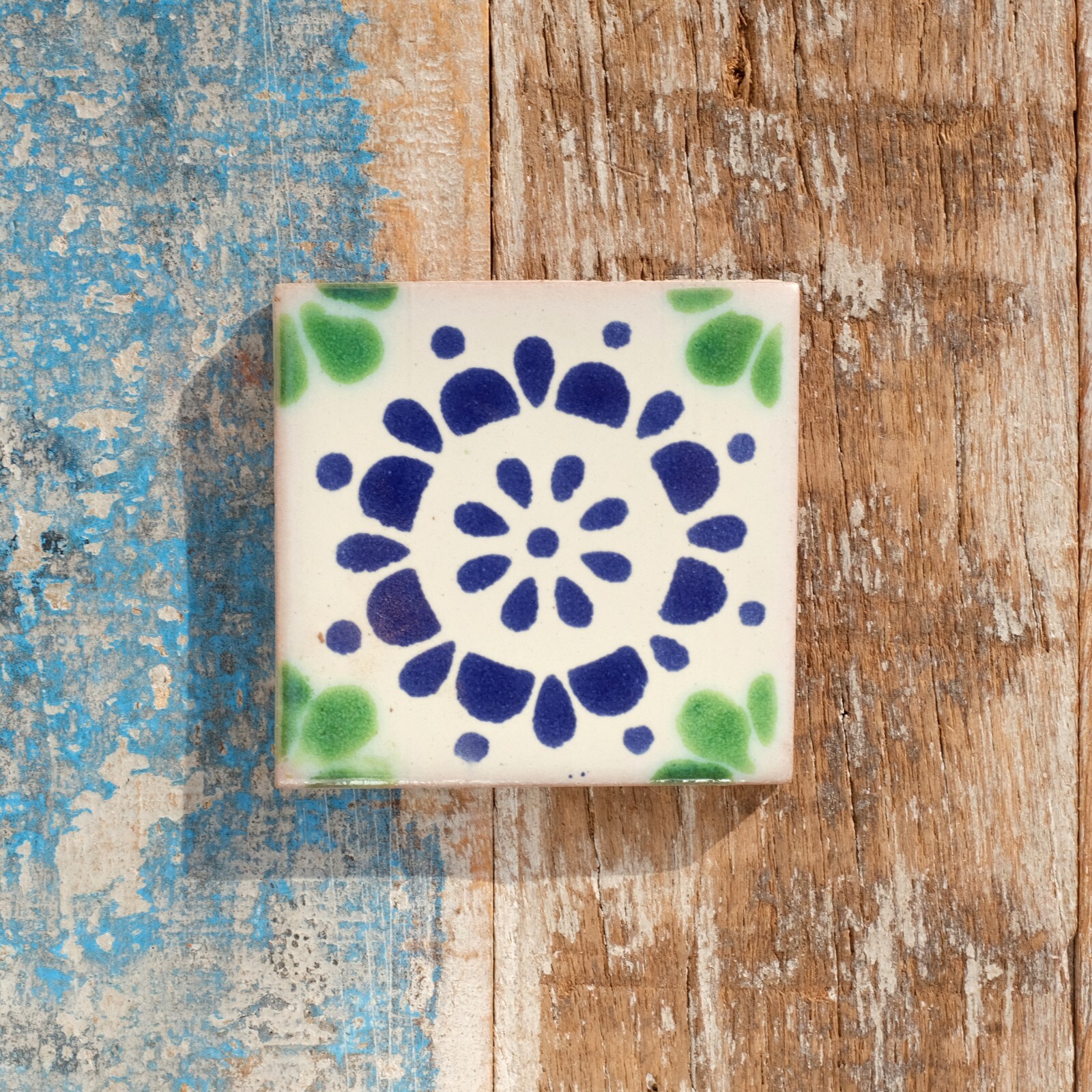 We have been importing these Mexican tiles direct from Mexico since 2001. They are handmade from terracotta clay then the design is screen printed in many layers on to the base colour, the tiles can be slightly concave or convex due to their position in the kiln. Due to the handmade nature of the tiles they are not all completely square and the colours will vary from batch to batch.