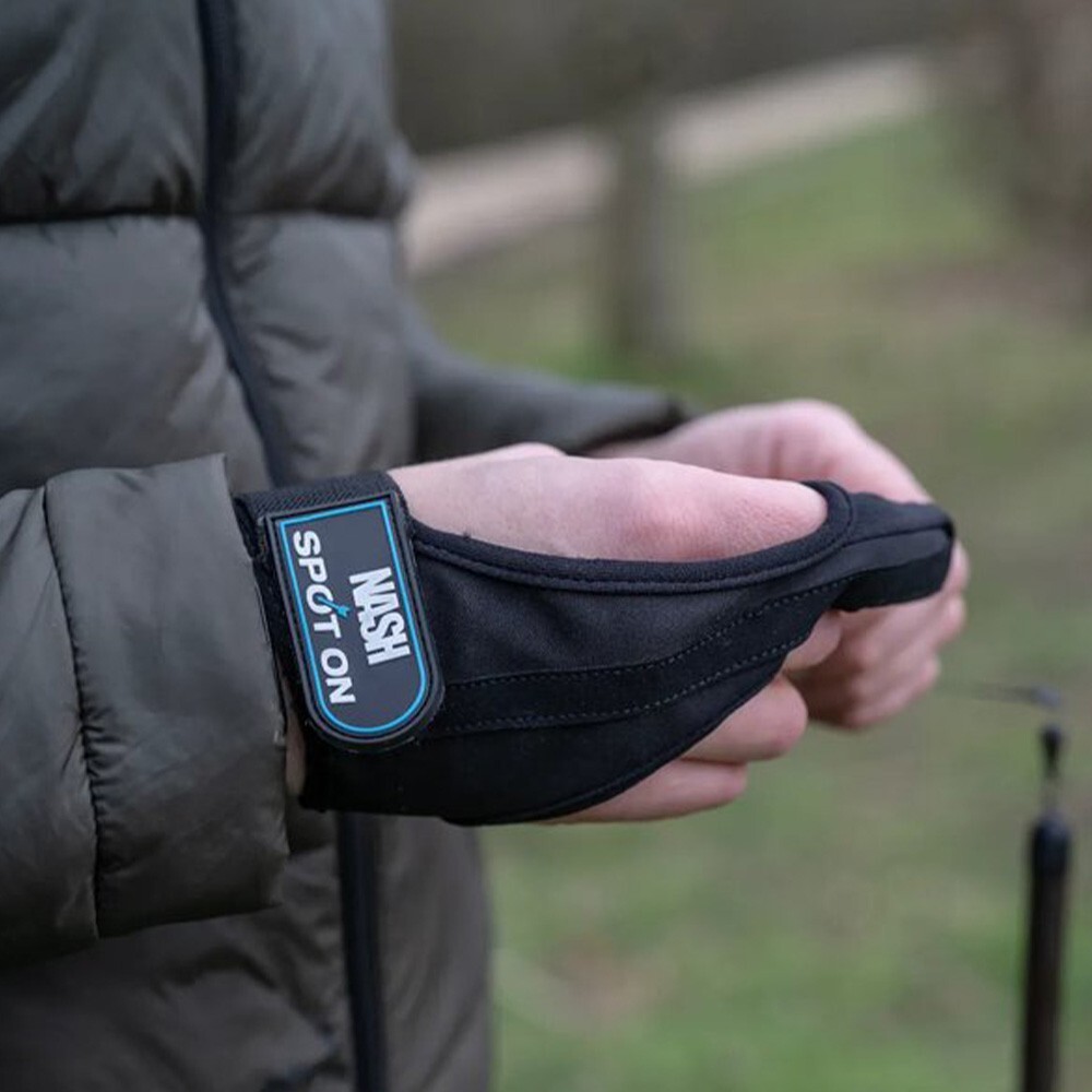 Nash Spot On Casting Finger Stall, A close fit soft suede leather finger stall combining maximum sensitivity for extreme range casting with protection against finger damage from braided leaders and mainlines. Finished with a Spot On branded elasticated wrist strip. One size fits all.
