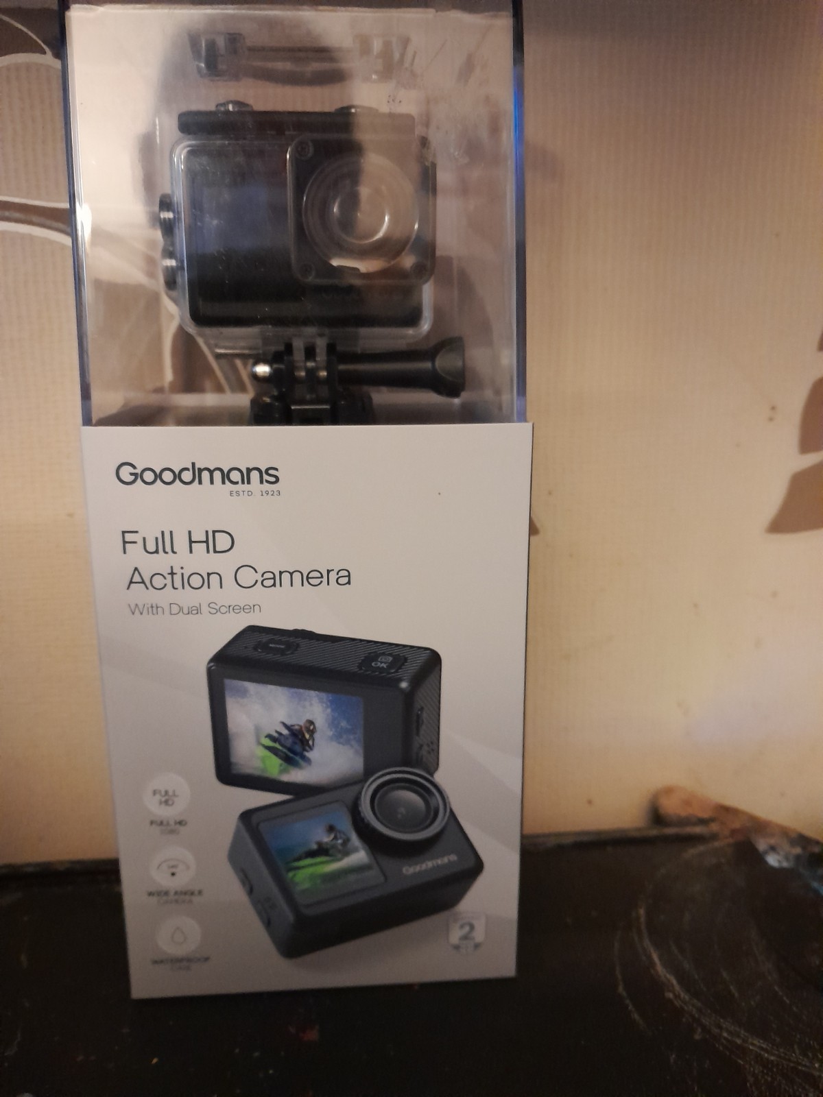 Goodmans Full HD Action camera with duel screen full HD wide angle camera comes with waterproof case, handlebar mount, tripod, selfie stick mount, adhesive pads, camera holder and strap