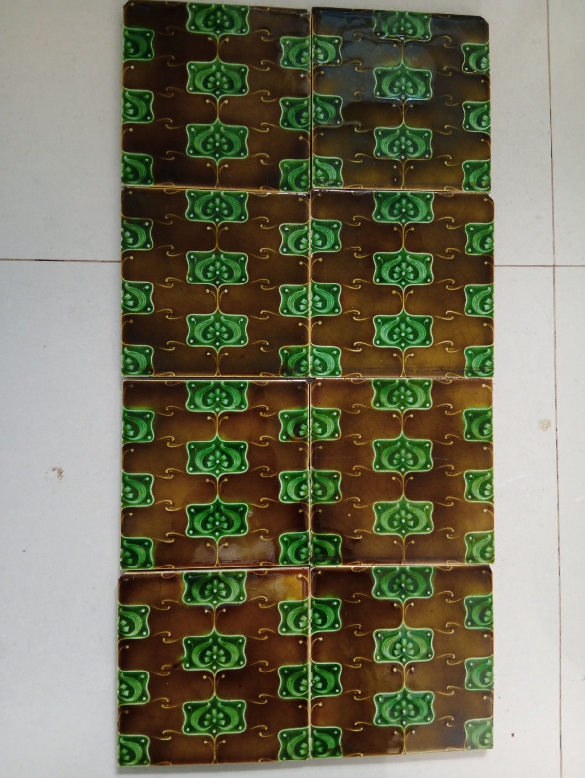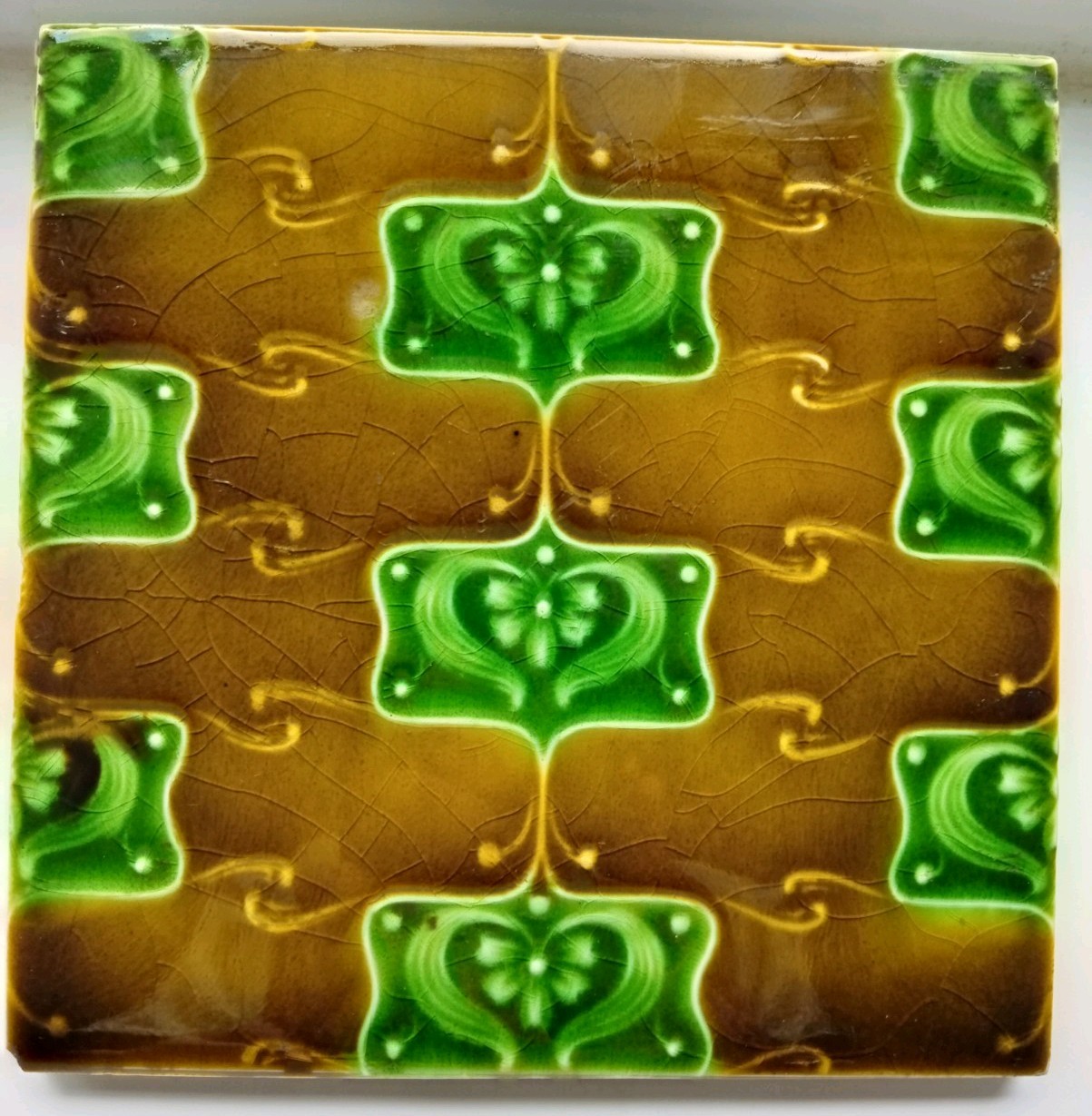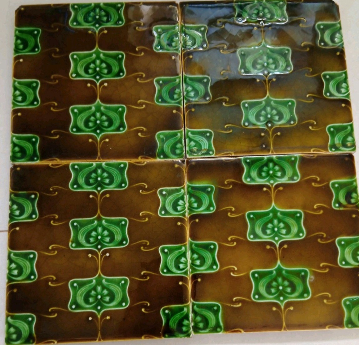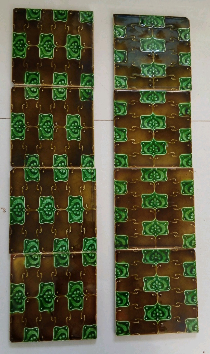 (ONE) Antique English ceramic fireplace / wall tile in rich brown and emerald green majolica glaze, featuring a repeating floral Art Nouveau design closely comparable to known Henry Richards pattern work from the early 20th century. Offered as attributed to Henry Richards based on close visual comparison with documented examples, though this tile is not factory named. Reverse marked ENGLAND with pattern number 396-1. Size approx: 6" x 6" Thickness approx: ⅜" Glossy glaze with strong colour and attractive surface depth. A decorative original period tile suitable for display, collection, restoration or interior reuse. Price is for one tile only. I currently have 8 matching full-size tiles available from the same group. Please study photographs carefully as they form part of the description and condition report. International buyers welcome. Items are carefully packed for safe shipping, with combined postage where possible. Any questions please message me.