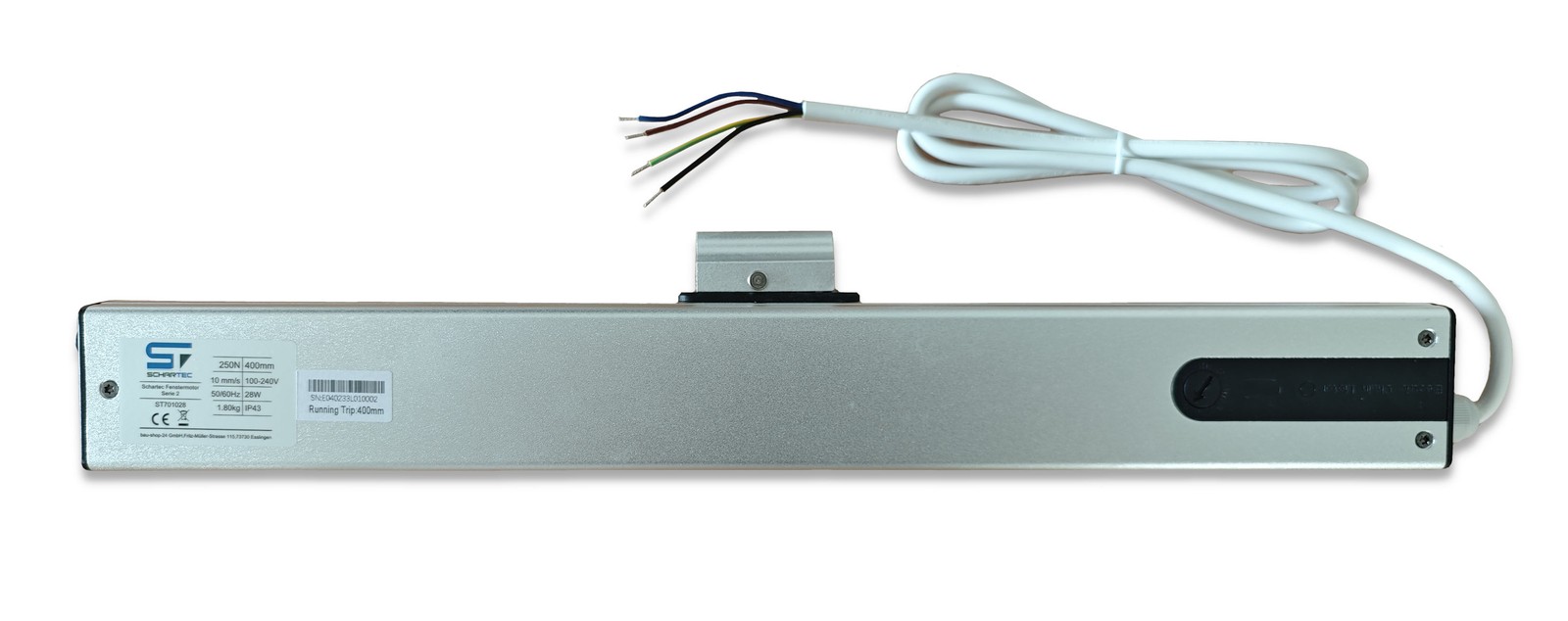 The AM56 window motor is suitable for top-hinged windows, bottom-hinged windows, and roof windows alike. The Schartec window actuator is ideal for retrofitting or replacing a faulty window motor. The chain, made from double-layer stainless steel, ensures stable and smooth operation. The window motor has been tested for 10,000 cycles, making it very robust and durable. Thanks to the built-in overload protection, the motor is additionally safeguarded against overload. You can also adjust the opening travel (stroke) from 100 to 400 mm.