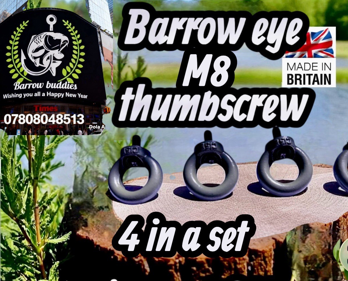 The Barrow Eye Bolt [M8 ONLY]Thumb Screws are designedMade from durable steel in a green colour, these multifunctional screws offer a secure and versatile solution for attaching bungees and accessories to your cart. Easy to tighten gives you more grip than old thumb screws to stop pieces of your barrow coming loose, Perfect for outdoor enthusiasts looking for reliability and ease of use when setting up their fishing barrows THIS PRICE IS FOR 1 SET OF 4 BARROW EYES M8 to fit 90 % of barrows out there be careful as some fox barrows have M6 thread measure thumb screws before purchasing