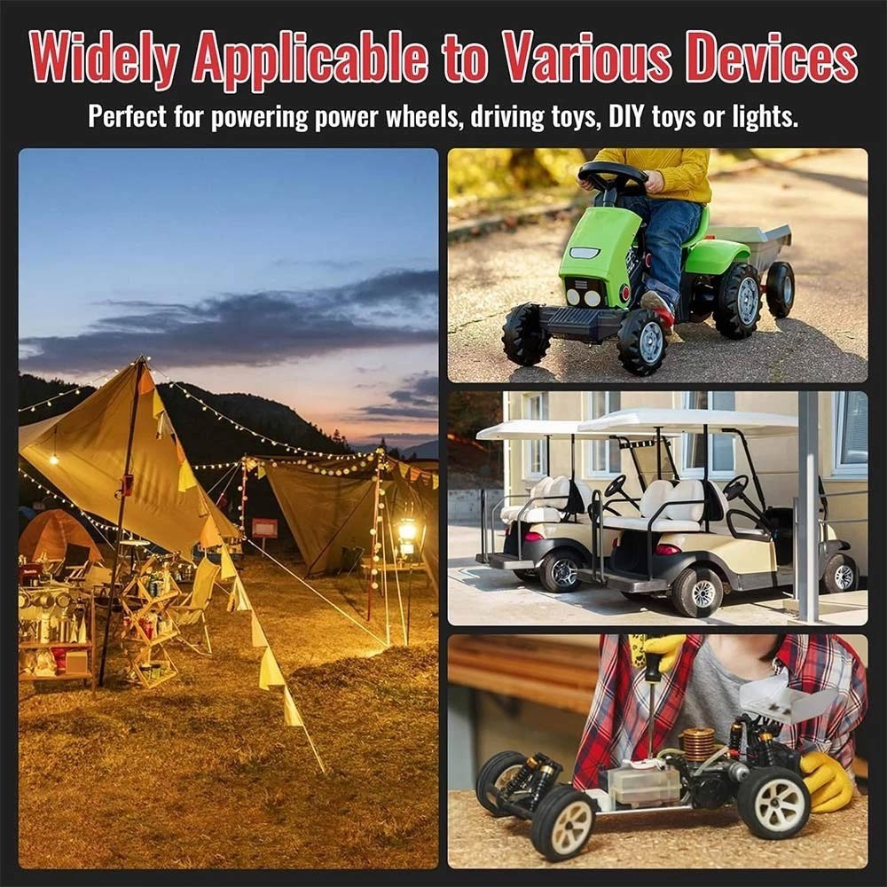 Wide compatibility with various 12V devices, ideal for upgrading power tools, ride-on, golf carts, cars and trucks, speakers, surveillance equipment, LED light strips, work lights, and DIY robotics projects.