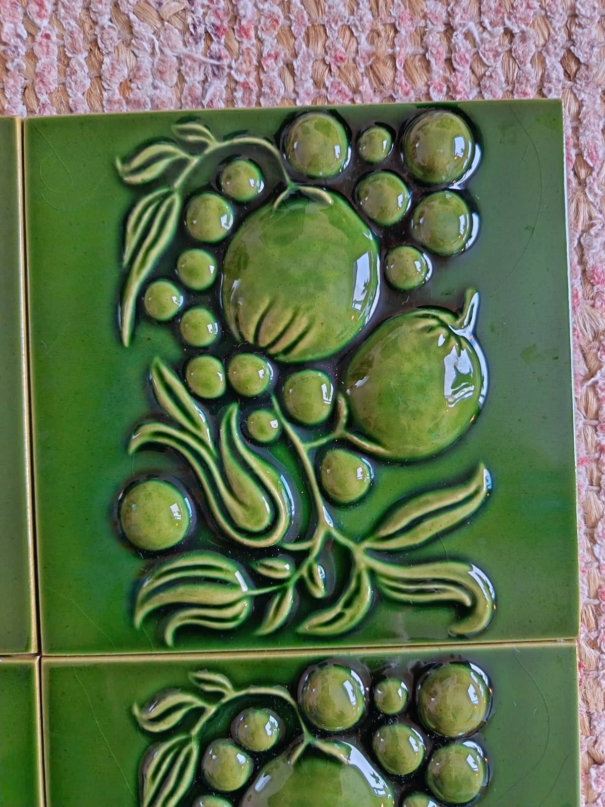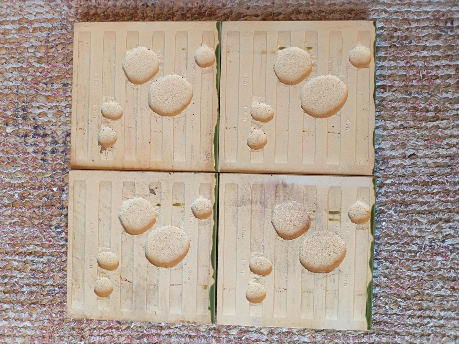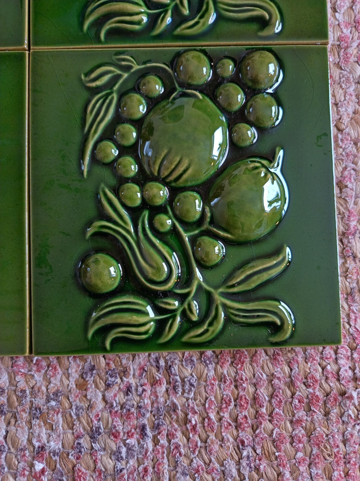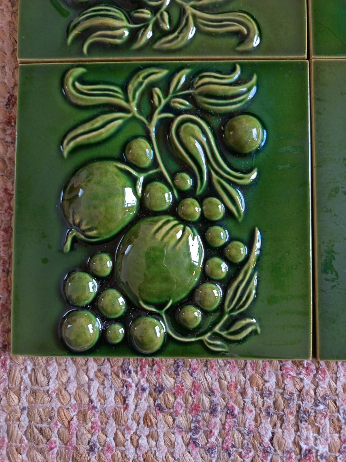 Here we have a set of 4 original vintage, possibly antique fireplace ceramic tiles. They are green in colour with a botanical design. They were produced in England by H & E Smith. They were never stuck.