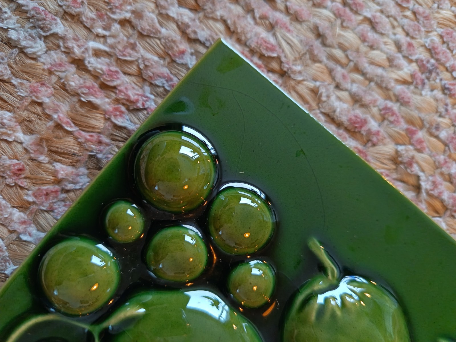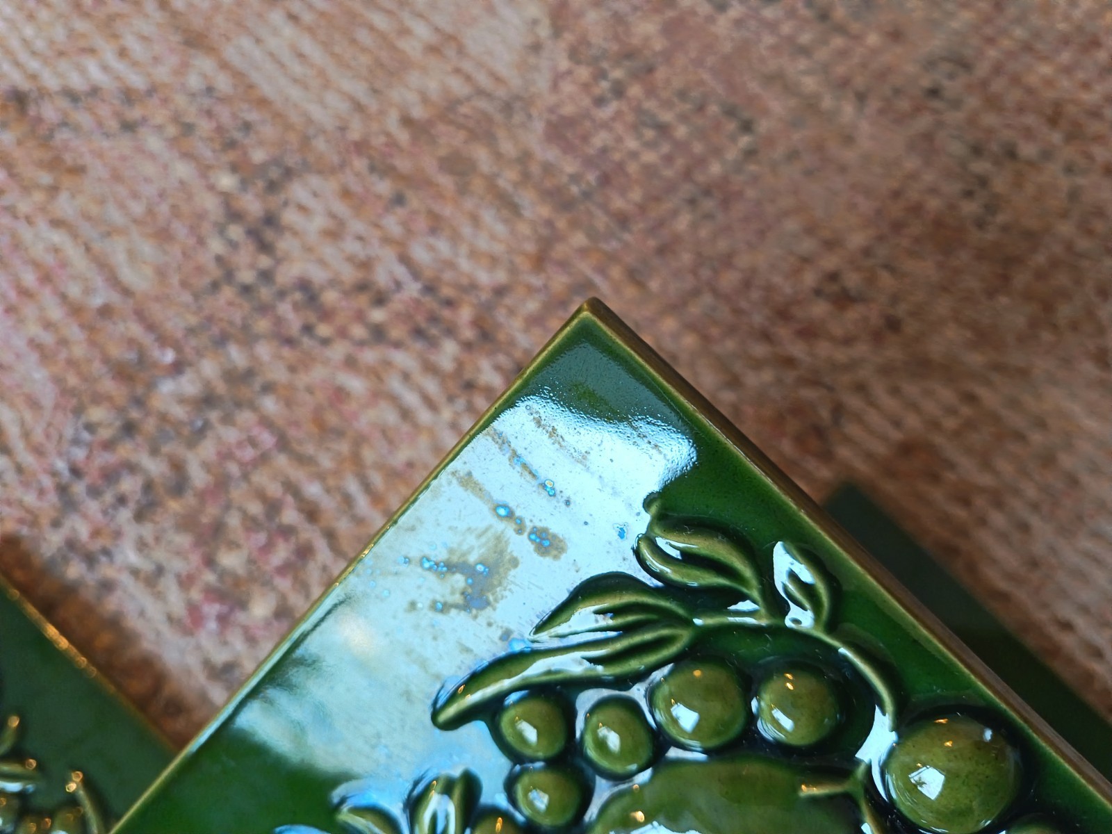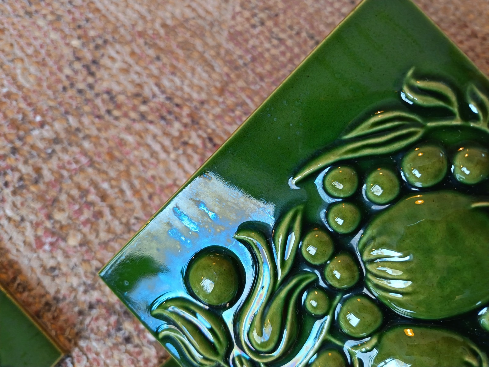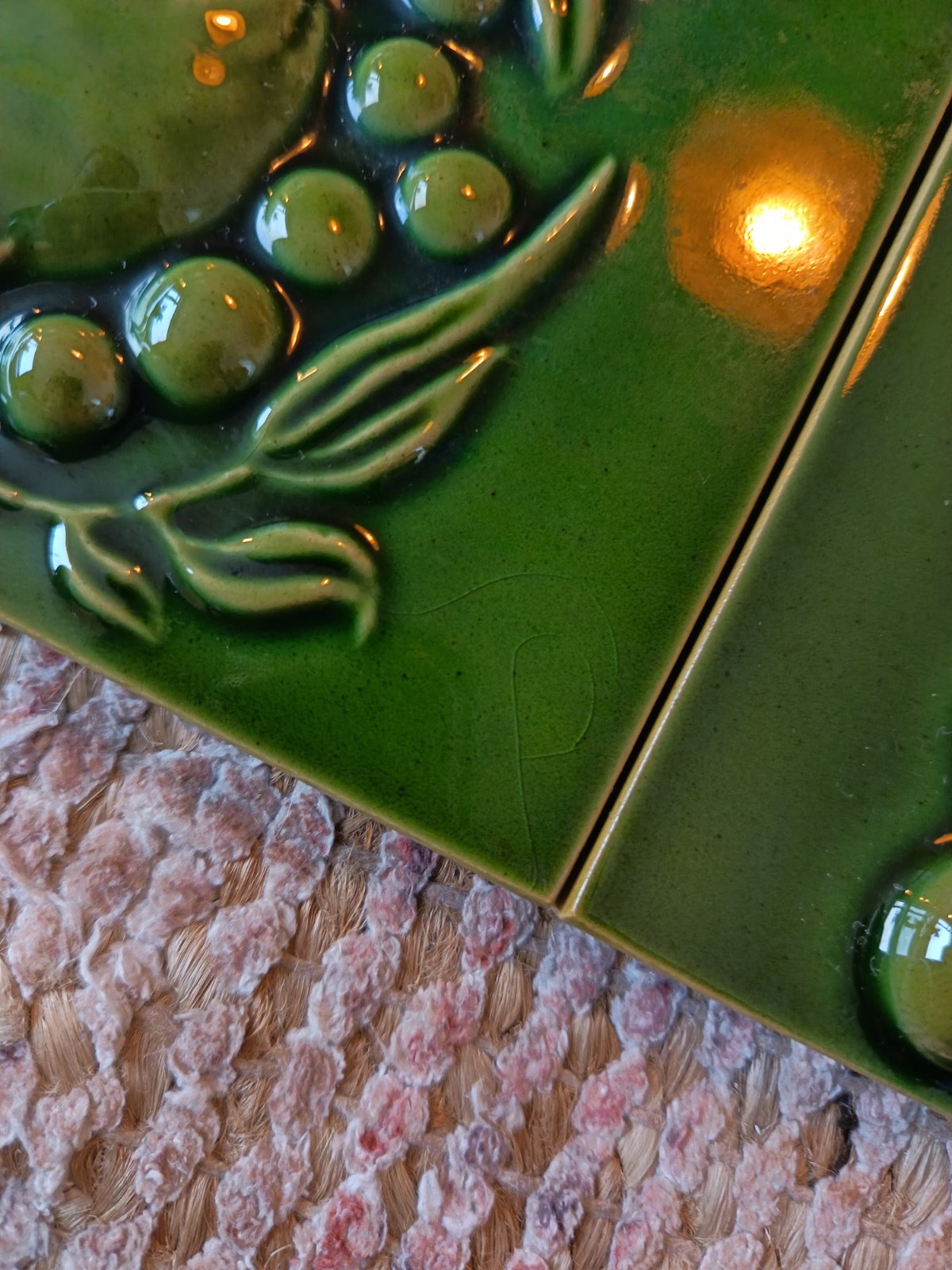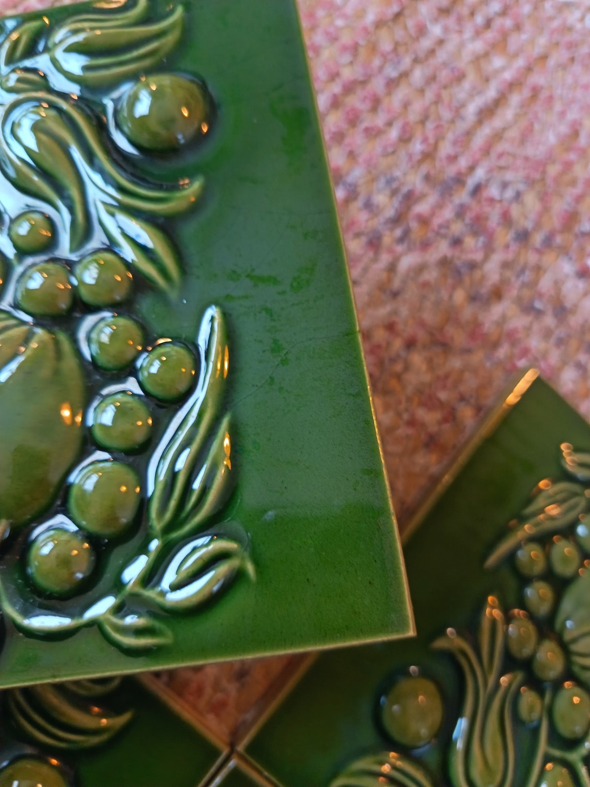 Here we have a set of 4 original vintage, possibly antique fireplace ceramic tiles. They are green in colour with a botanical design. They were produced in England by H & E Smith. They were never stuck.