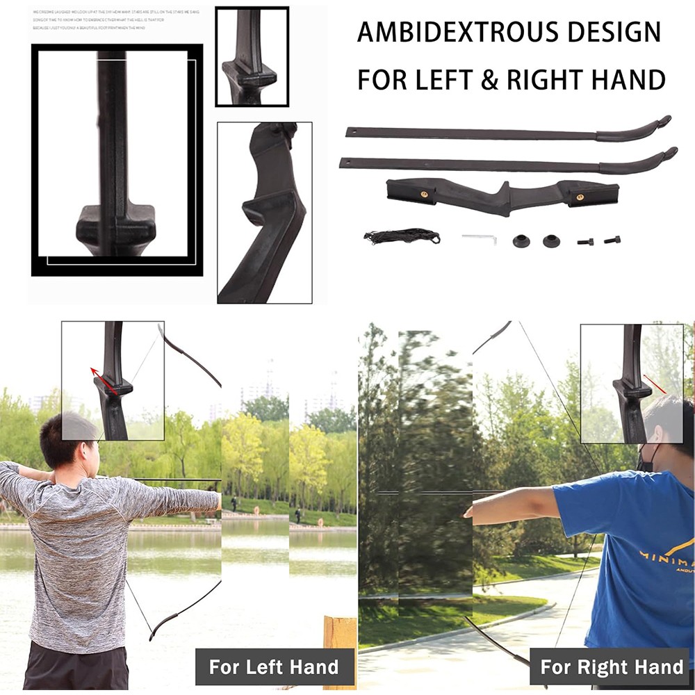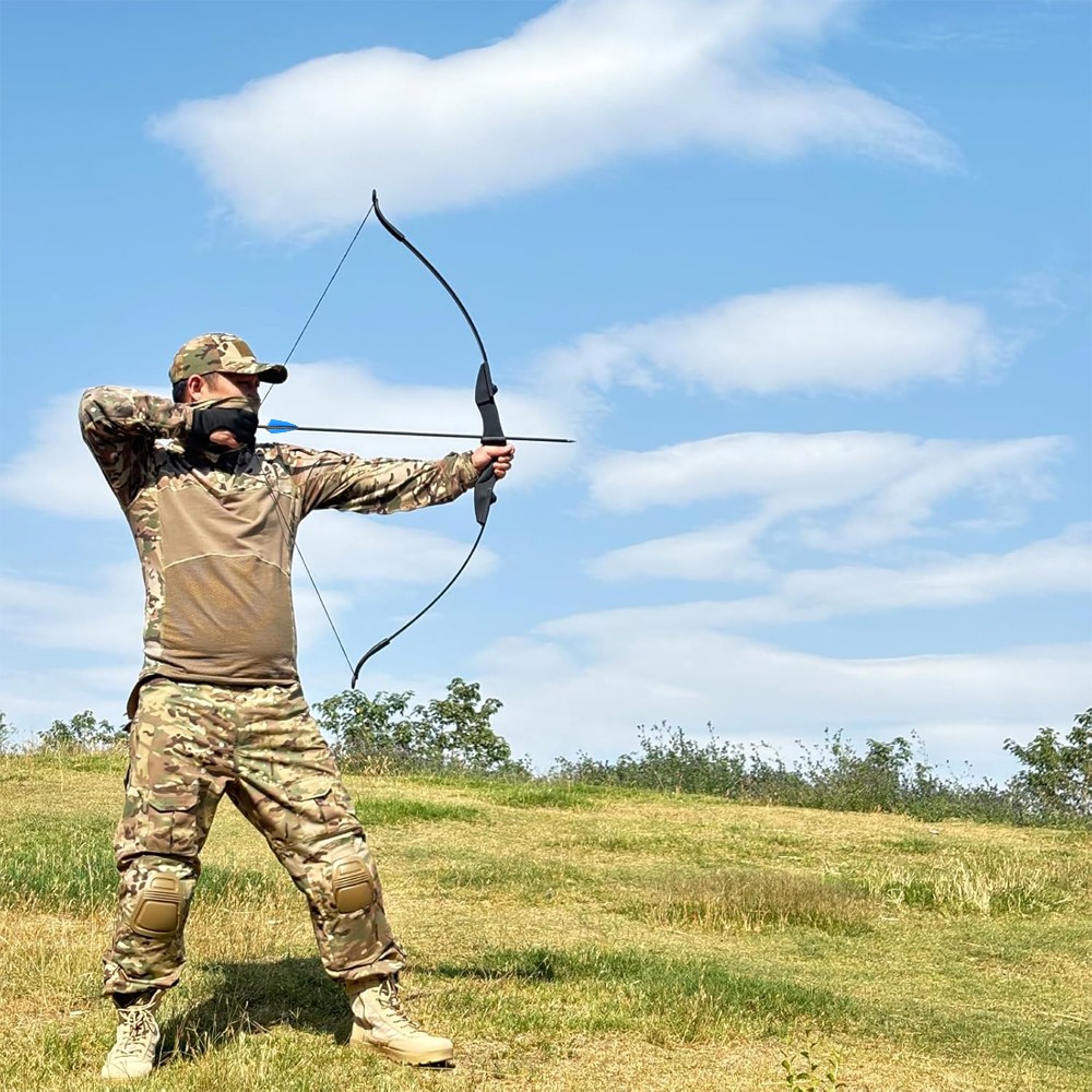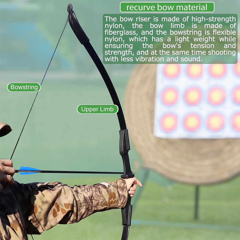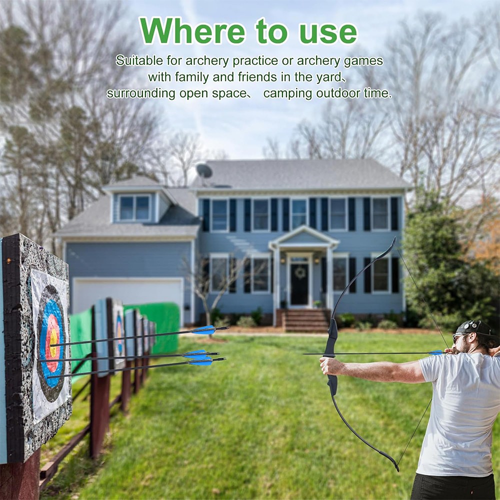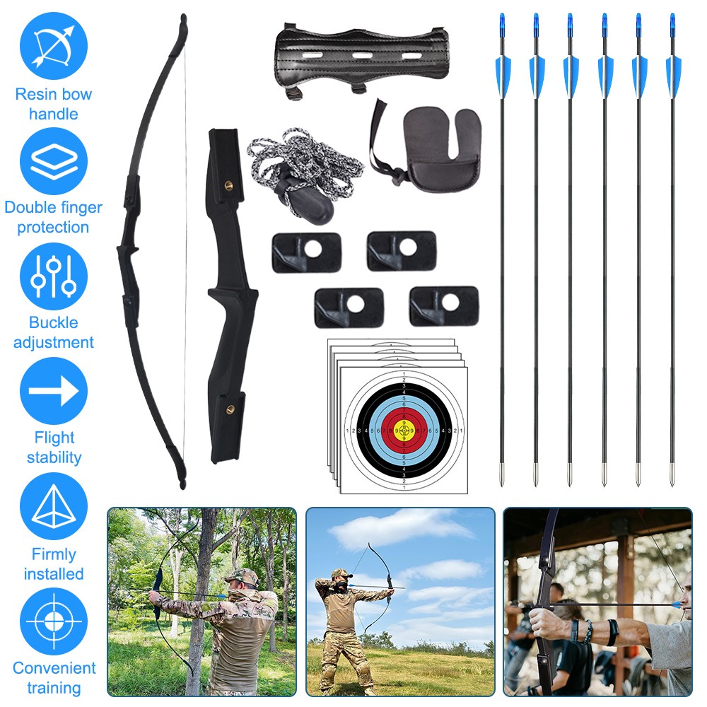 Package include: 1 pc Bow, 6 pcs Fiberglass arrows, 5 pcs Target Faces, 1 pc Arm Guard, 1 pc Finger Guard, 2 pcs String Nocks.