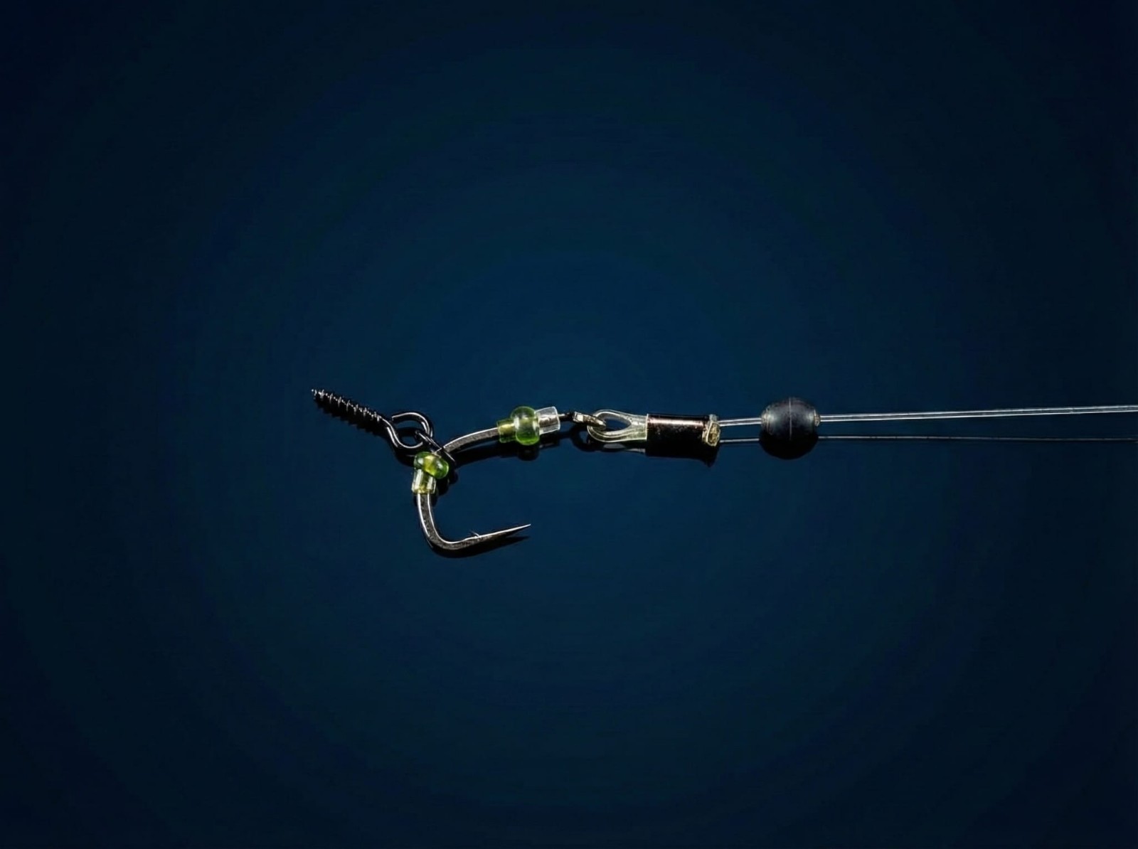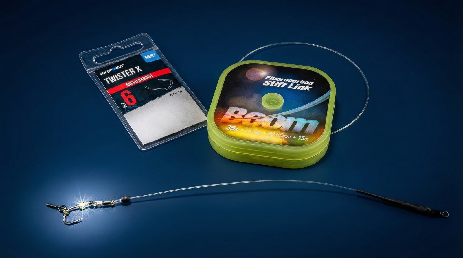 The trace is constructed to best hooking dynamics for carp, with invisible stiff boom fluro, and the Twister design of the hook. The final touch is the tungsten AT tube keeping the rig inline with your main trace.
