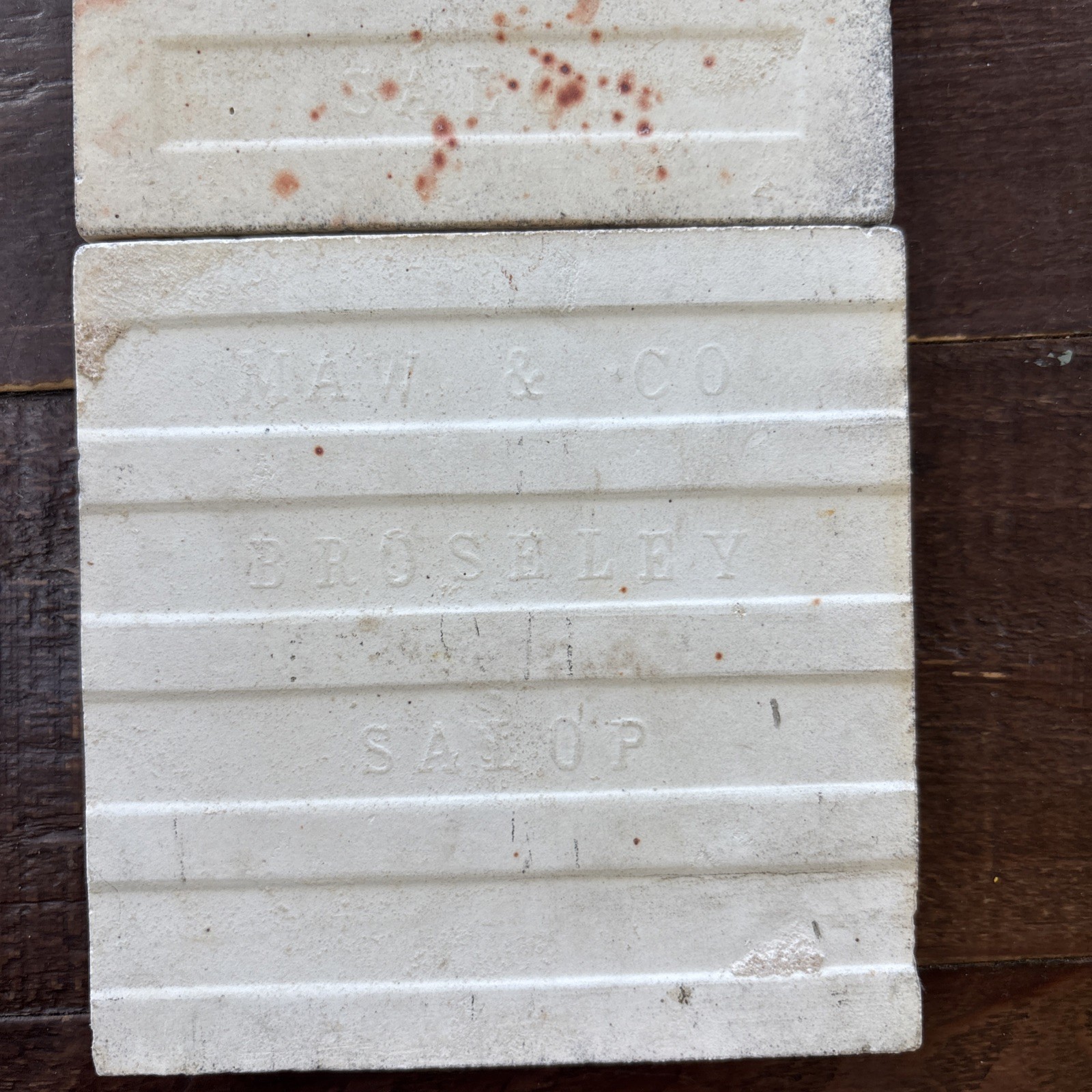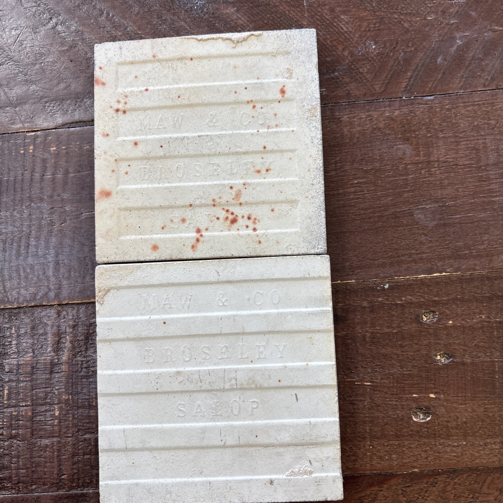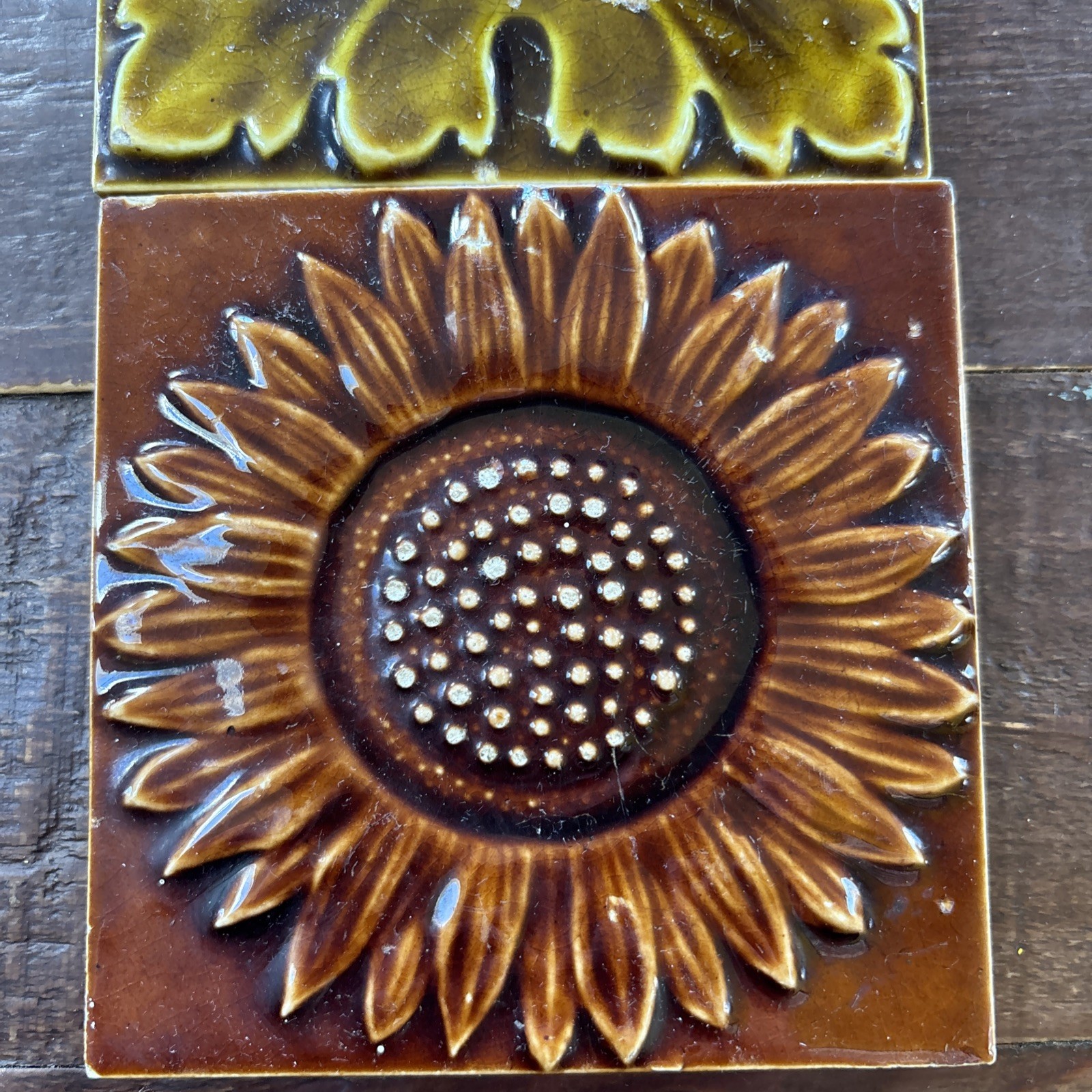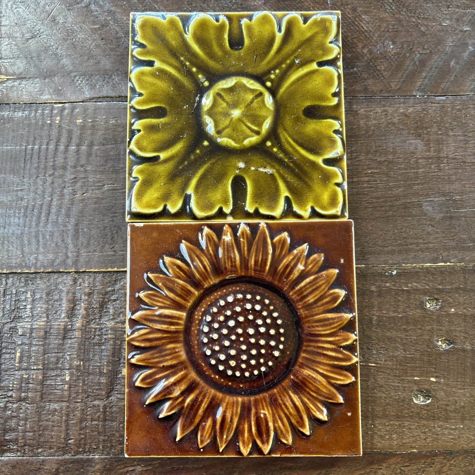 Two really attractive arts & crafts 4 inch Maw & Co tiles depicting a sunflower and a leaf tile. The leaf tile is a beautiful olive green and the sunflower is brown. The sunflower is in good condition with some wear to the centre of the flower, the leaf has a little wear. Both tiles have some light scratching to the surface.