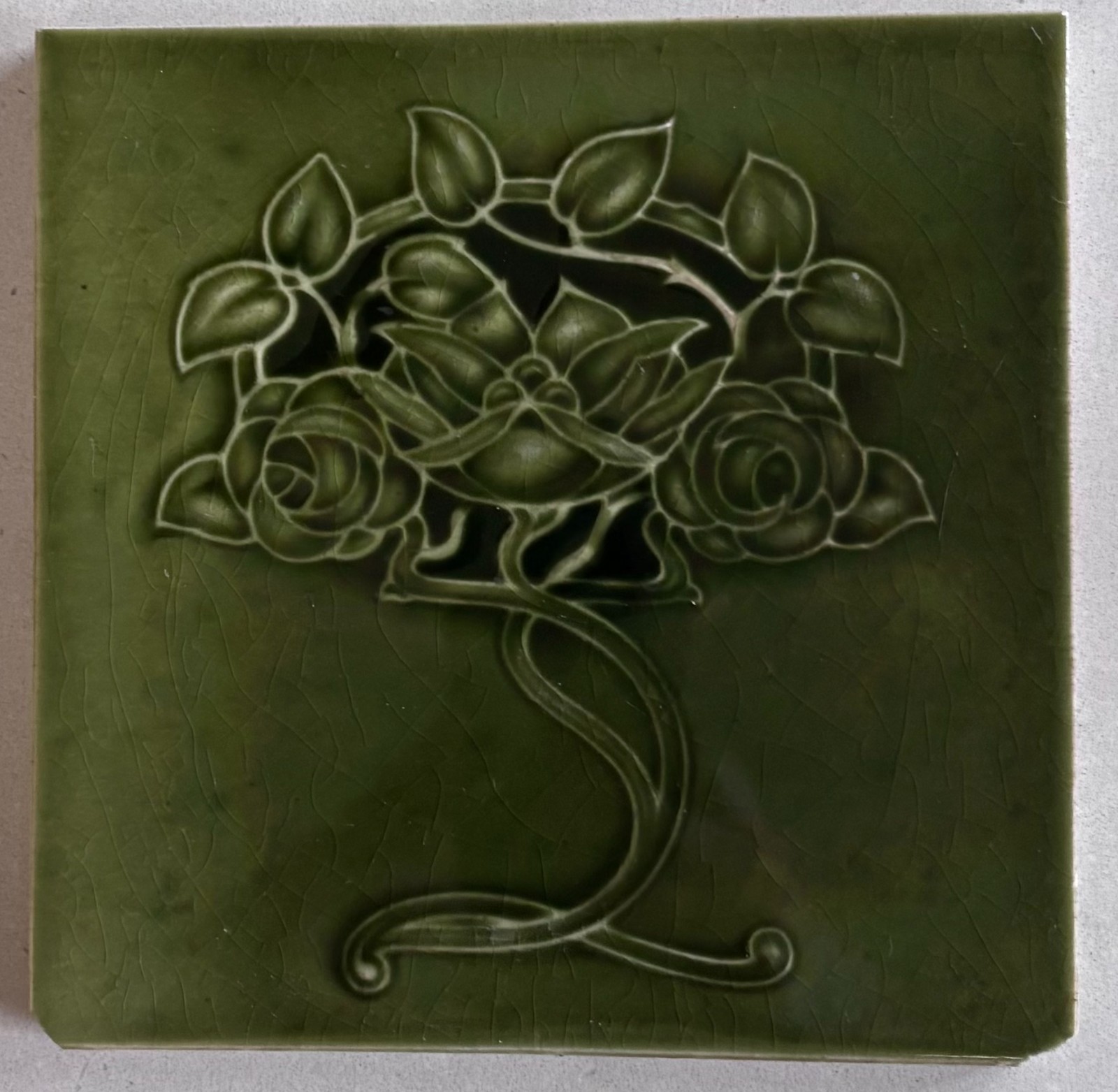 A very lovely 6 inch Sherwin & Cotton green art nouveau tile c1900. This tile is in really good condition with two chips on the bottom right and left hand corner where the tile was installed. This is a very lovely tile.