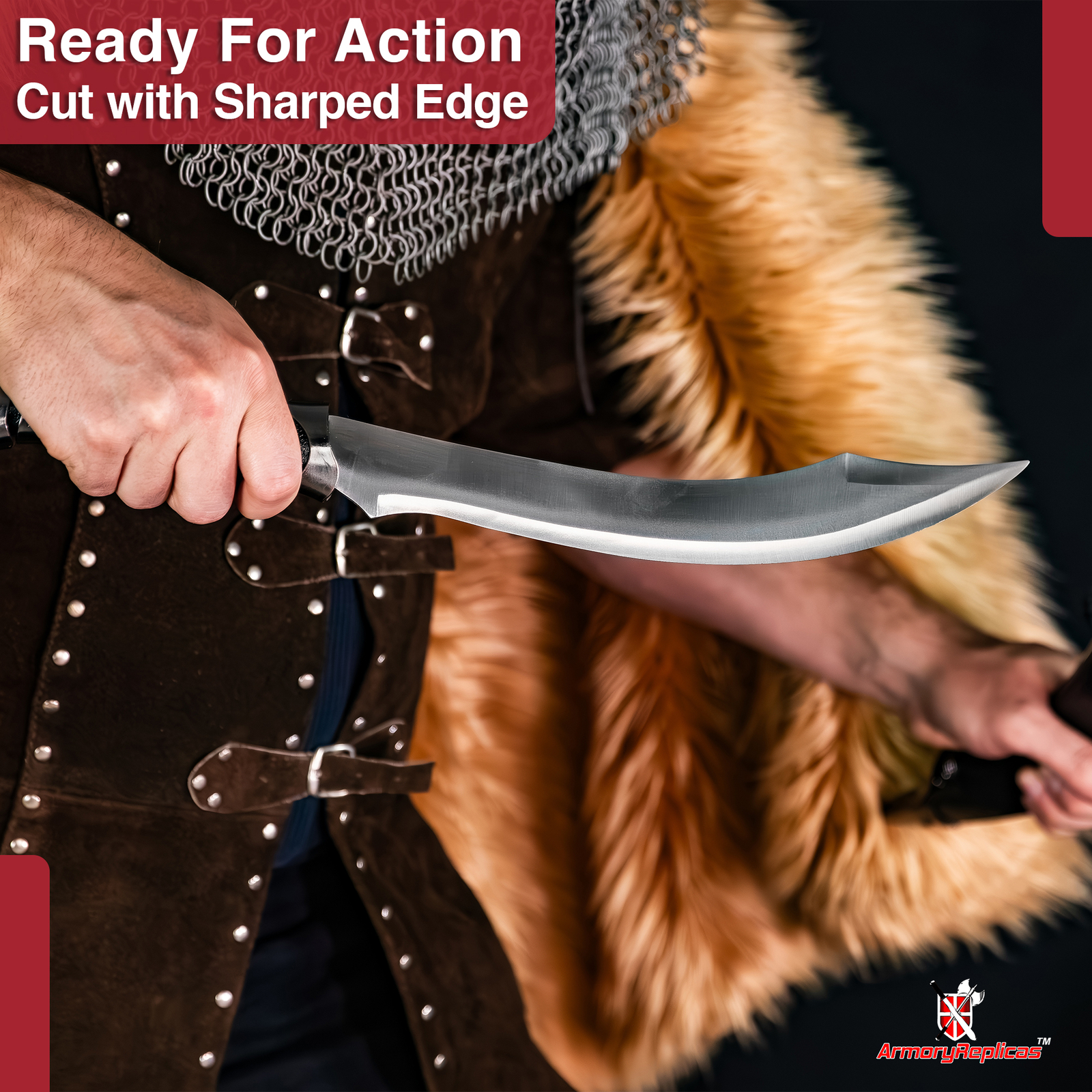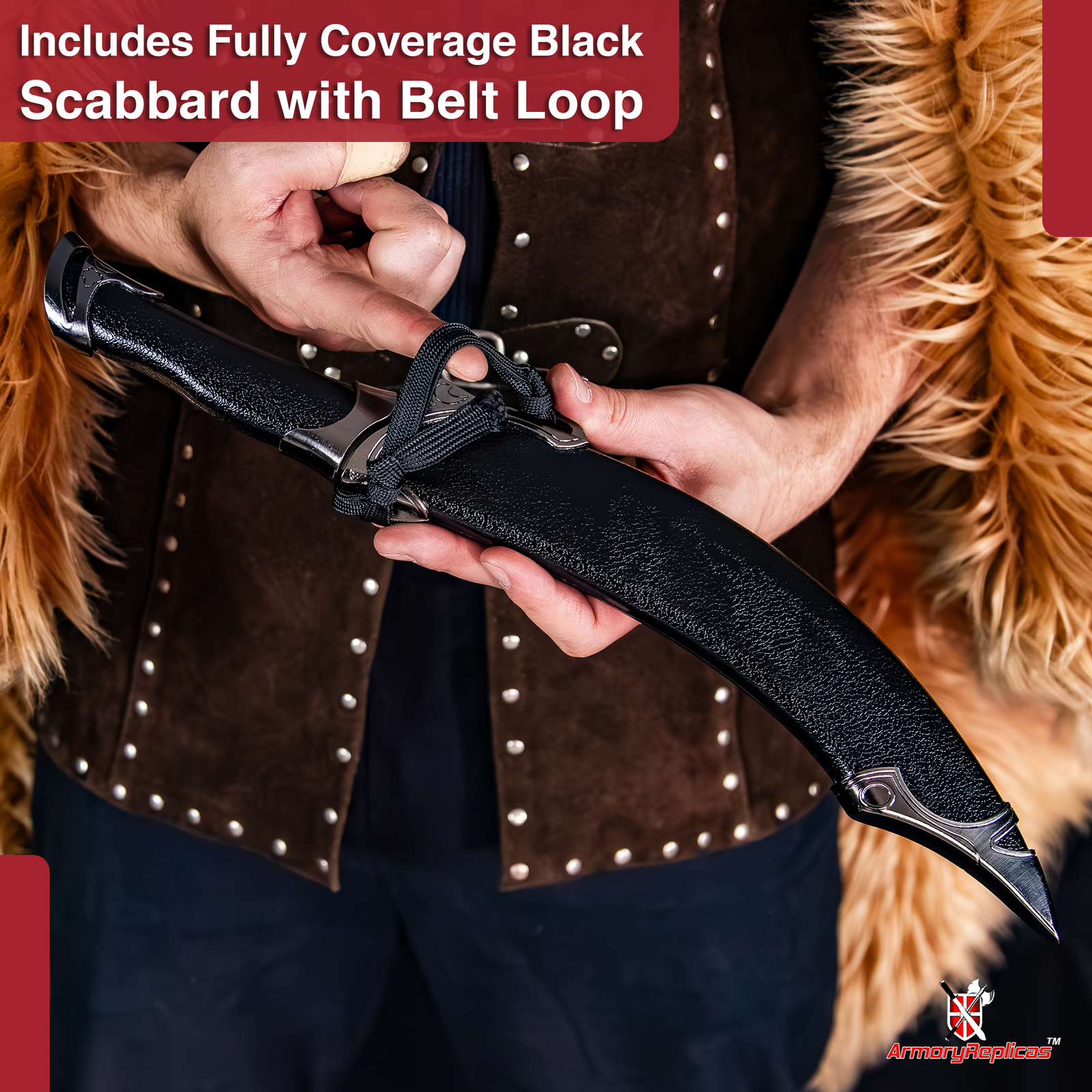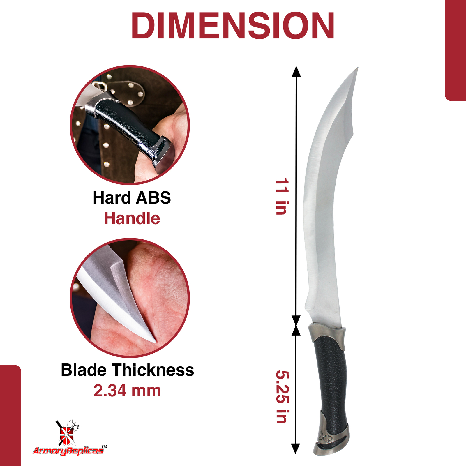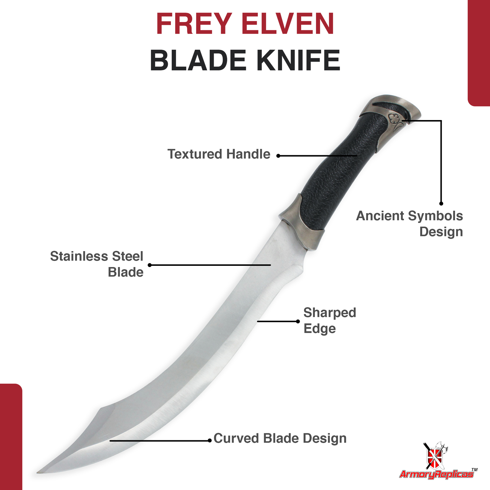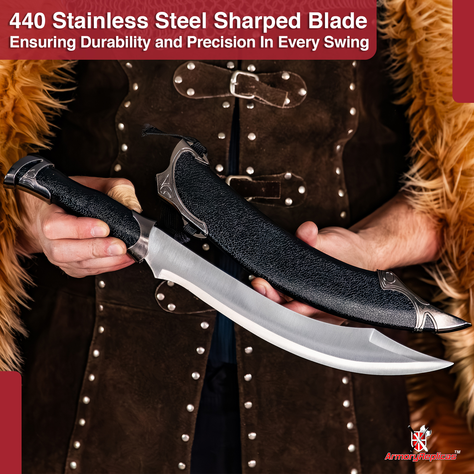 Elven magic is very old and very strong as it resonates from nature. Not only are they great in magic but they are skilled warriors. The Light Elves have been at war for eons with the Elves of Darkness. It is the same old story good versus evil. The Dark Elves want to destroy the Light Elves taking over there kingdom and be able to walk in the daylight again. Fight the forces of evil and protect what is rightfully yours with the Legendary Blade of Frey Elven Short Scimitar. This type of magic in the palm of your hands would be a great advantage. This short scimitar features a stainless steel blade with a black ABS textured handle and zinc aluminum accents. Carved into the handle are two moons and two clovers. The blade comes factory sharp and housed in a scabbard also constructed of a black abs material with zinc aluminum accents with carved ancient symbols. These symbols draw on power from natural making the wielder a natural and skilled warrior. Make sure you have the upper hand in the war between good and evil.