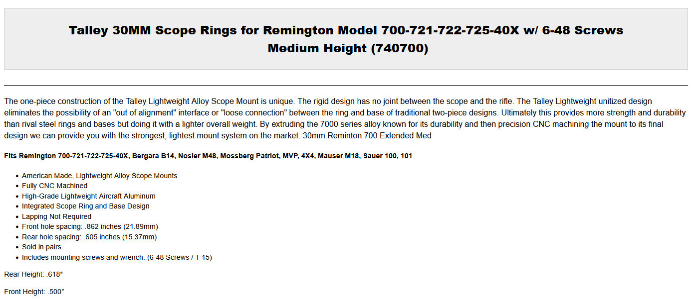 The one-piece construction of the Talley Lightweight Alloy Scope Mount is unique. The rigid design has no joint between the scope and the rifle. The Talley Lightweight unitized design eliminates the possibility of an "out of alignment" interface or "loose connection" between the ring and base of traditional two-piece designs. Ultimately this provides more strength and durability than rival steel rings and bases but doing it with a lighter overall weight. By extruding the 7000 series alloy known for its durability and then precision CNC machining the mount to its final design we can provide you with the strongest, lightest mount system on the market. 30mm Reminton 700 Extended Med