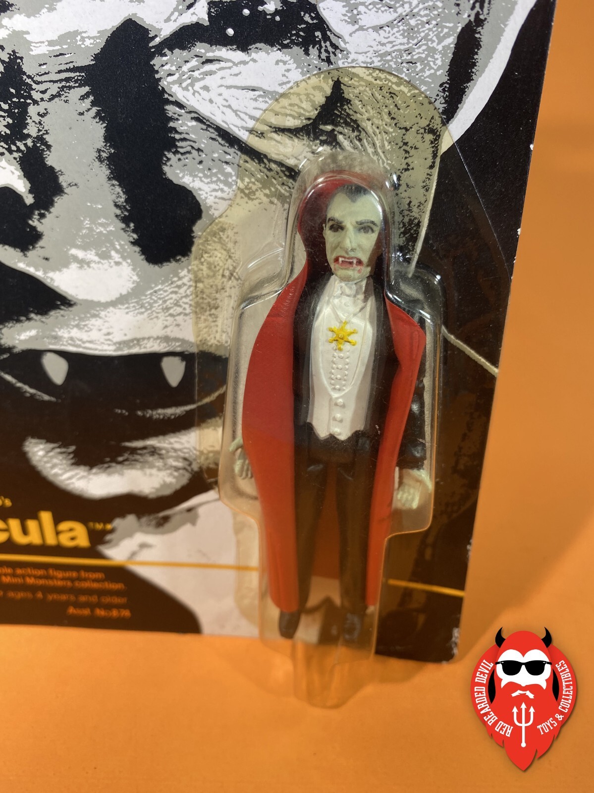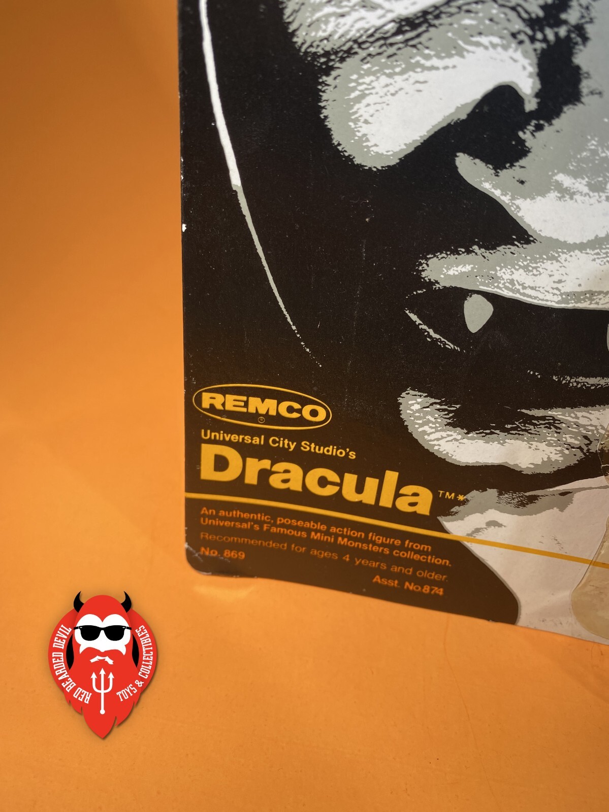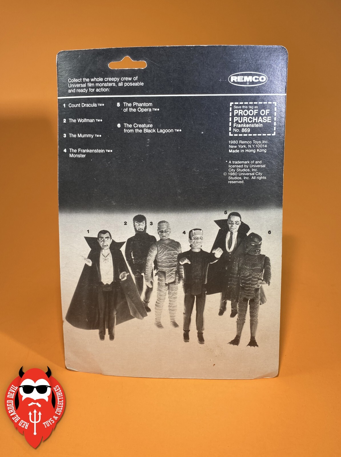 This is one of the (I believe) early releases of these figures, which contains an error on the back of the card. The proof of purchase reads "Frankenstein" instead of "Dracula." This happened on all the Remco mini monsters, but was eventually corrected, making these error cards SUPER RARE.
