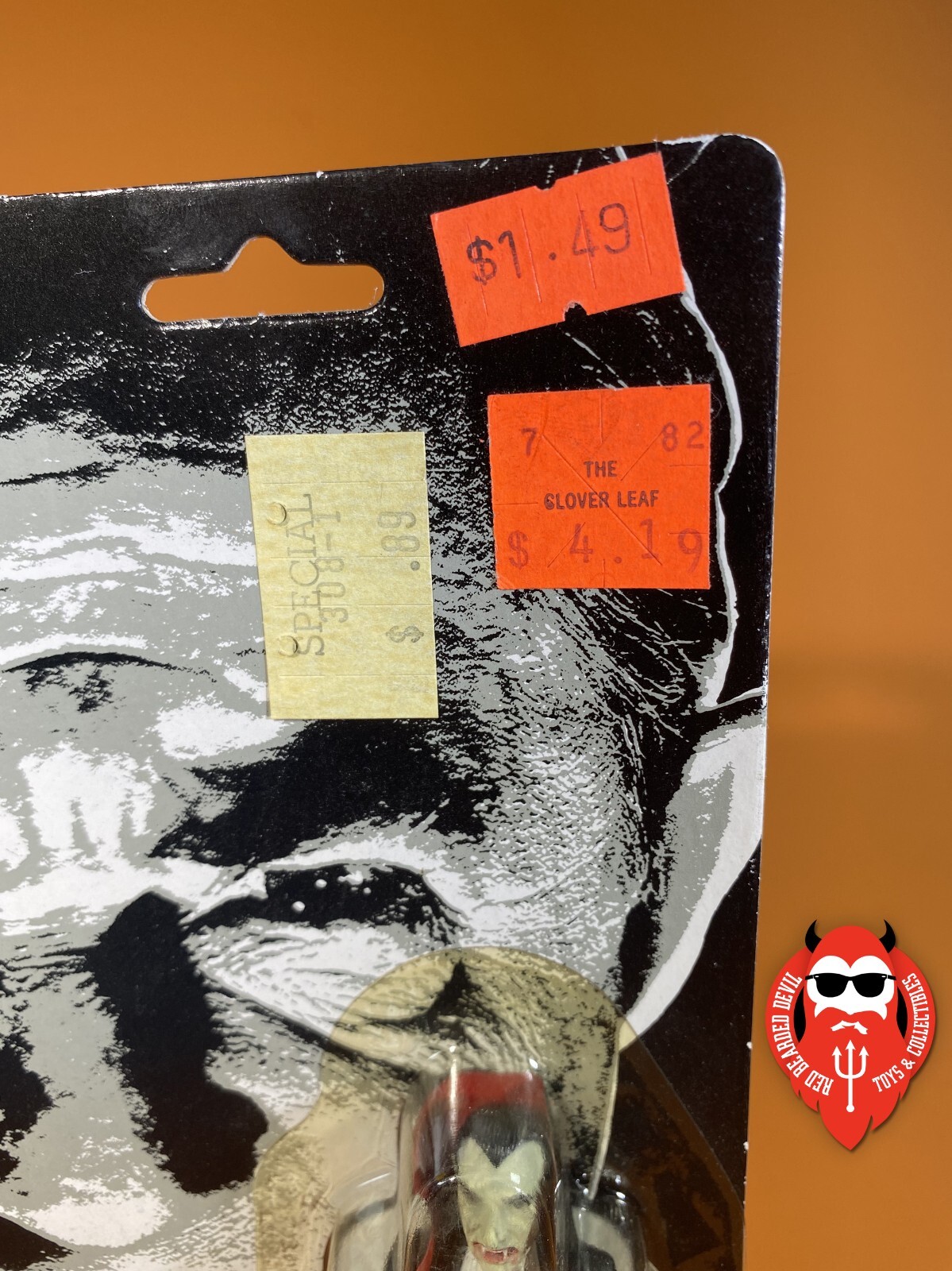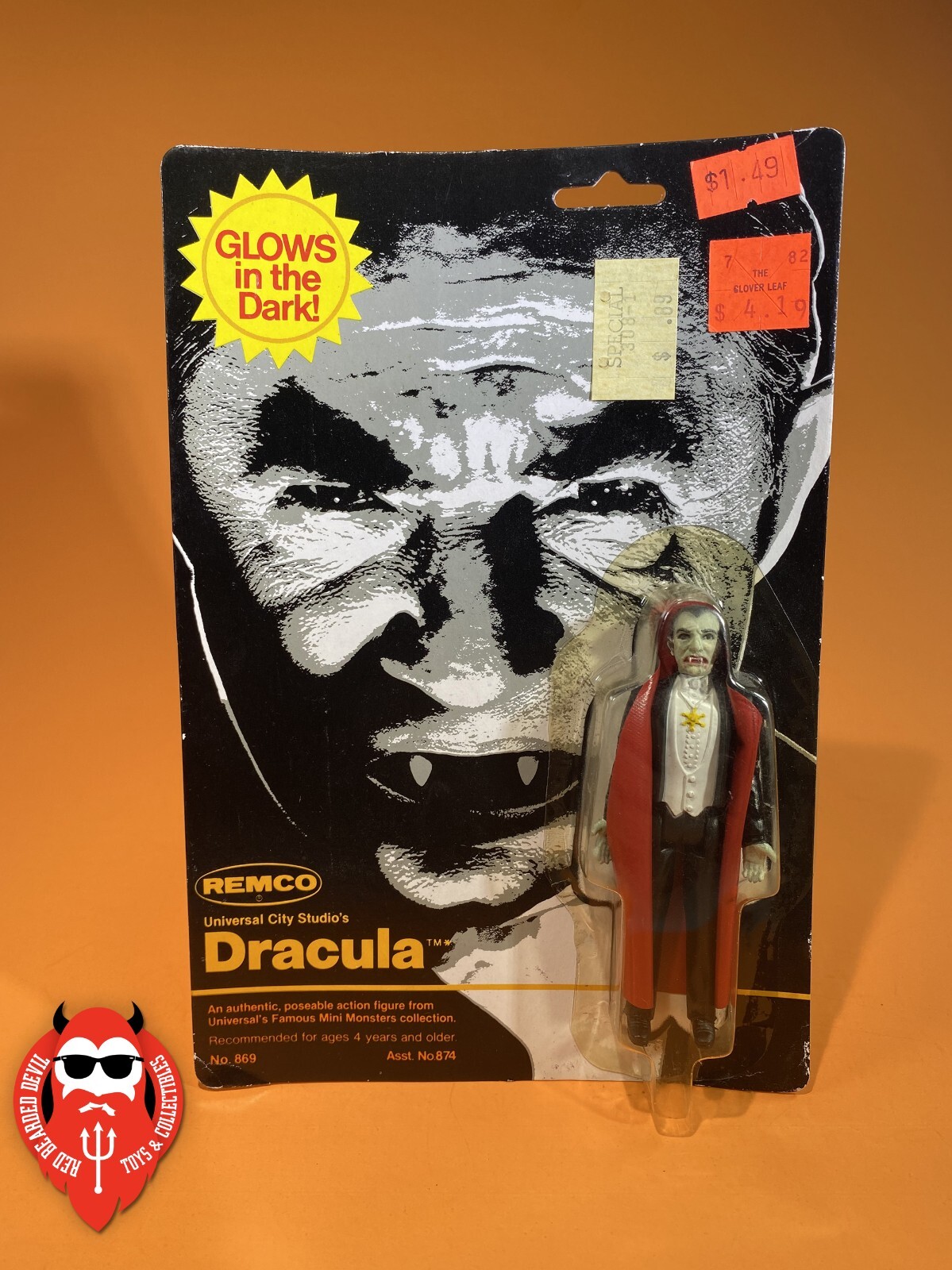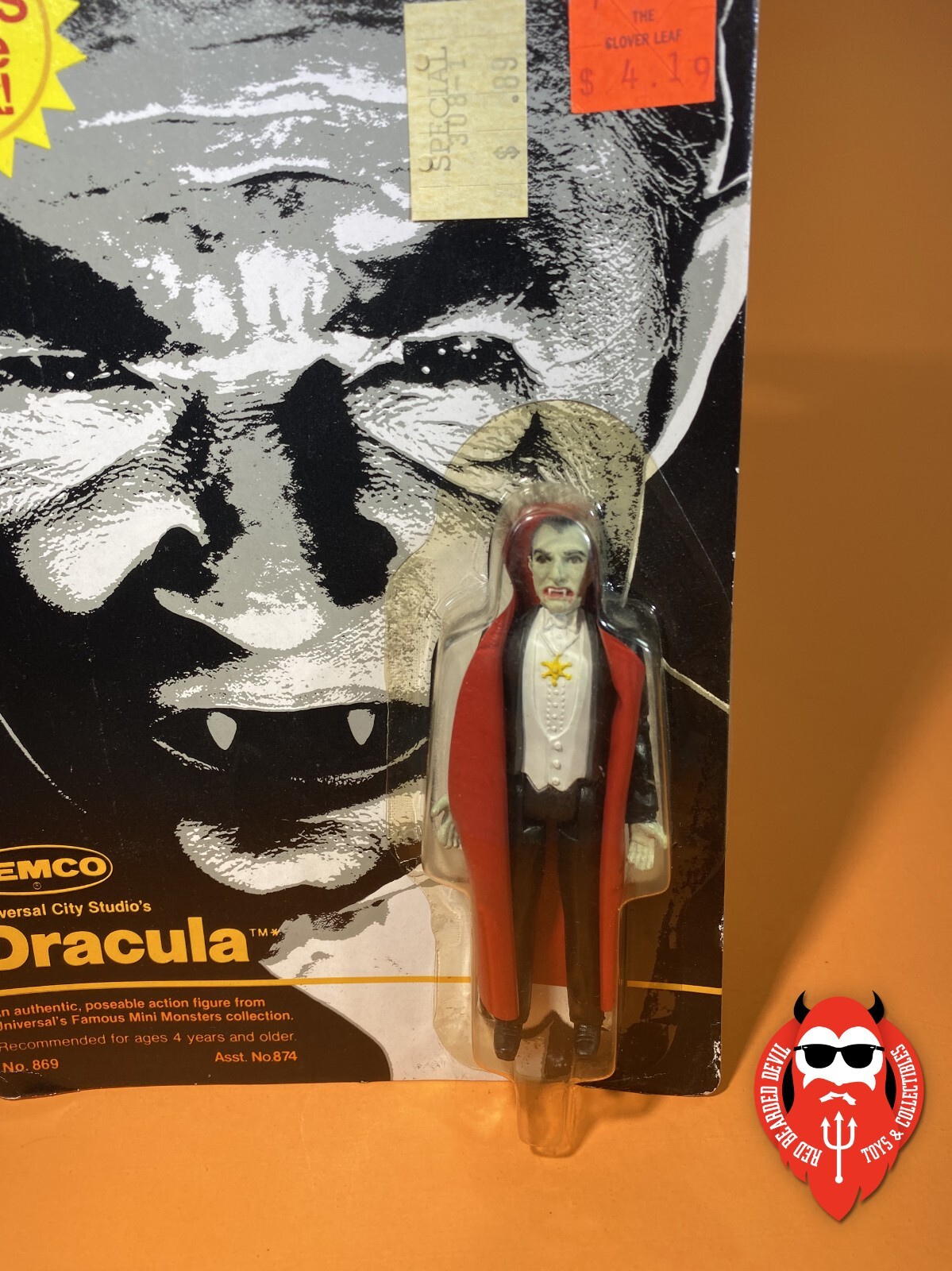 This is one of the (I believe) early releases of these figures, which contains an error on the back of the card. The proof of purchase reads "Frankenstein" instead of "Dracula." This happened on all the Remco mini monsters, but was eventually corrected, making these error cards SUPER RARE.
