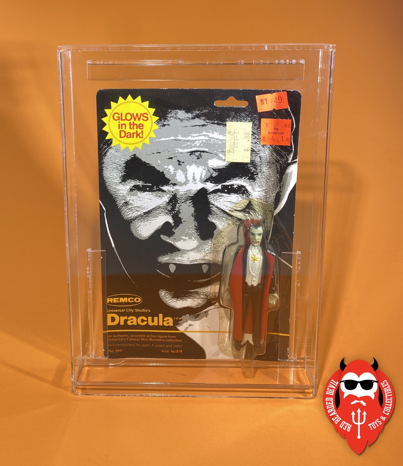The Remco monsters I have listed for sale will all be shipped with an acrylic display case. These cases were originally designed for vintage carded Star Wars figures whose cards are slightly larger, so the Remco figures aren't a perfect fit, but they fit well enough. These aren't the cheaper plastic Star Cases, but rather, are rigid acrylic that provides much better protection (and makes the figures display awesomely). Note: there may be some smudging or scuffing on the acrylic cases, but they're in pretty good condition nontheless.