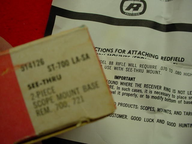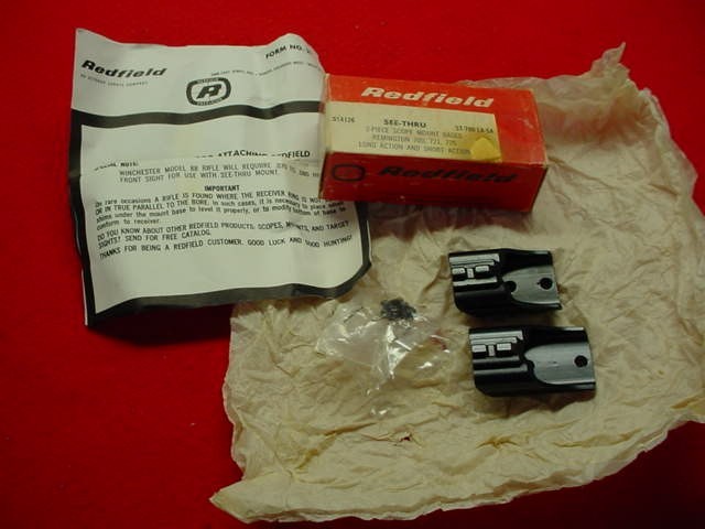 Available for purchase is this set of Redfield # 514126 See Thru Scope Bases for the Remington 700, 721, & 725. Bases are new old stock and all the screws and instructions are included. Questions, just email. Thank you.