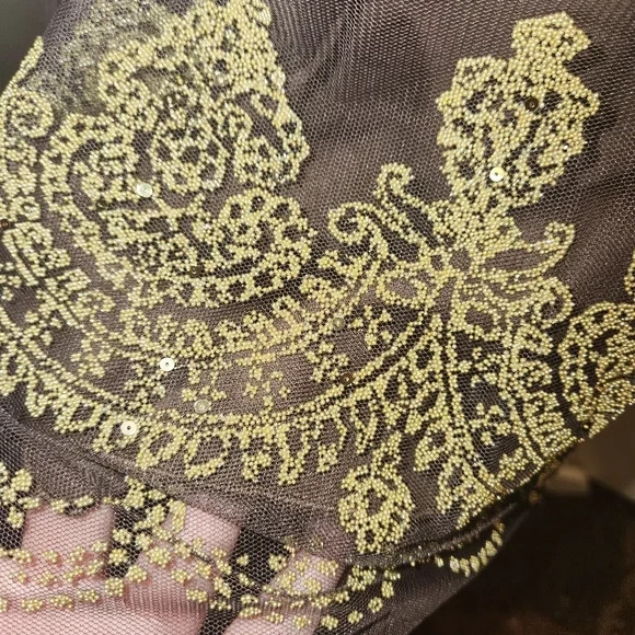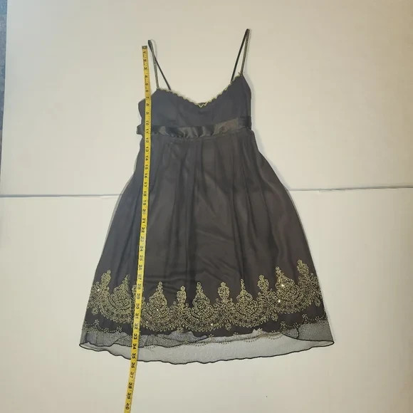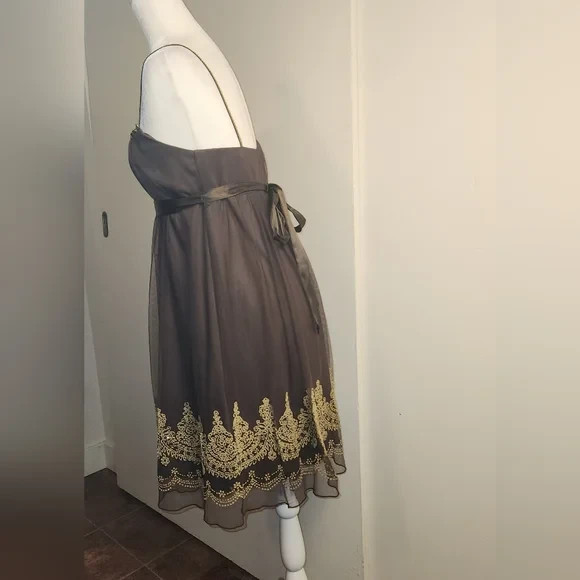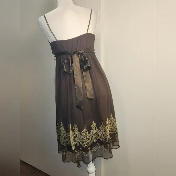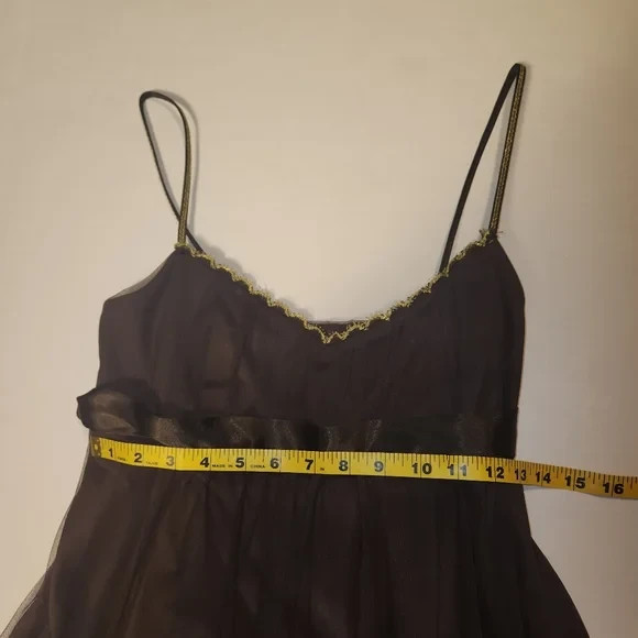 Vintage y2k semi-formal party dress purchased in early 2000s from brand Just Choon. Chocolate Tulle mesh over silky solid lining. Metallic gold embroidery lace on spaghetti straps and at milk maid bust, empire waist with silky tie bow ribbon, and metallic gold beads and sequins at hem. Pull over, stretchy style. Excellent used condition.Size medium. Please see pictures for measurements, care tag, and fabric content.Perfect for a party, the holidays, homecoming, new years eve, or a special occasion. Has a y2k boho, cottagecore, or whimsigoth vibe.