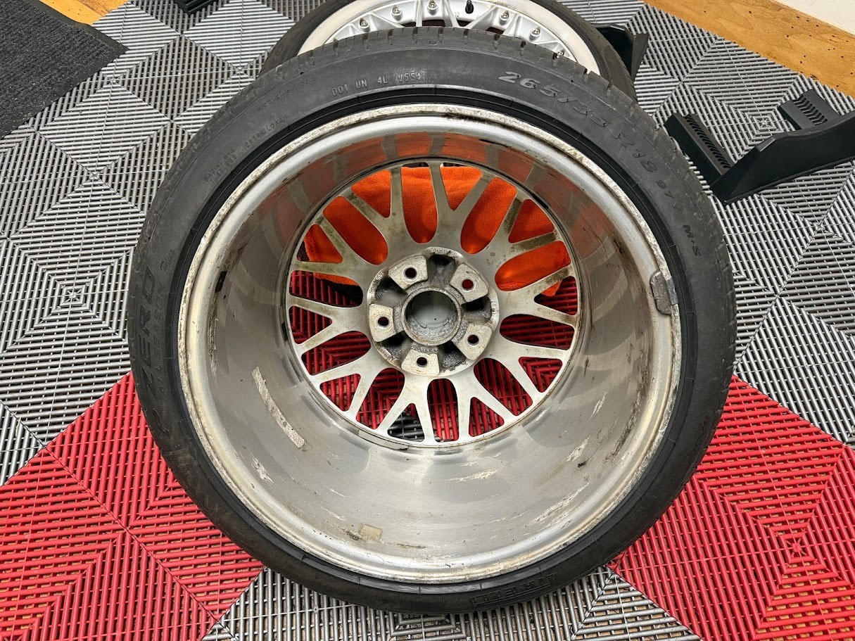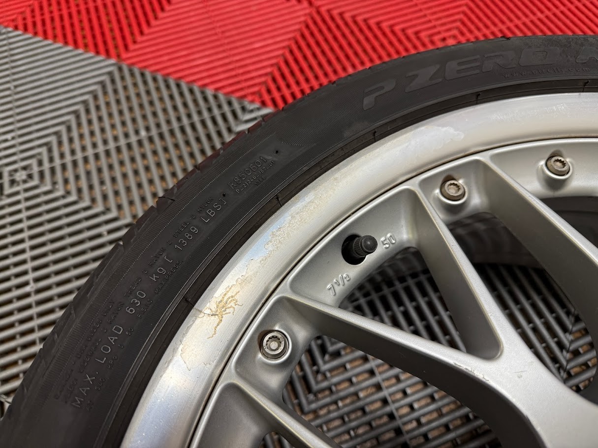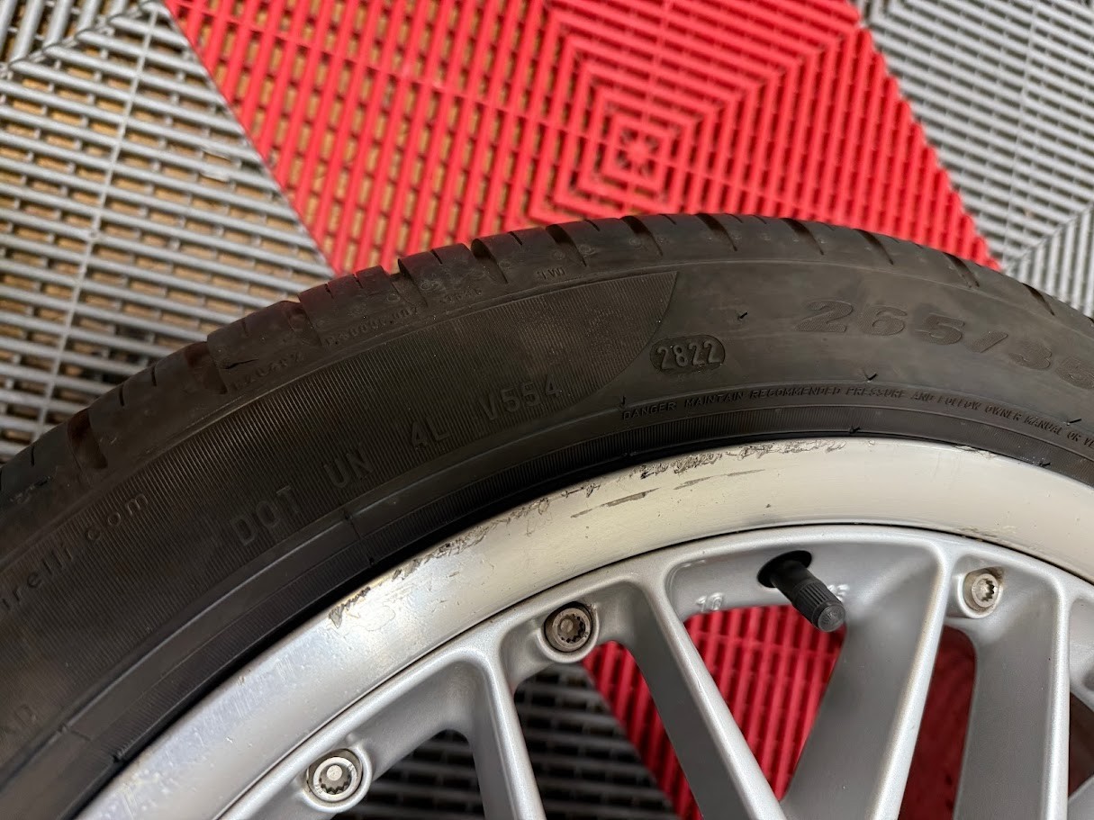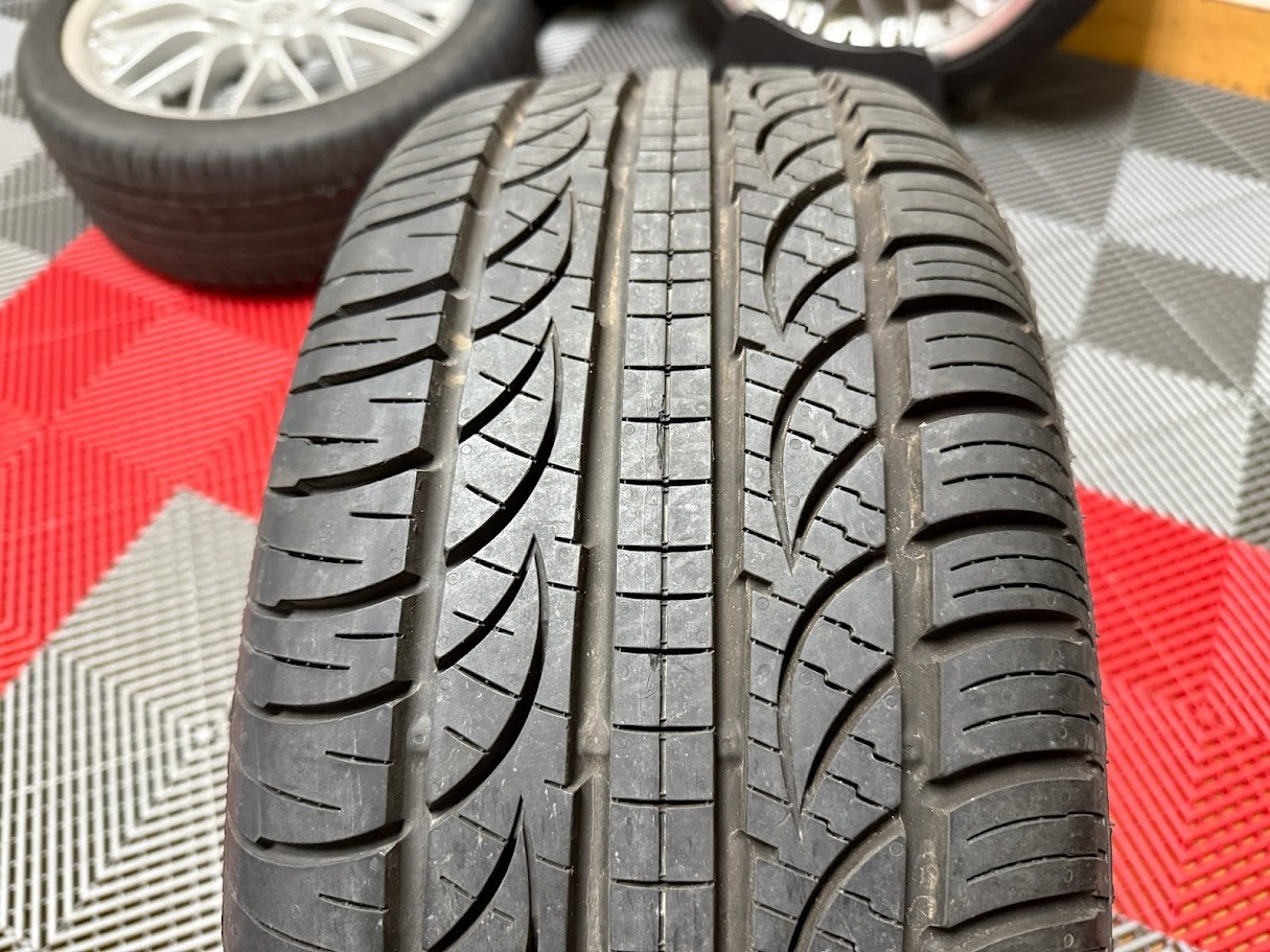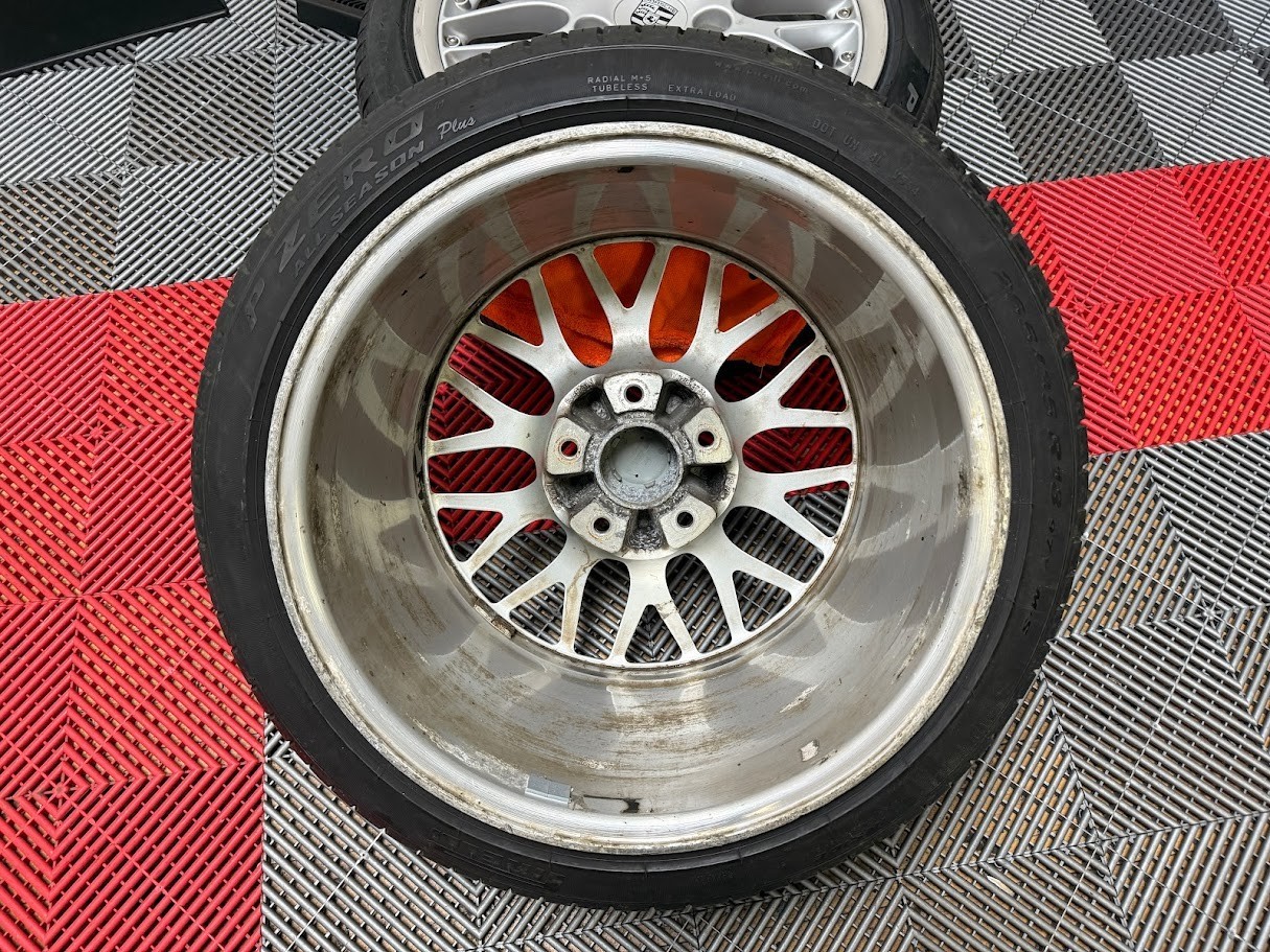 Tires are Pirelli P-Zero Nero in the front, Pirelli P-Zero All-season in the rear. 3 of the tires are like new with 10/32" of tread remaining, one tire is lightly used with 7-8/32" of remaining tread. 2019 date codes on the front tires, 2022 date codes on the rear tires.