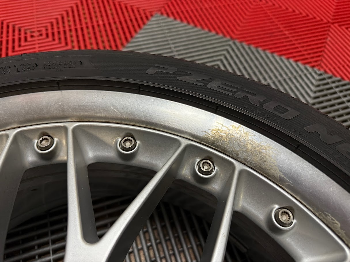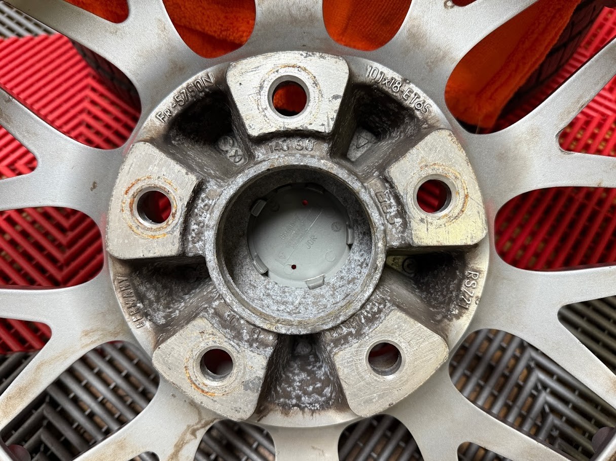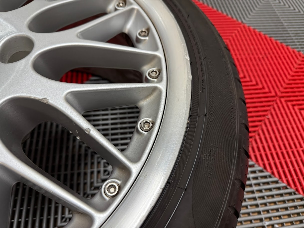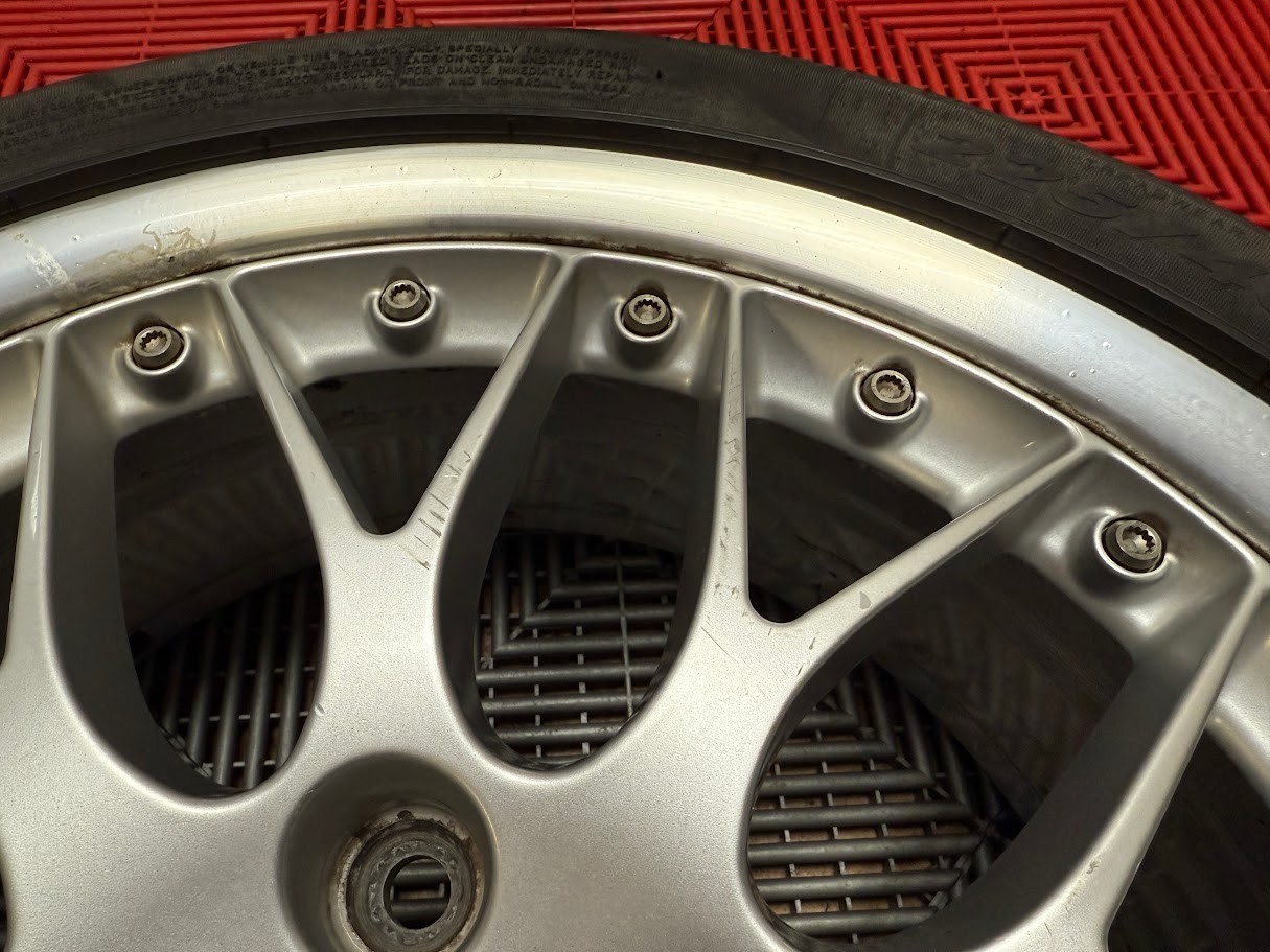 Cosmetically, wheels are in fair condition - about a 7.5/10 overall. Wheels have not been previously refinished, but there are some areas where curb rash has previously been blended and smoothed out. Wheel lips in particular show some oxidation, flaking and chipping in the finish. Faces have some scuffs, scratches and chips. Some brake dust and dirt residue on the inner wheel barrels.