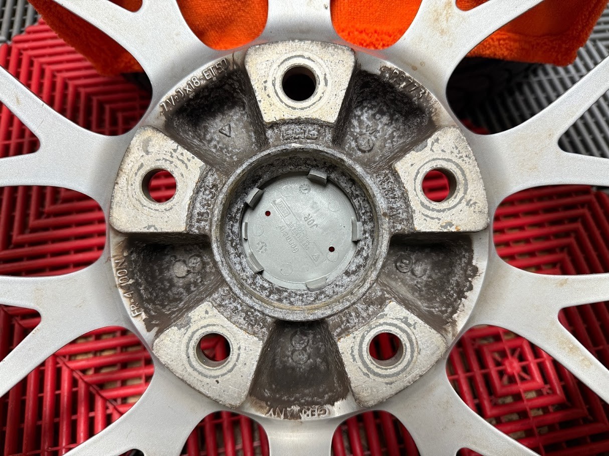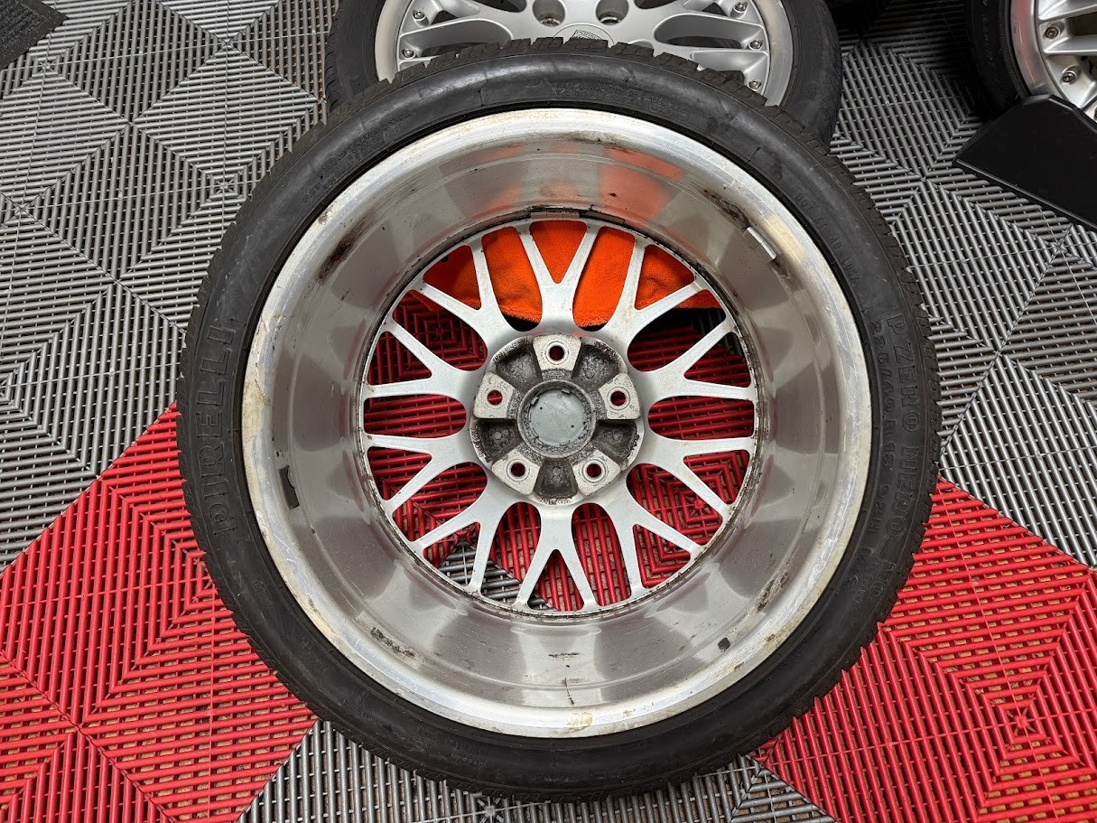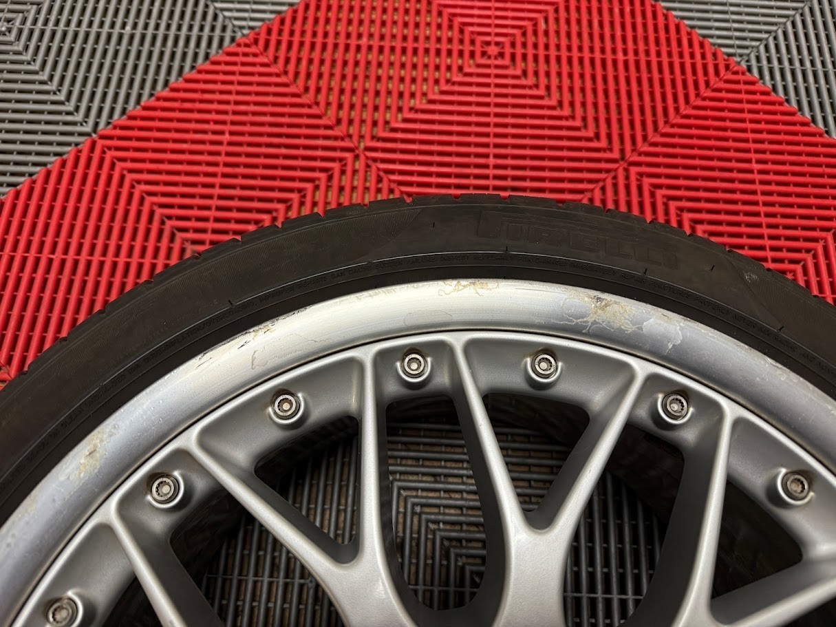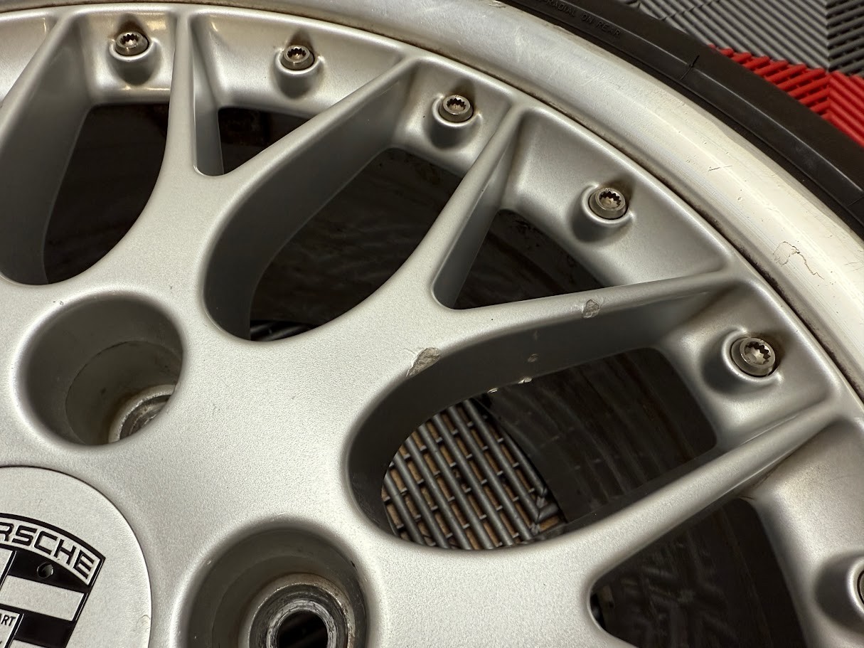 Cosmetically, wheels are in fair condition - about a 7.5/10 overall. Wheels have not been previously refinished, but there are some areas where curb rash has previously been blended and smoothed out. Wheel lips in particular show some oxidation, flaking and chipping in the finish. Faces have some scuffs, scratches and chips. Some brake dust and dirt residue on the inner wheel barrels.