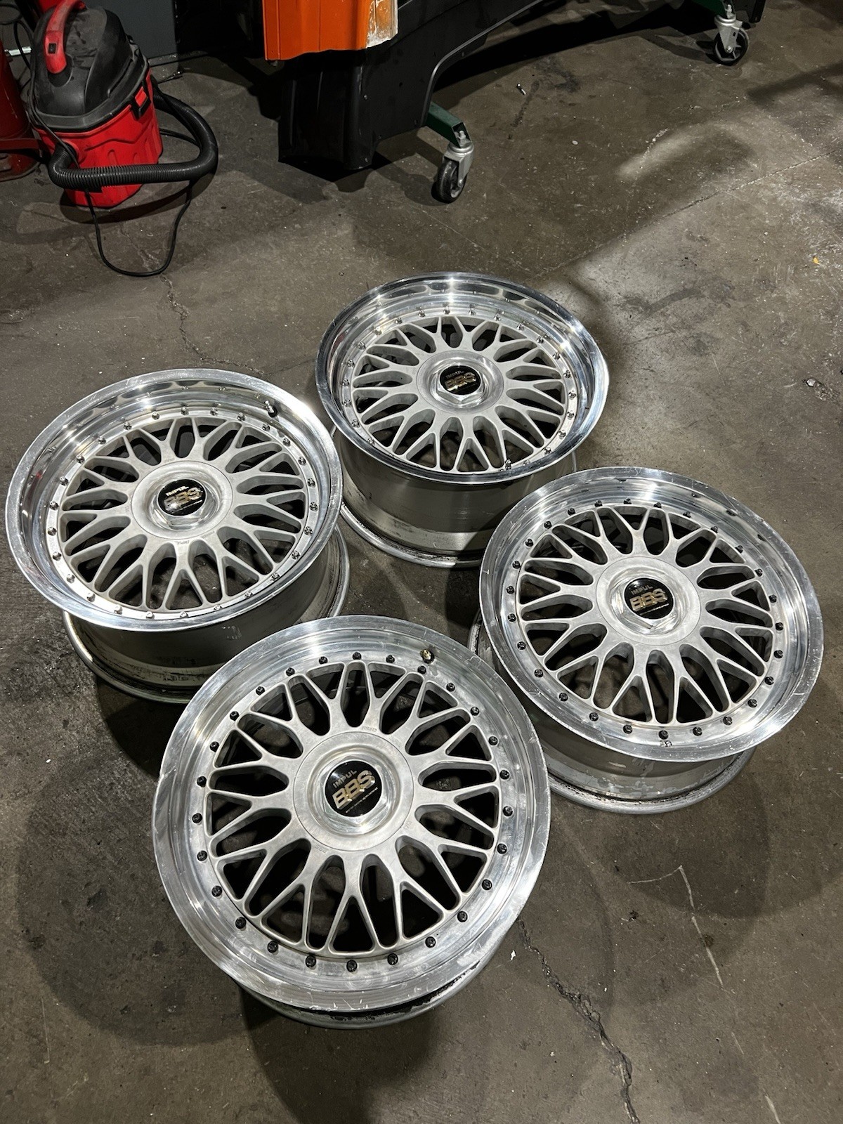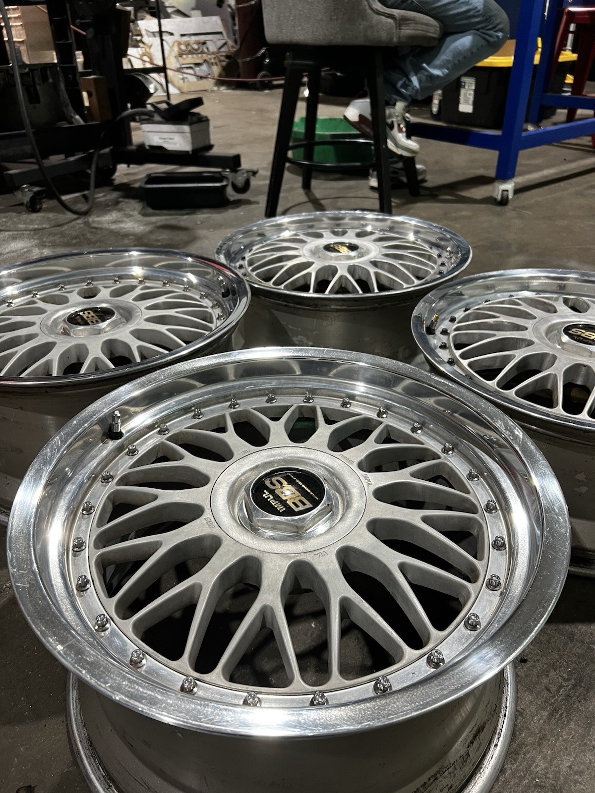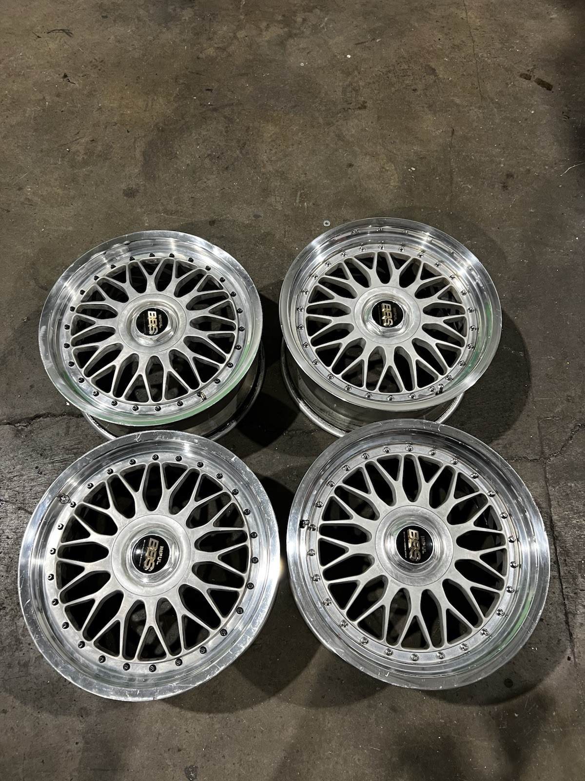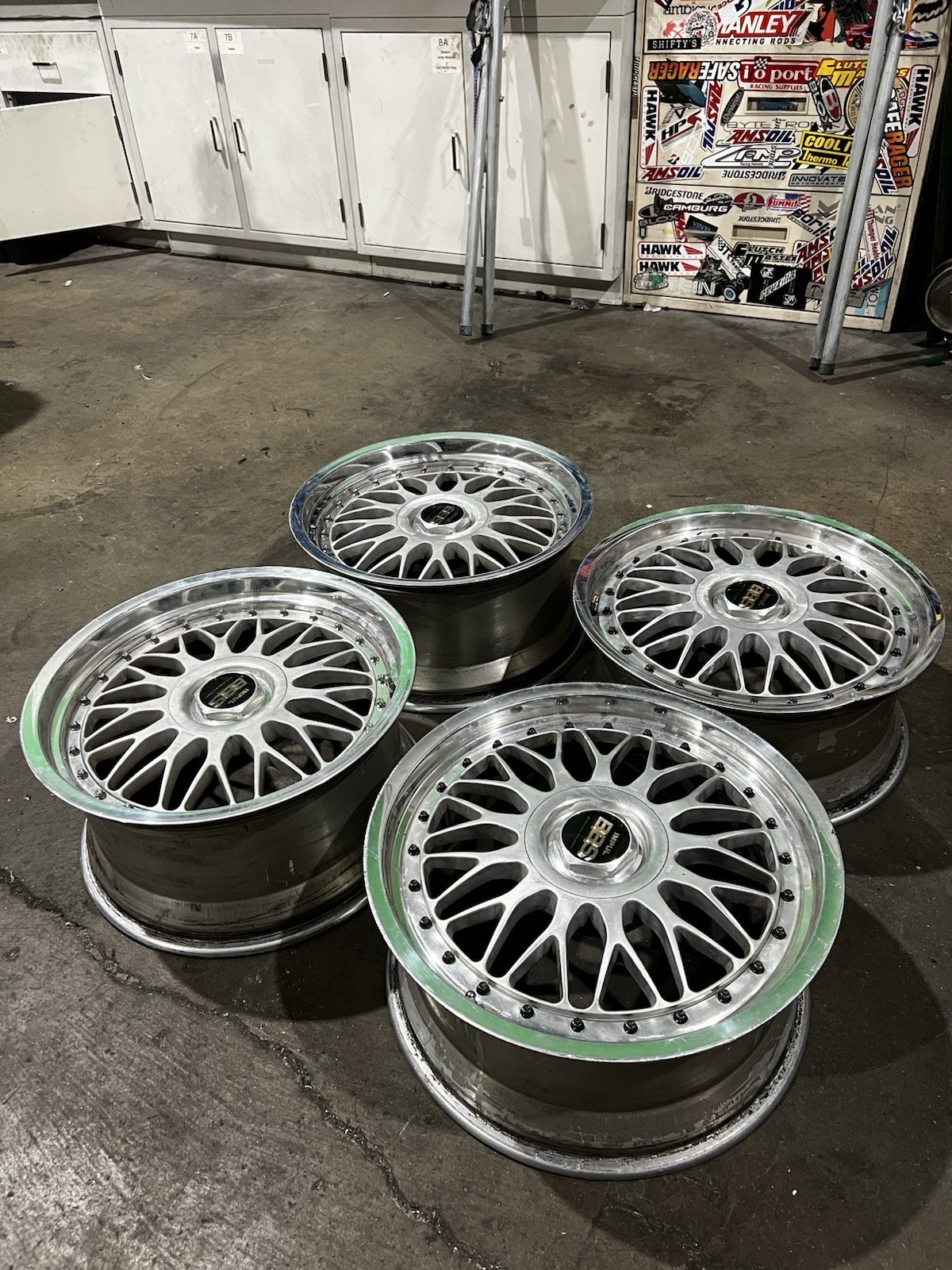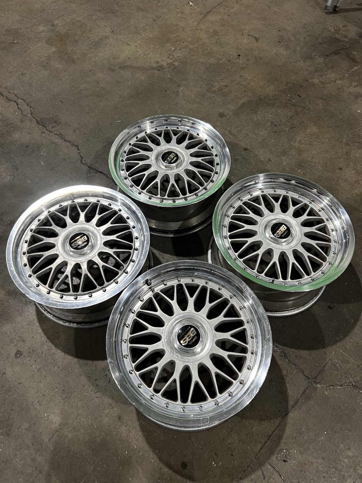 The 18' BBS IMPUL M1 COLLAB WHEELS SET OF 4 is a high-quality set of wheels designed for cars Featuring a sleek silver color and a mesh style design, these wheels are constructed with a two-piece design and come with a wheel center cap. With a bolt pattern of 5x114.3, these wheels have a rim diameter of 18 inches and a rim width of 8 inches in the front and 9 inches wide wheels in the rear. these wheels have a 38mm offset and the 8 inches pair in the front has been taken apart and new chrome hardware was used and kept original hardware in bag if wanted