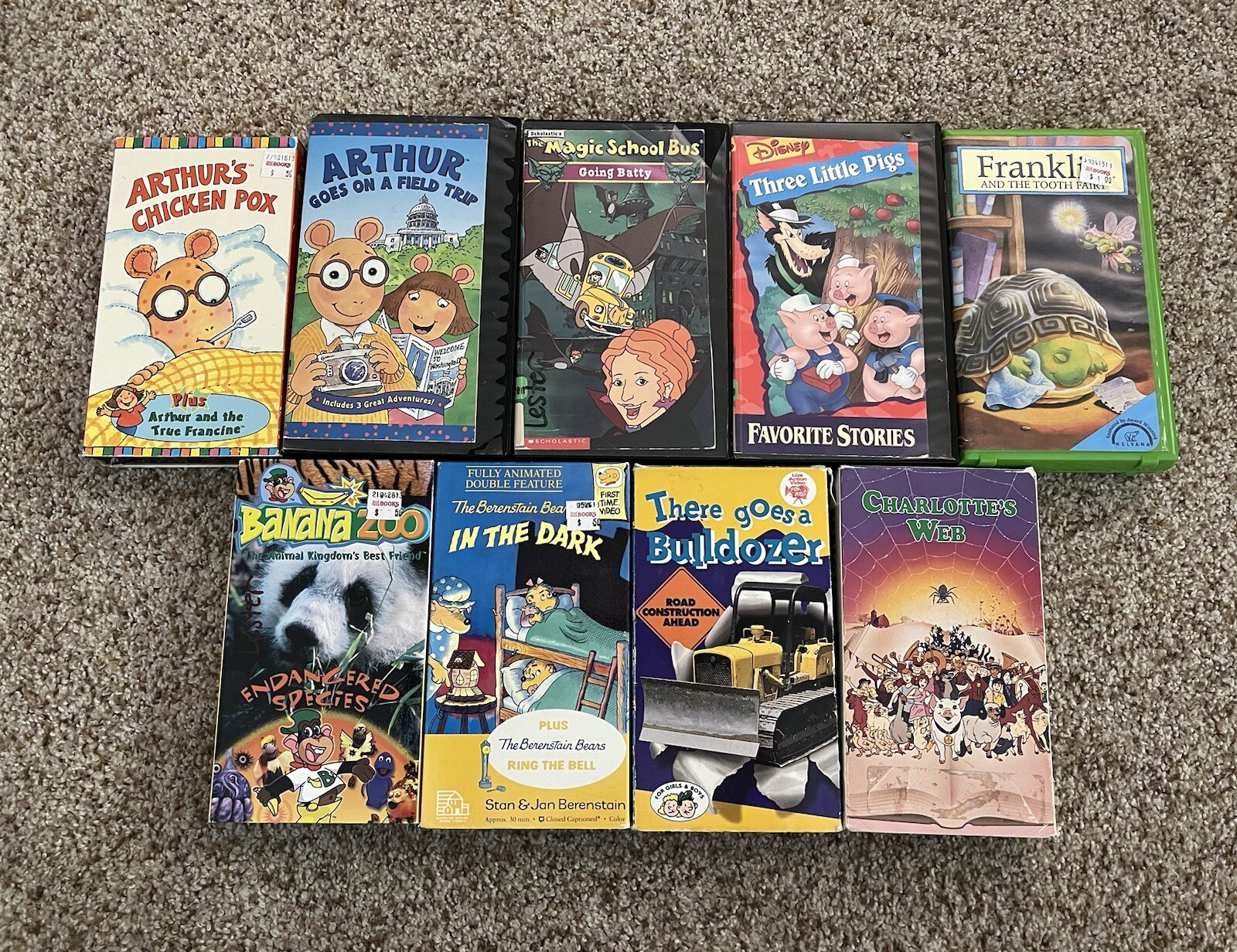 Looking for a nostalgic trip down memory lane? Look no further than this 1990's Kids VHS Movie lot. This collection includes 9 classic movies featuring beloved characters like Arthur, Franklin, and Charlottes Web. Perfect for a family movie night or a trip down memory lane, these VHS tapes are sure to bring back fond memories. Don't miss out on the chance to add this rare collection to your movie library.