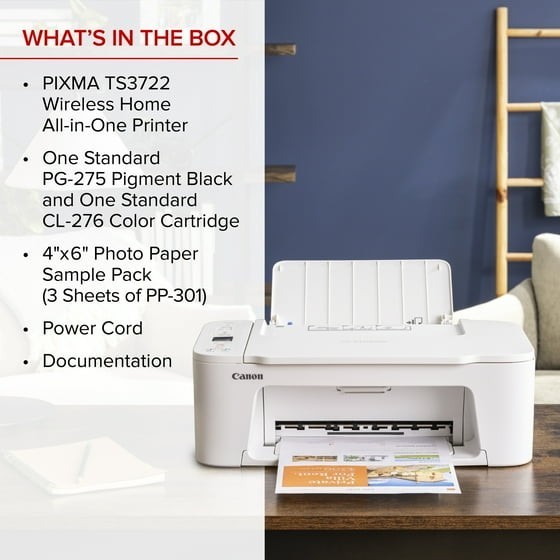 This Canon PIXMA TS3722 All-in-One inkjet printer is designed to bring high-quality printing, scanning, and copying to your home with ease. Compact yet powerful, it offers seamless wireless connectivity and versatility for all your printing needs. Whether you're printing documents or vivid photos, this printer delivers fast, reliable, and high-quality results.