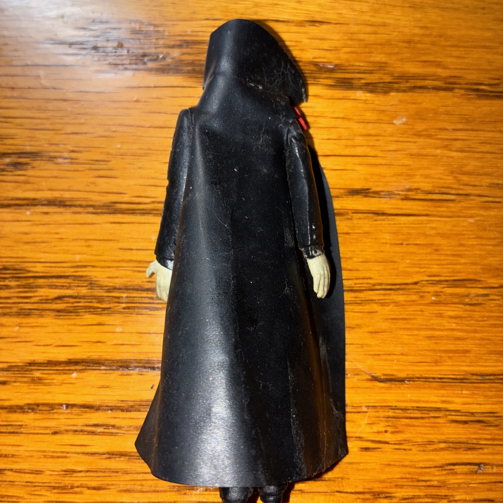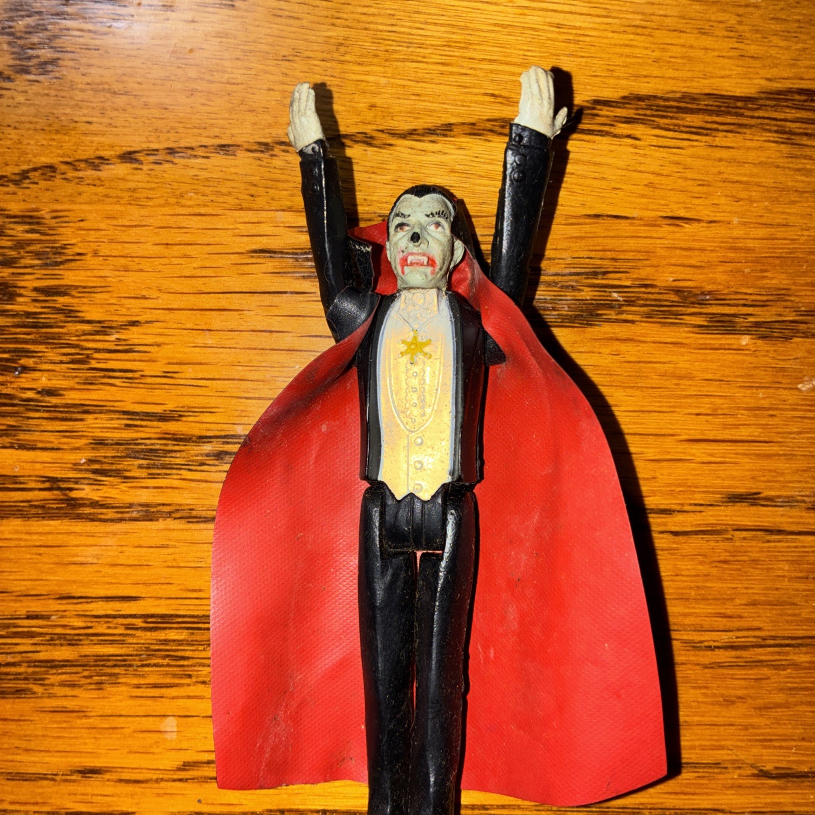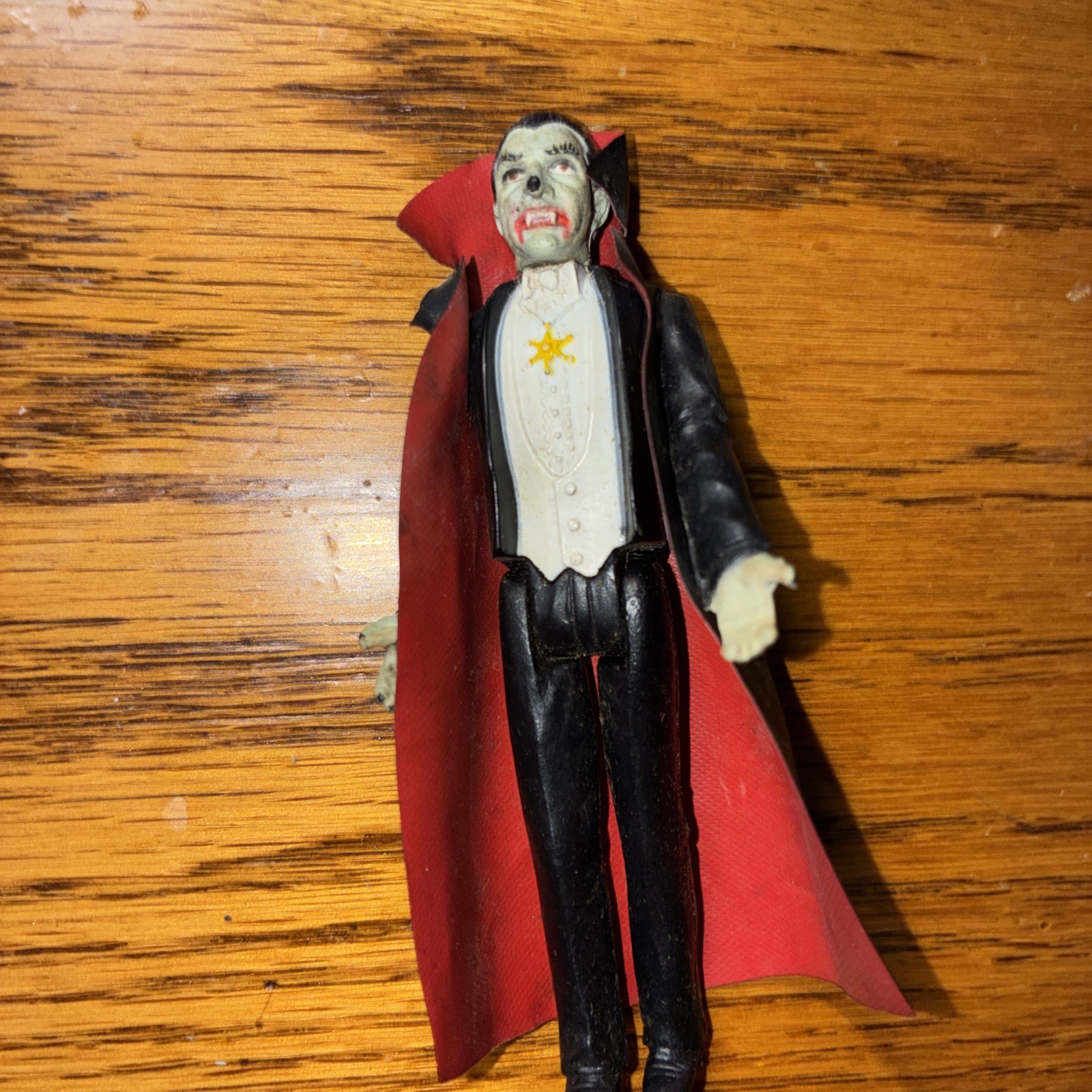 The product is a vintage 1980 Dracula action figure from the Universal Monsters franchise. This 3.75-inch figure comes with an original black cape. Hands and face glow in the dark after exposure to bright light, adding a unique and creepy touch to the toy. Produced by Remco, this collectible item represents the iconic character Dracula from the horror and sci-fi genre, making it a must-have for fans of classic monster movies. With its vintage appeal and glow-in-the-dark feature, this Dracula figure is sure to be a standout addition to any action figure collection.