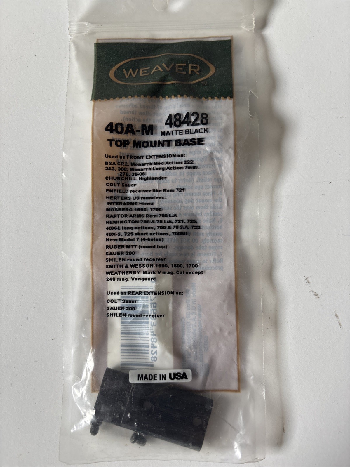 The Weaver Top-Mount Scope Base #40A-M matte #48428 is a high-quality scope base designed for rifles such as BSA and Remington 700 SA. Made of durable aluminum, this matte scope base features a Weaver mount for easy installation and a variety of ring heights to suit different needs. It is ideal for hunting and sports shooting activities, providing a stable and reliable mounting location for scopes on the receiver. Proudly made in the United States, this scope base ensures precision and accuracy in your shooting experience.