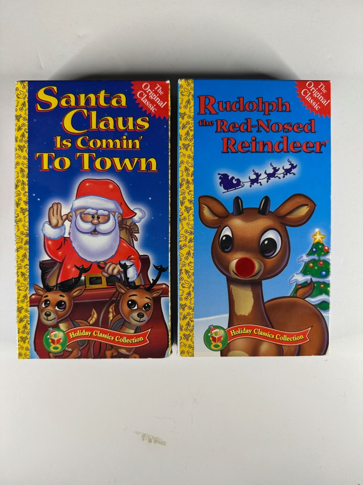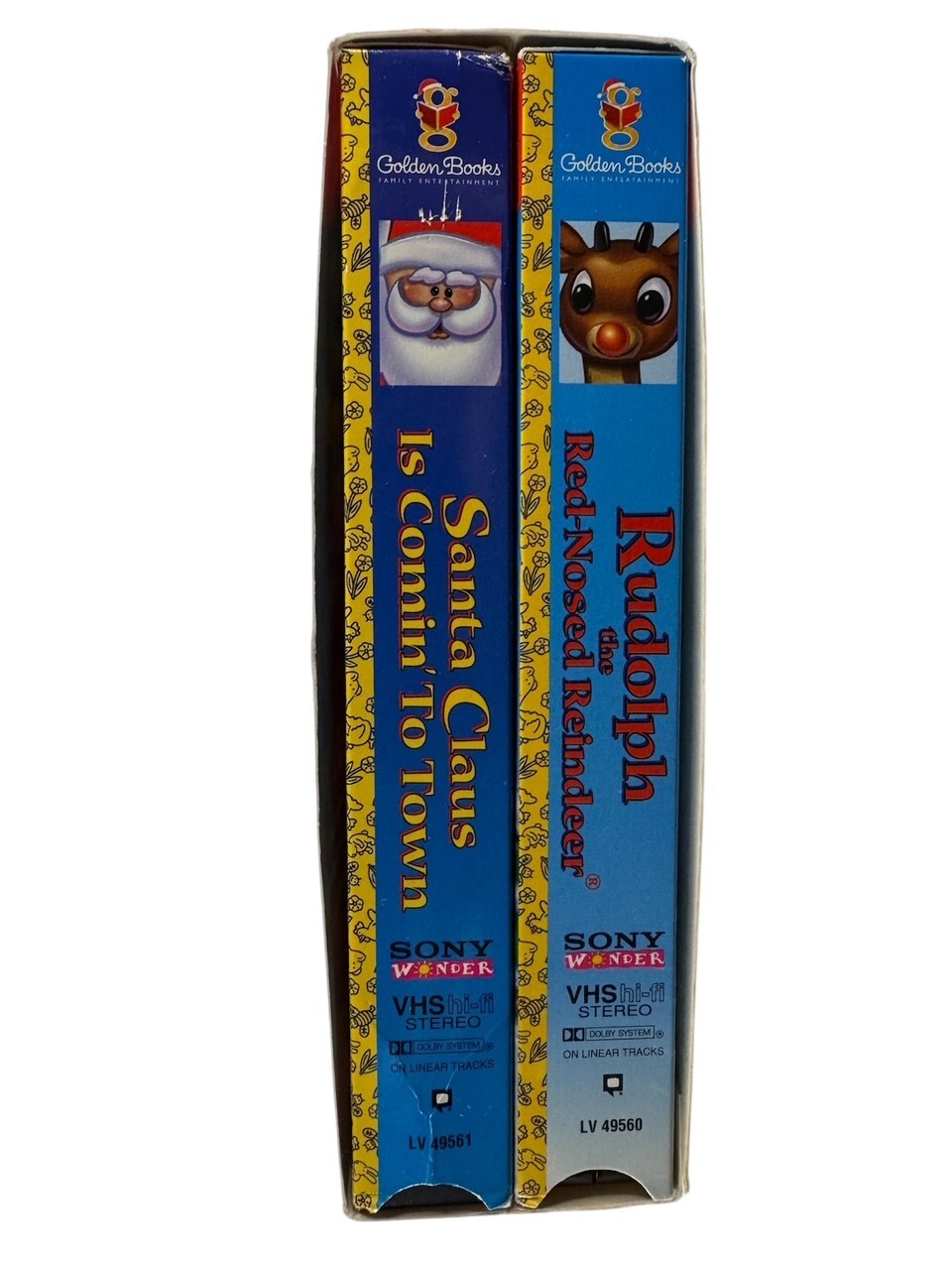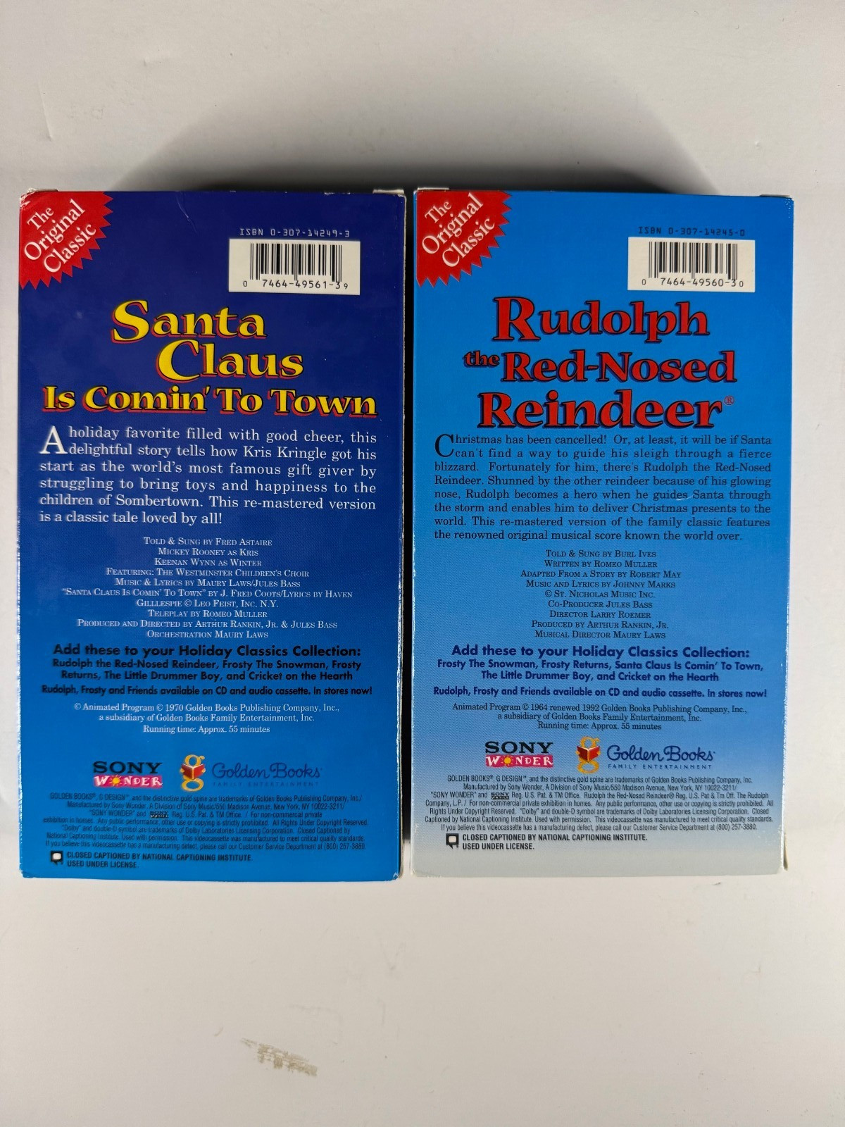 Delve into the holiday spirit with this delightful VHS lot, featuring the beloved classics "Santa Claus is Coming to Town" and "Rudolph the Red-Nosed Reindeer." Golden Books Studio brings these treasured stories to life with the warmth of Burl Ives' narration and the enchantment of animation that captures the hearts of all ages. The set is a timeless addition to any family's festive movie night. This set is a testament to the charm of classic animation and the enduring appeal of heartwarming holiday tales. Enjoy the simplicity of a bygone era with this English-language, G-rated collection, perfect for those who cherish the magic of Christmas. Relive the joy and wonder of these iconic stories with every viewing.